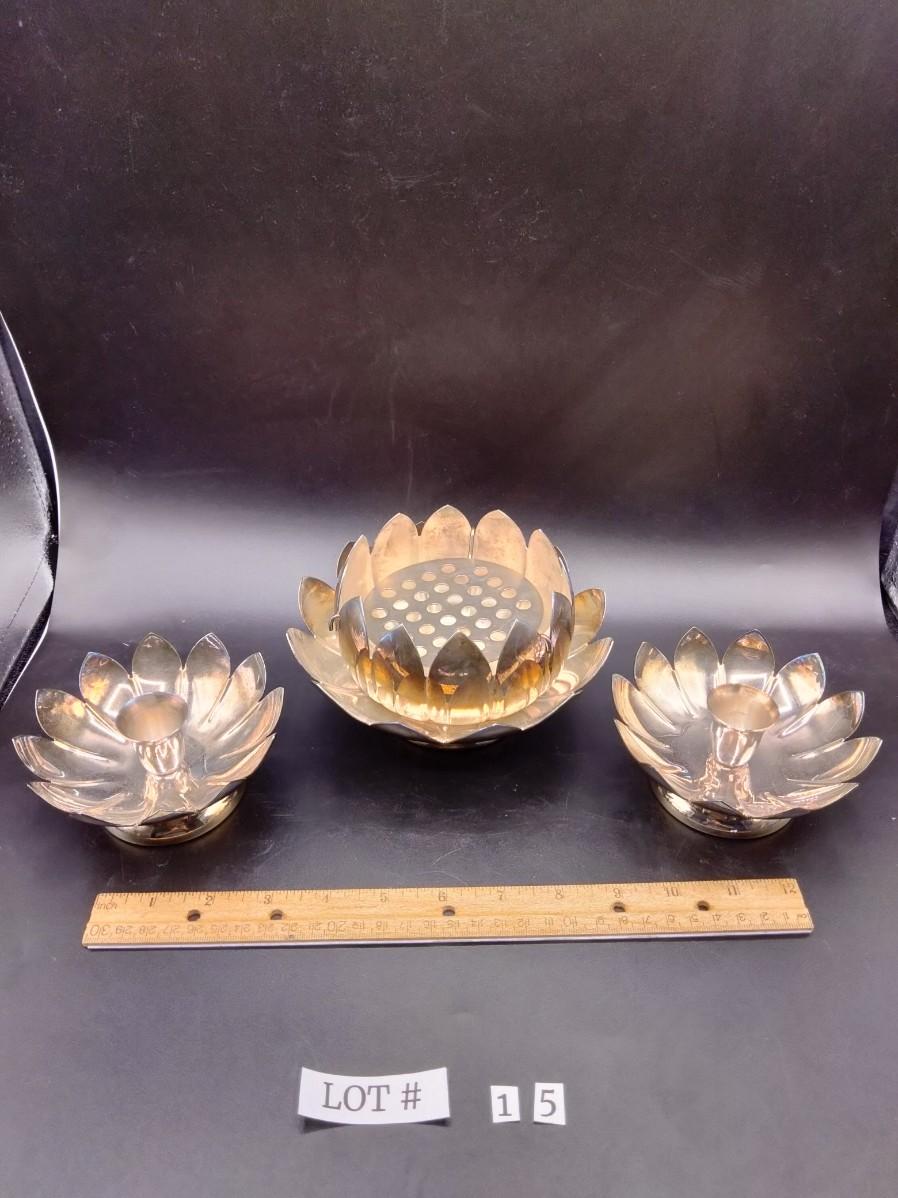 signed reed and barton silverplate set. Center lotus is a floral frog and 2 matching candlesticks