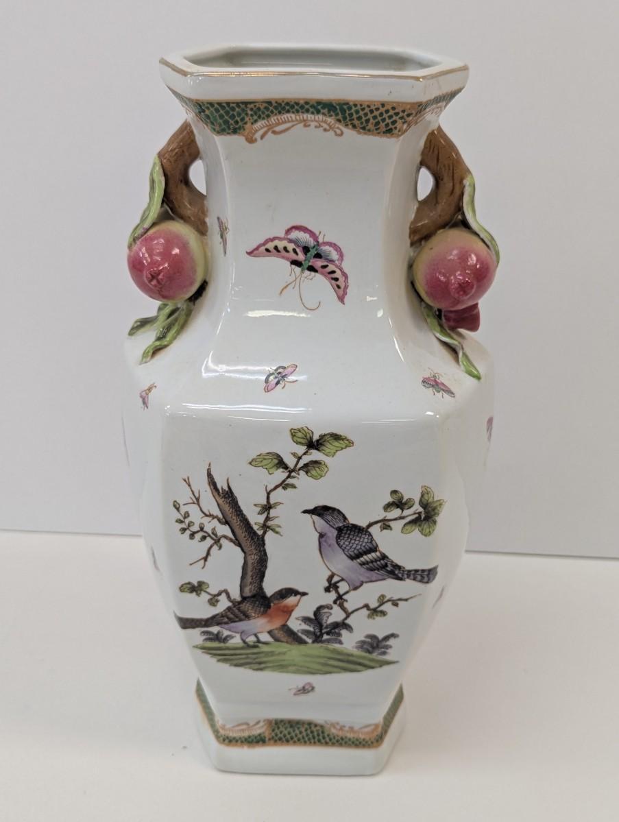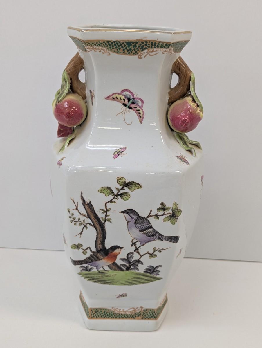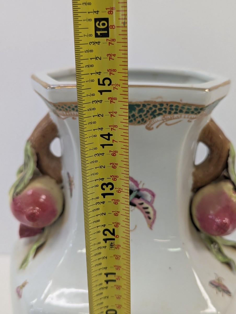 15" Tall Fine Chinese Porcelain Vase With Butterflies Birds & Pomegranate Fruit Handles