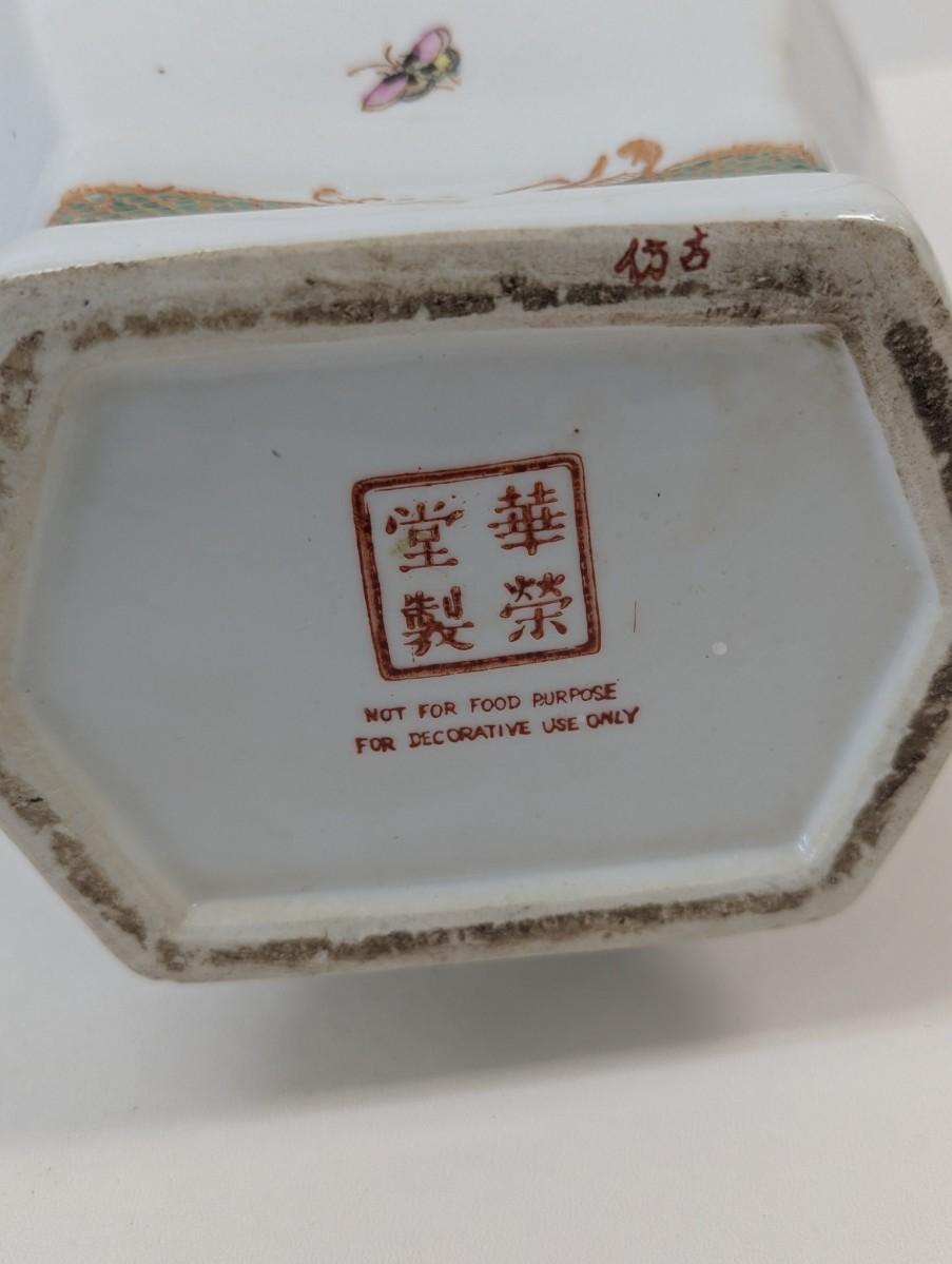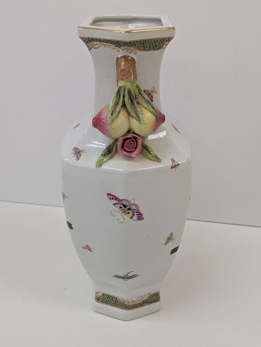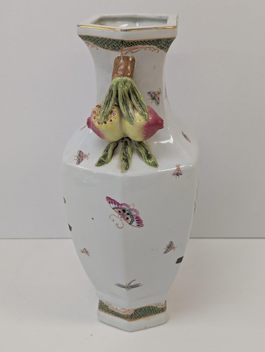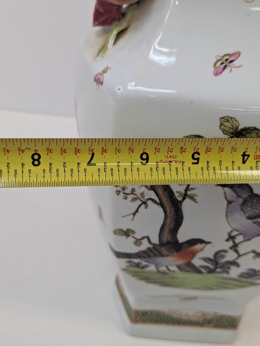 15" Tall Fine Chinese Porcelain Vase With Butterflies Birds & Pomegranate Fruit Handles