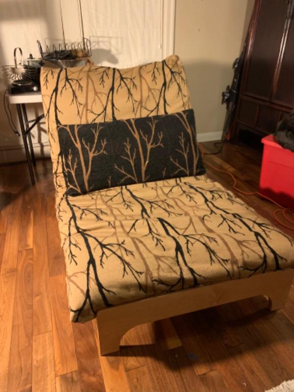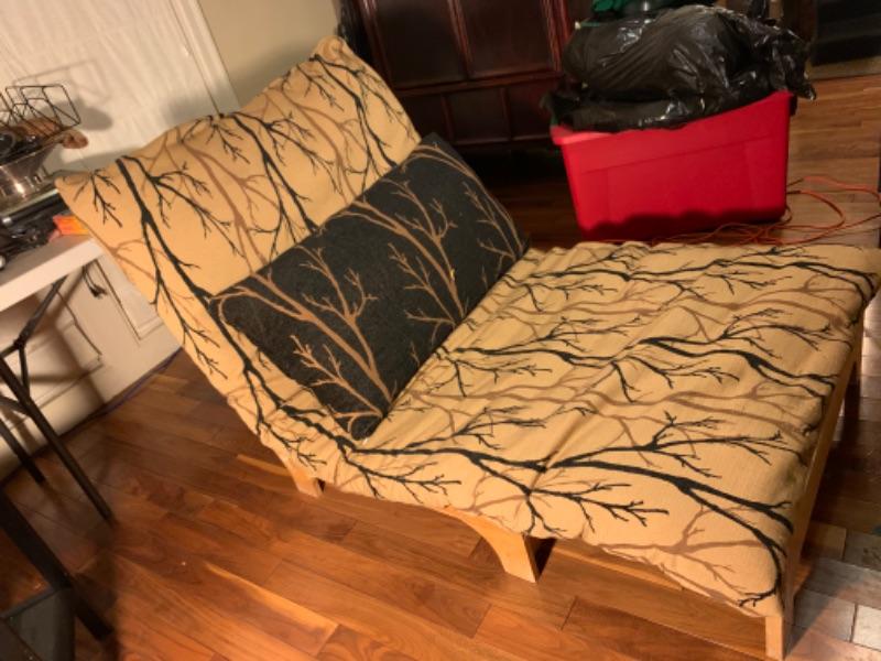 Twin Futon Frame With Futon and Cushion. 37” x 78” laid out. Cover is removable. Bottom half slides under to turn into chair. Was $95