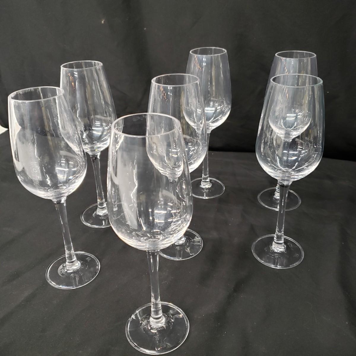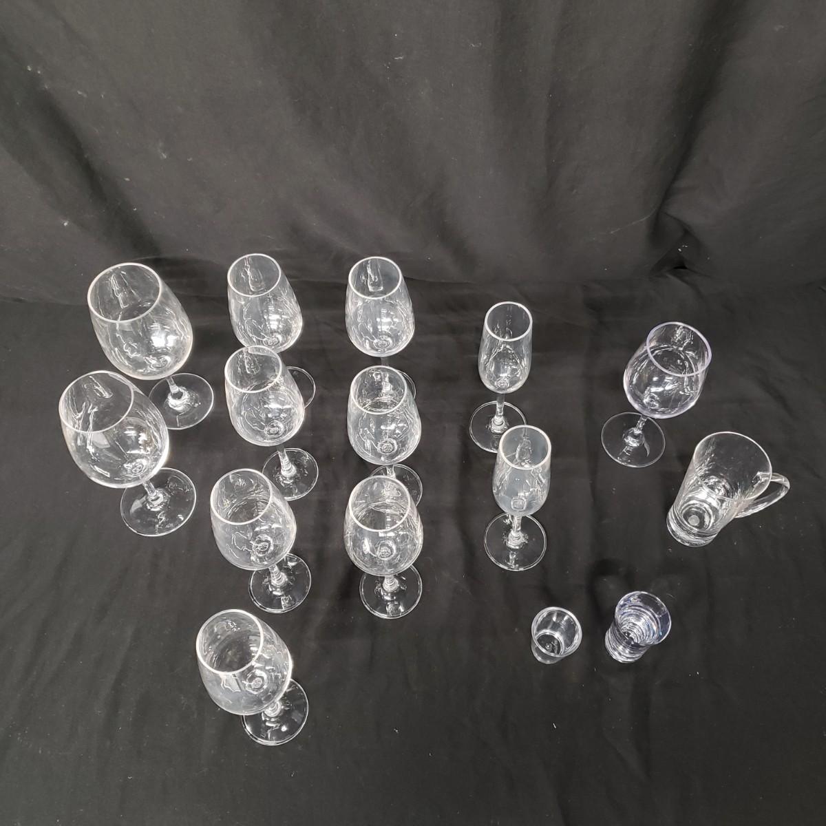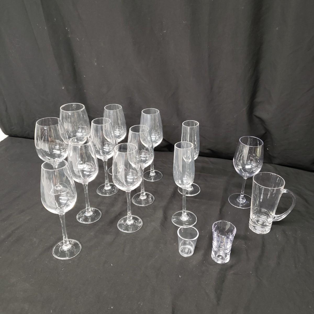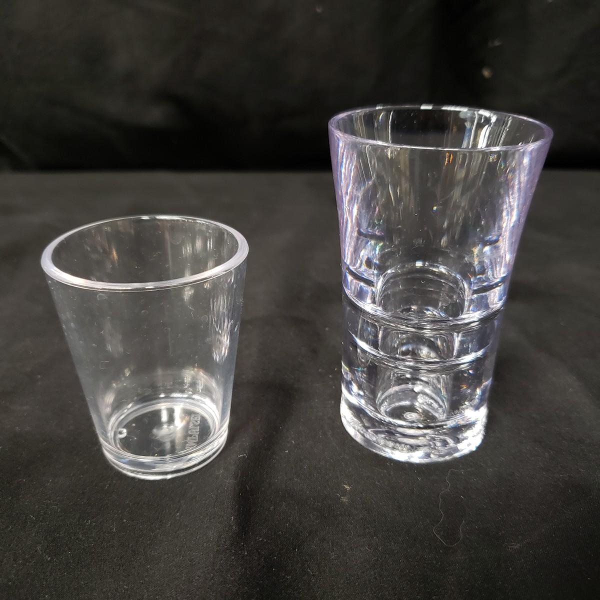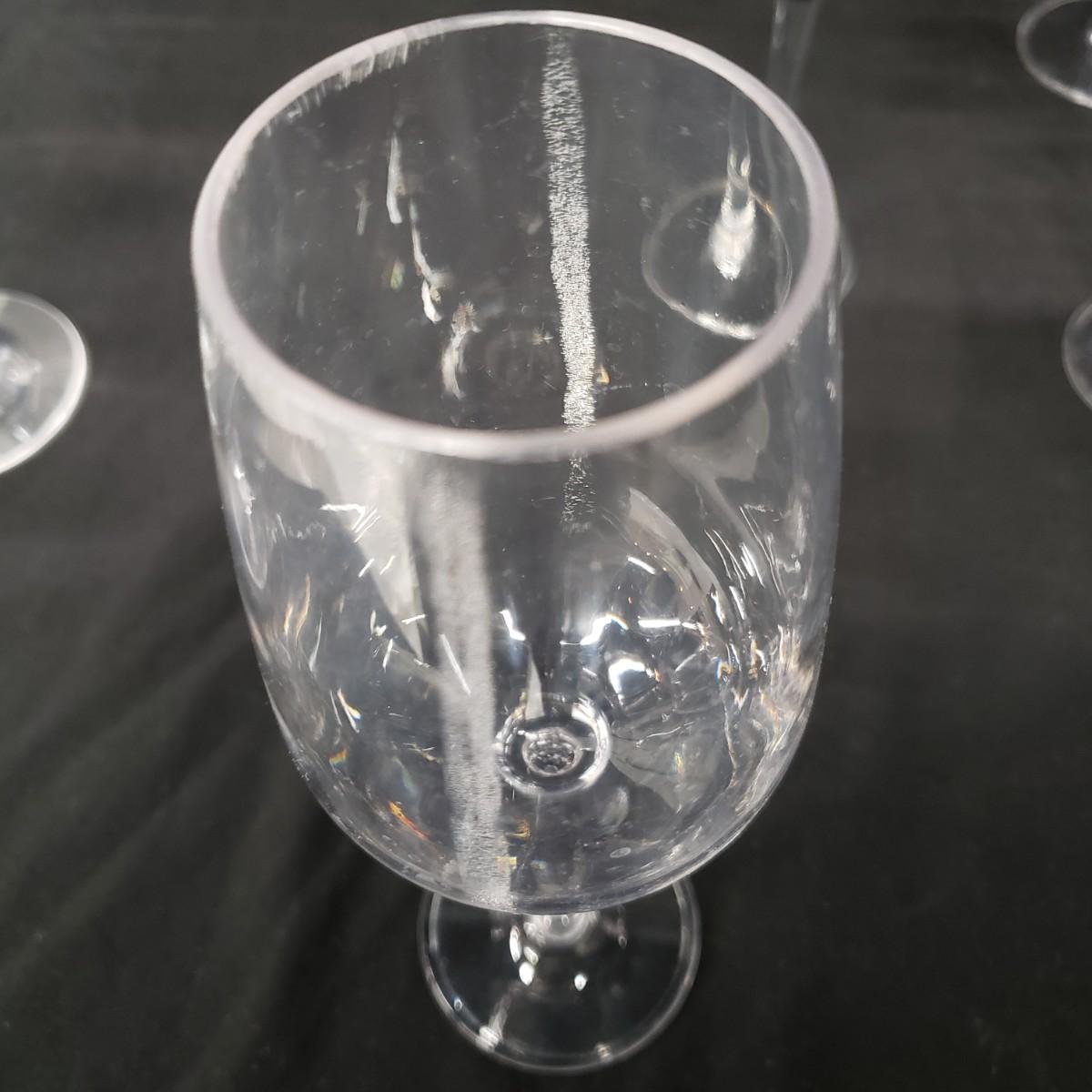 This lot has a total of 15 pieces of all plastic wear. There are 2 large wine glasses (3"x3"x9"), 7 medium sized wine glasses (2"x2.5"x9"), 2 champagne flutes (2"x3"x9"), 1 beer mug (2"x3"x6"), 1 smaller wine glass (3"x2"x8") and two shot glasses. All but one appear to be in good condition. One medium glass has 2 stripes on it, see picture. Shipping available.