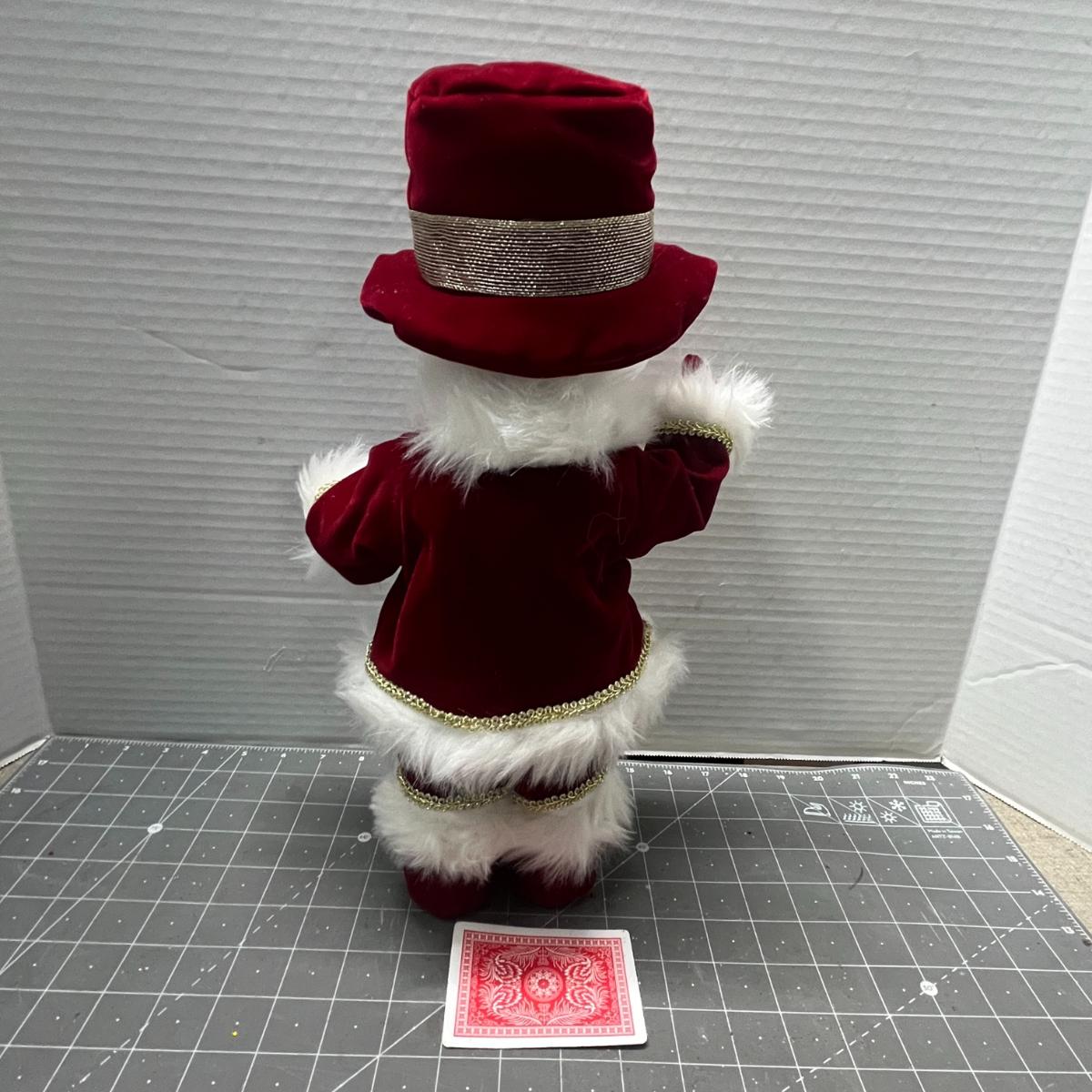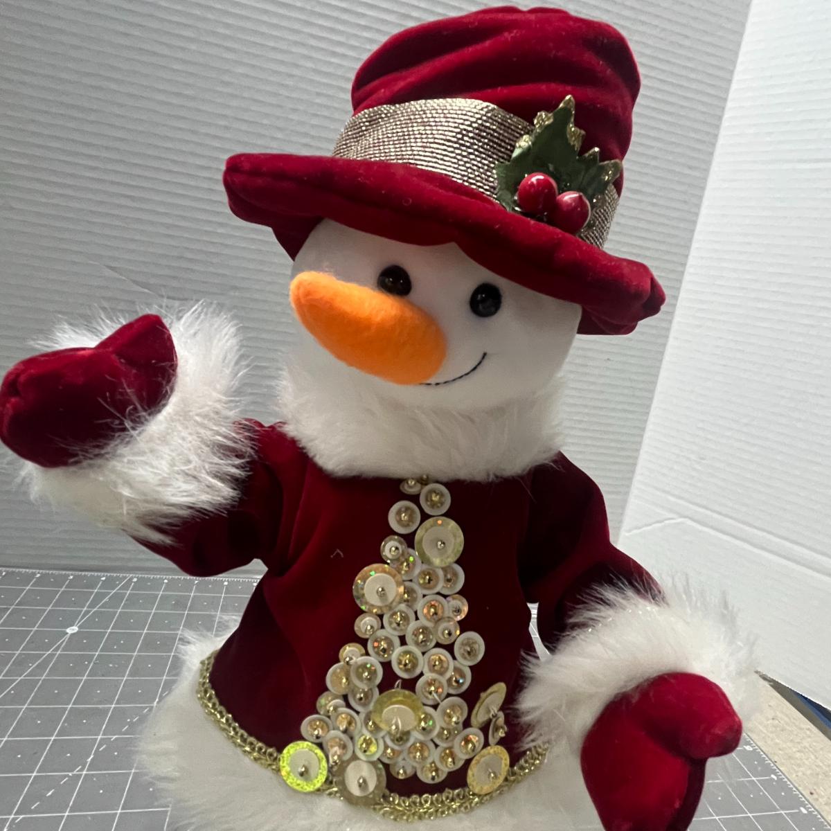 Red outfit, gold ribbon, pearls, holly hat trim.