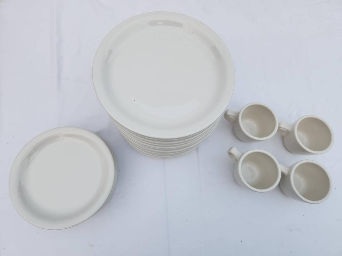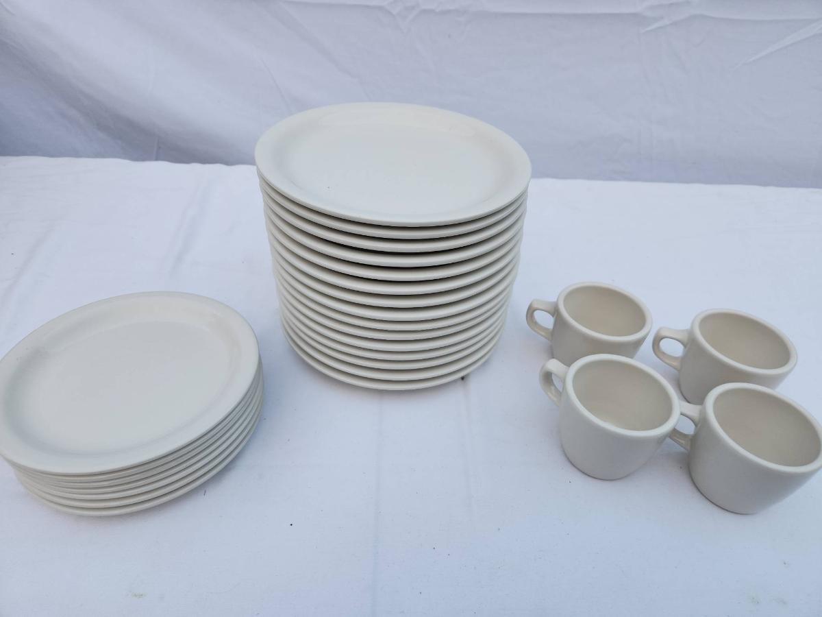 15 White Ceramic Dishes, 7 Saucers, and 4 Coffee Cups
