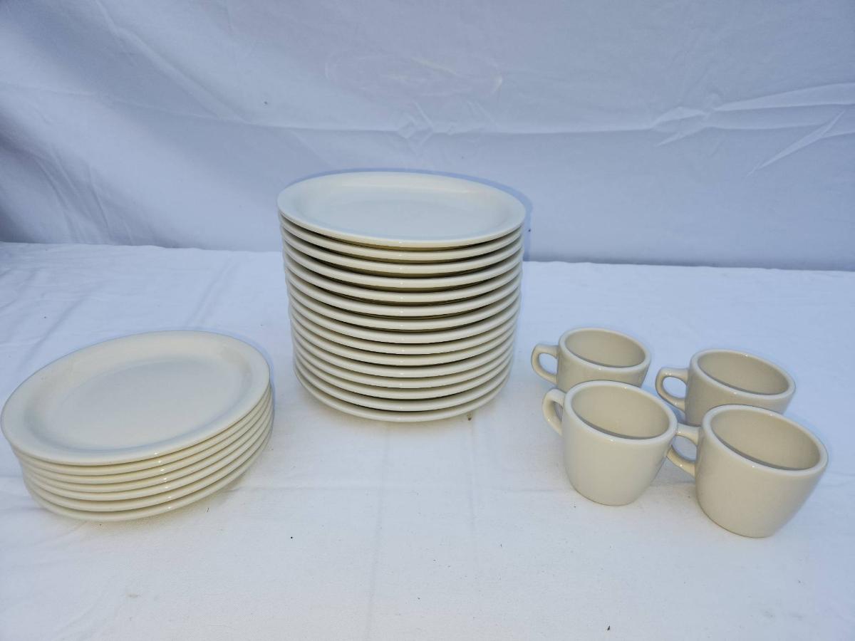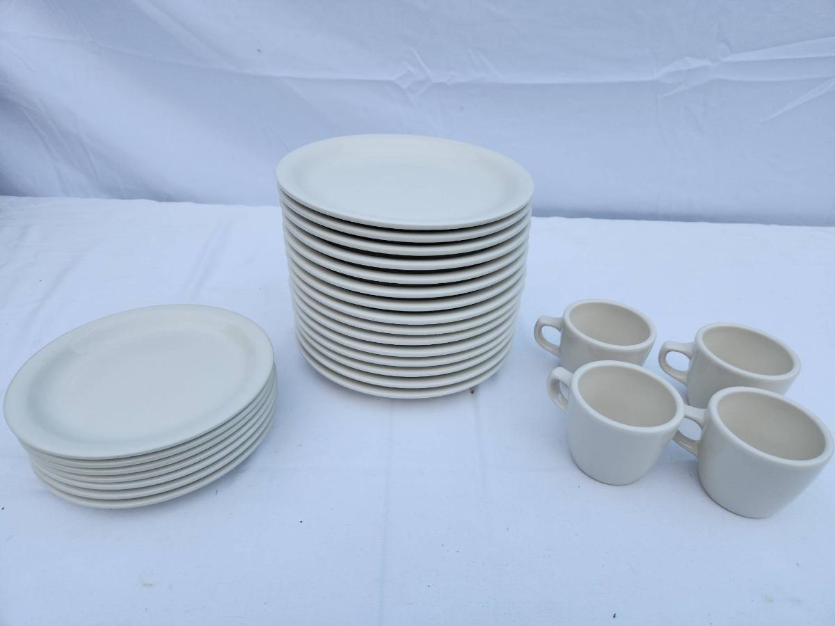 15 White Ceramic Restaurant Dishes and 4 Coffee Cups