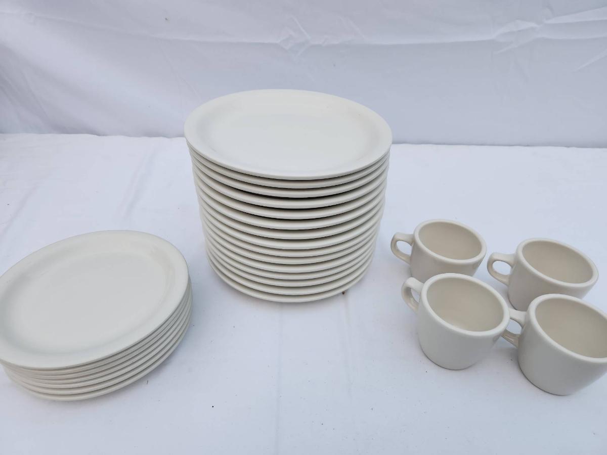 15 White Ceramic Restaurant-Style Plates, 7 Saucers, and 4 Coffee Cups