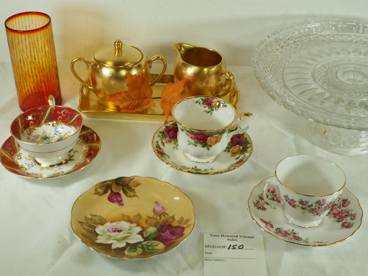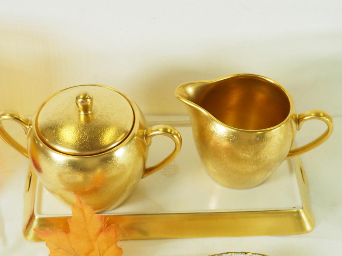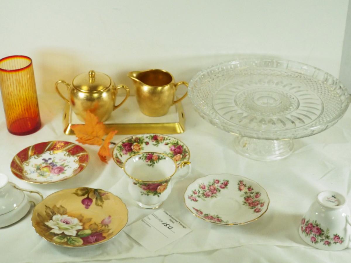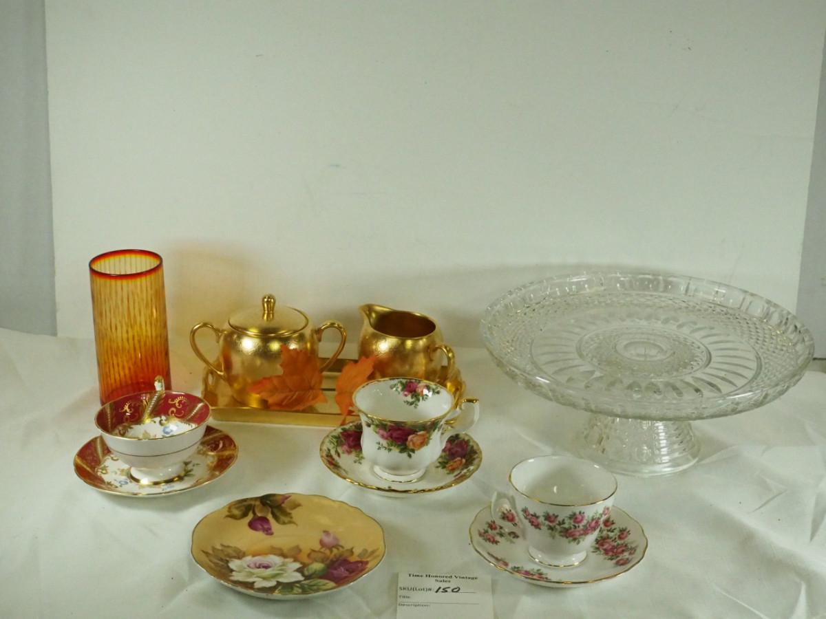 150- Antique bone china, 2 piece depression glass cake tray. 24K gold tray with sugar bowl and pitcher.