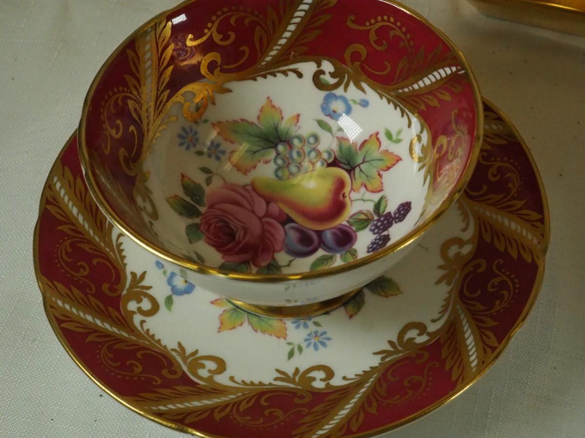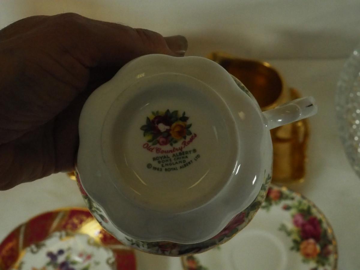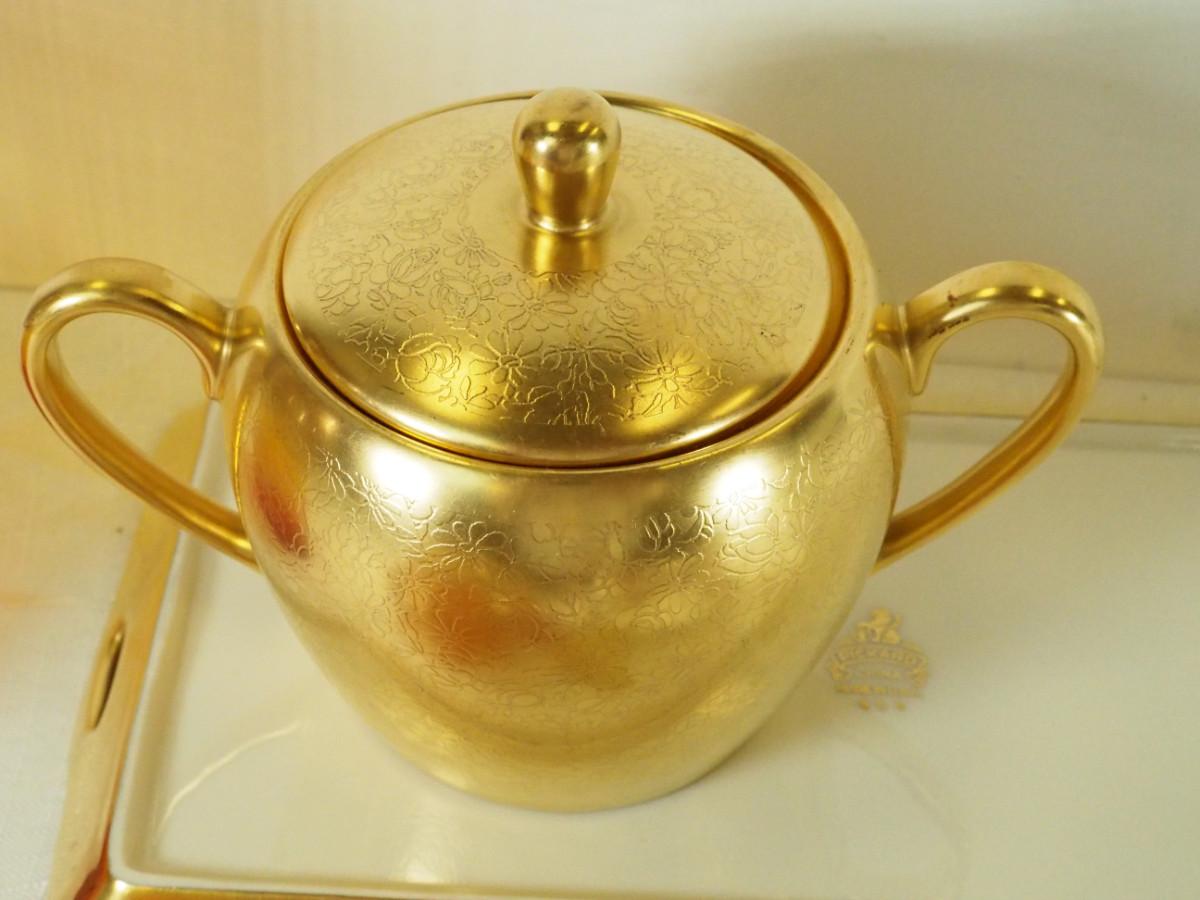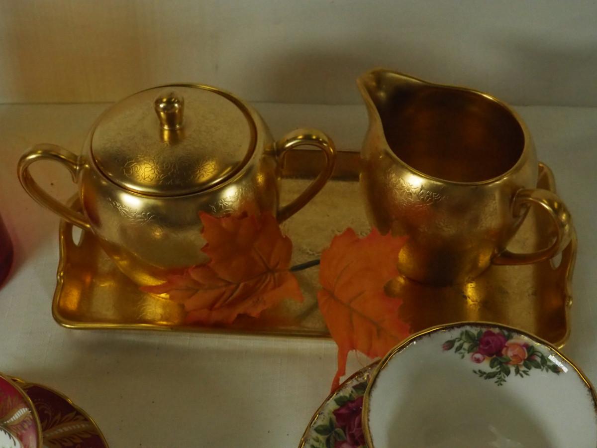 150- Antique bone china, 2 piece depression glass cake tray. 24K gold tray with sugar bowl and pitcher.