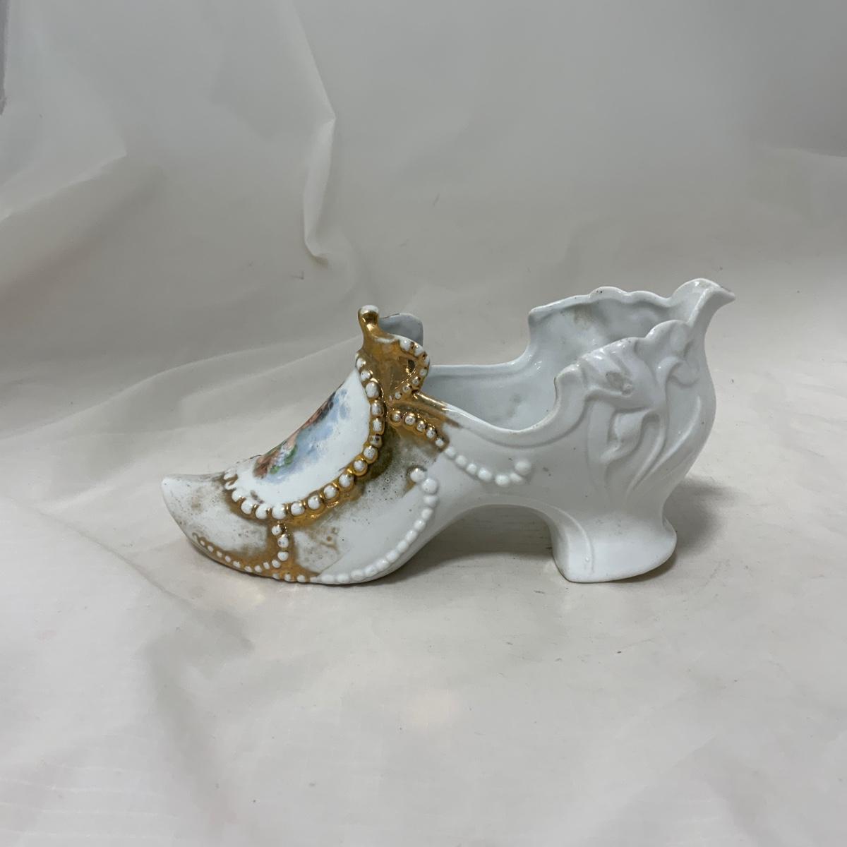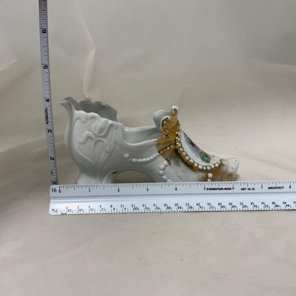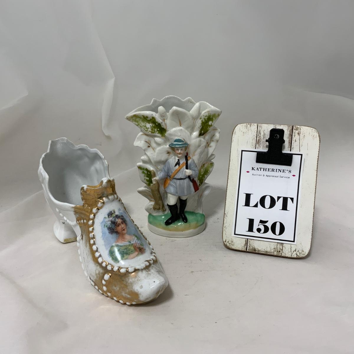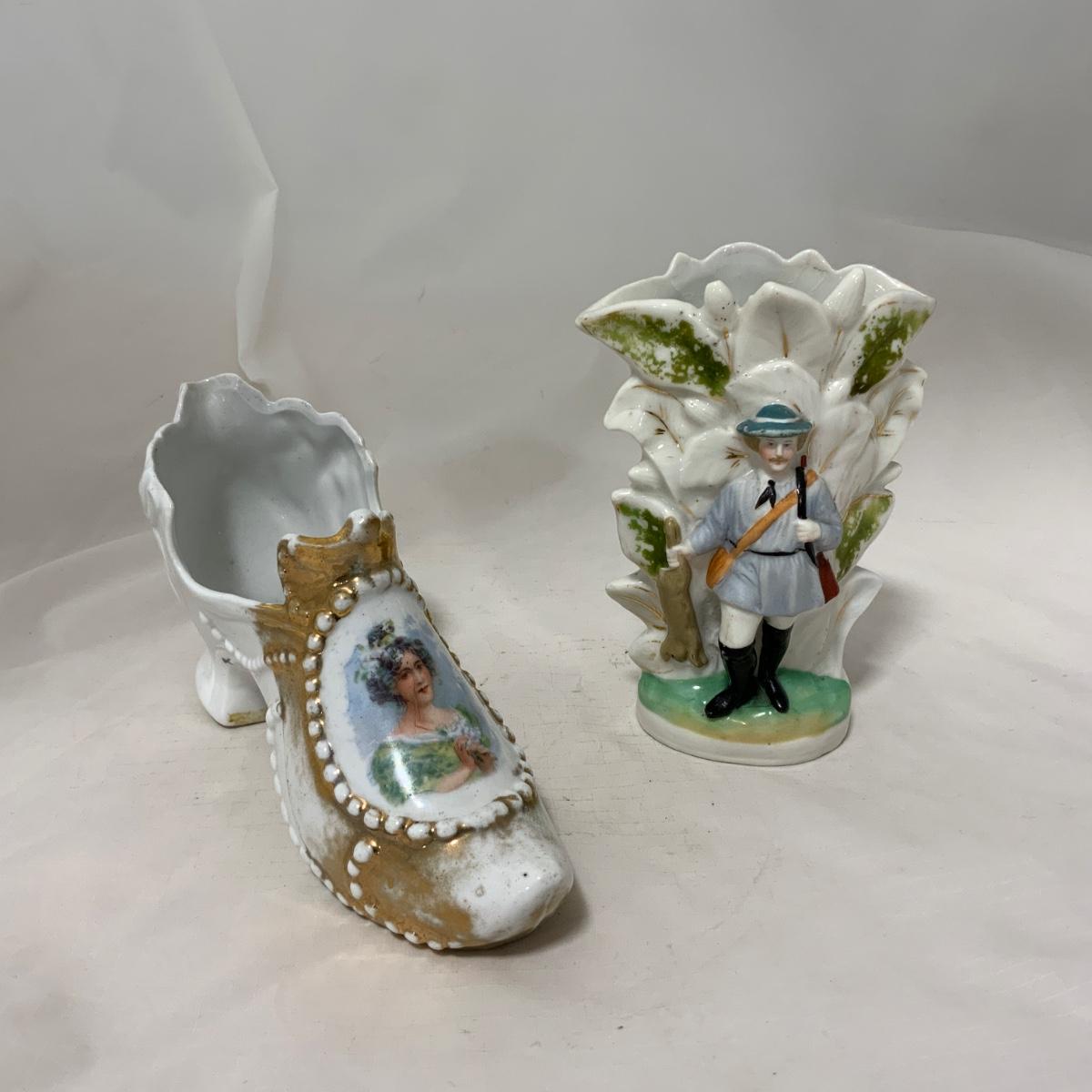 Two fun pieces! The Character Vase shows someone very proud of hunting and the German Shoe is quite elegant. The vase is older than the shoe, circa 1860. The shoe is right before the turn of the century, 1890. Please see photos for details and condition. ::: Shipping is available on this lot. If you require shipping you must let us know at the close of the auction. We will coordinate with you after the item has been won. Shipping fees will include insurance up to or exceeding the value of all items being mailed. If you have any questions regarding this lot please contact the auctioneer either via this website, by direct email or by phone. PICK UP TIMES and other important information can be found in the TERMS and DESCRIPTION of the auction. Please take a look for pertinent information. Thanks!