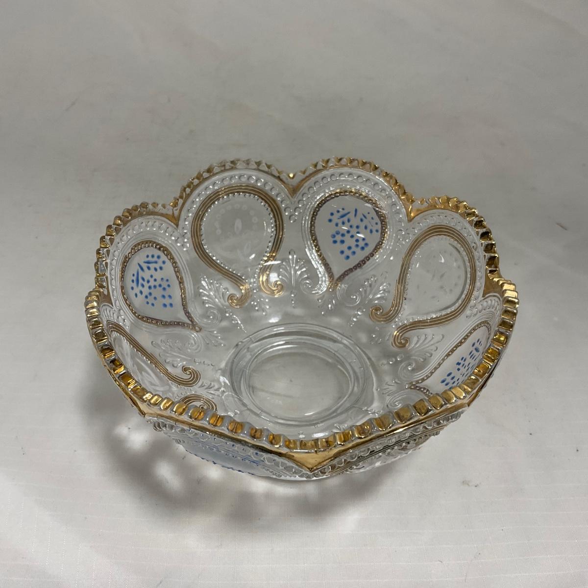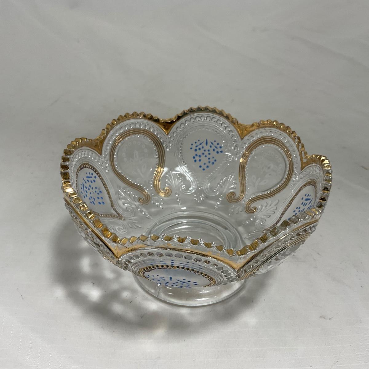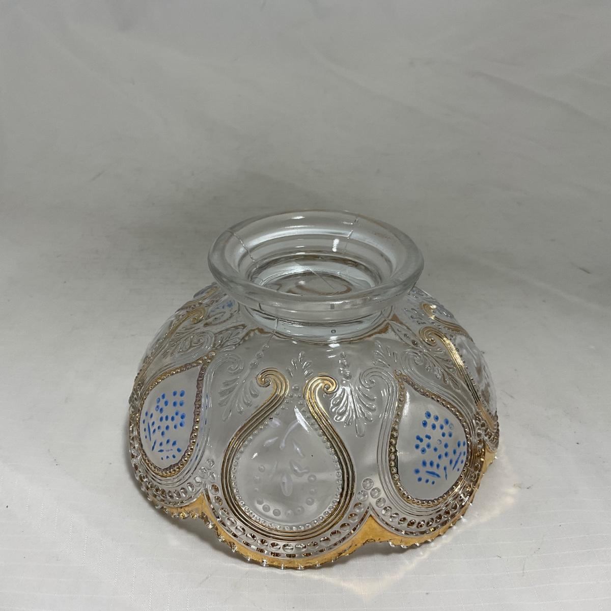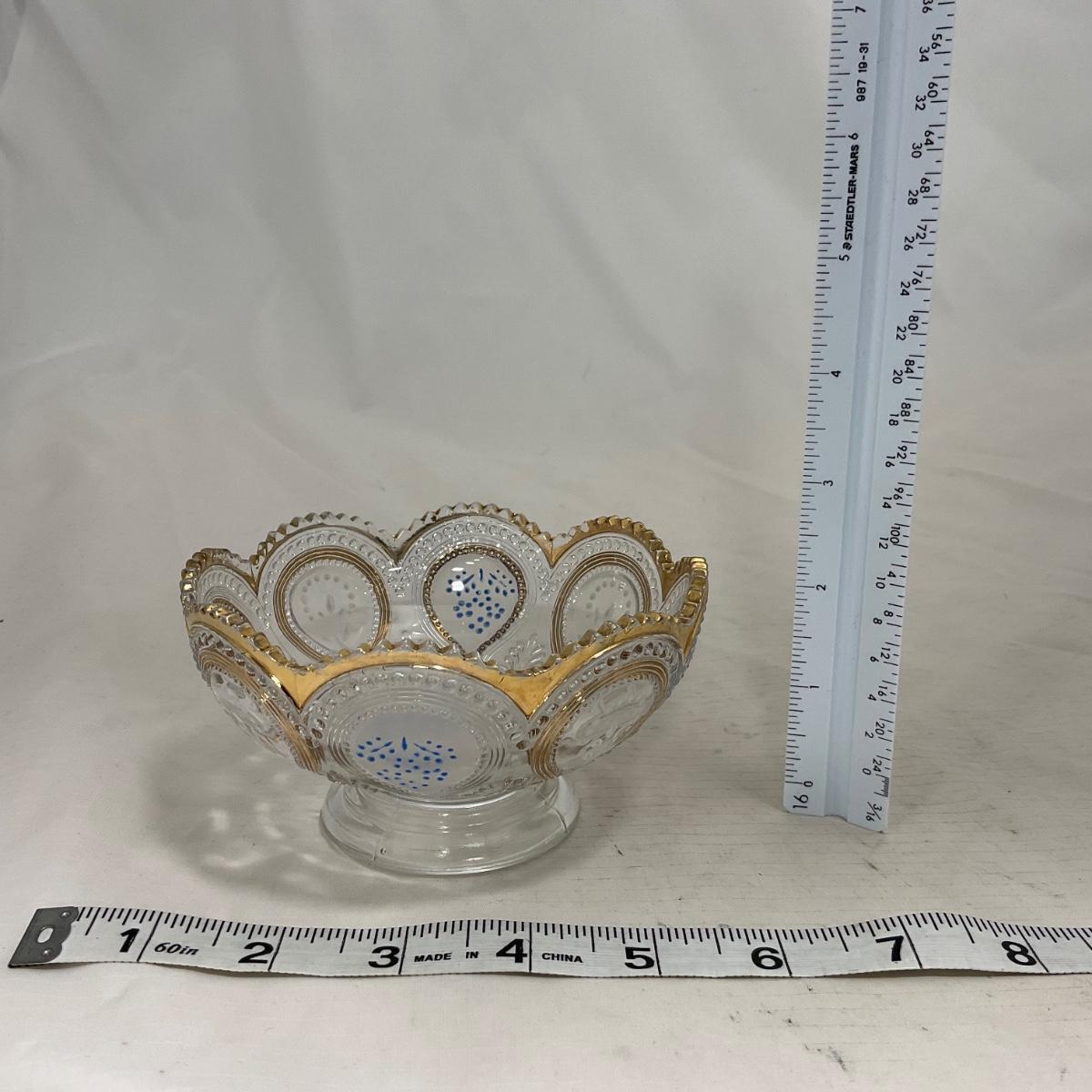 One clear dish with gold accents and blue dot work. No marking but in beautiful shape. The perfect small dish for candy during the holidays. Please see photos for details and condition. ::: Shipping is available on this lot. If you require shipping you must let us know at the close of the auction. We will coordinate with you after the item has been won. Shipping fees will include insurance up to or exceeding the value of all items being mailed. If you have any questions regarding this lot please contact the auctioneer either via this website, by direct email or by phone. PICK UP TIMES and other important information can be found in the TERMS and DESCRIPTION of the auction. Please take a look for pertinent information. Thanks!