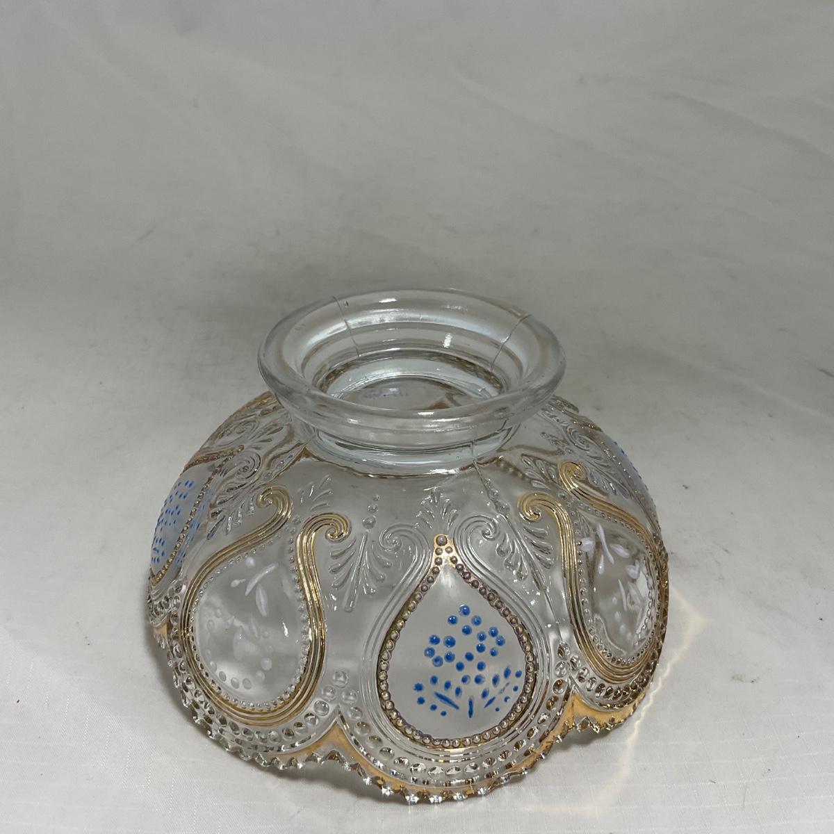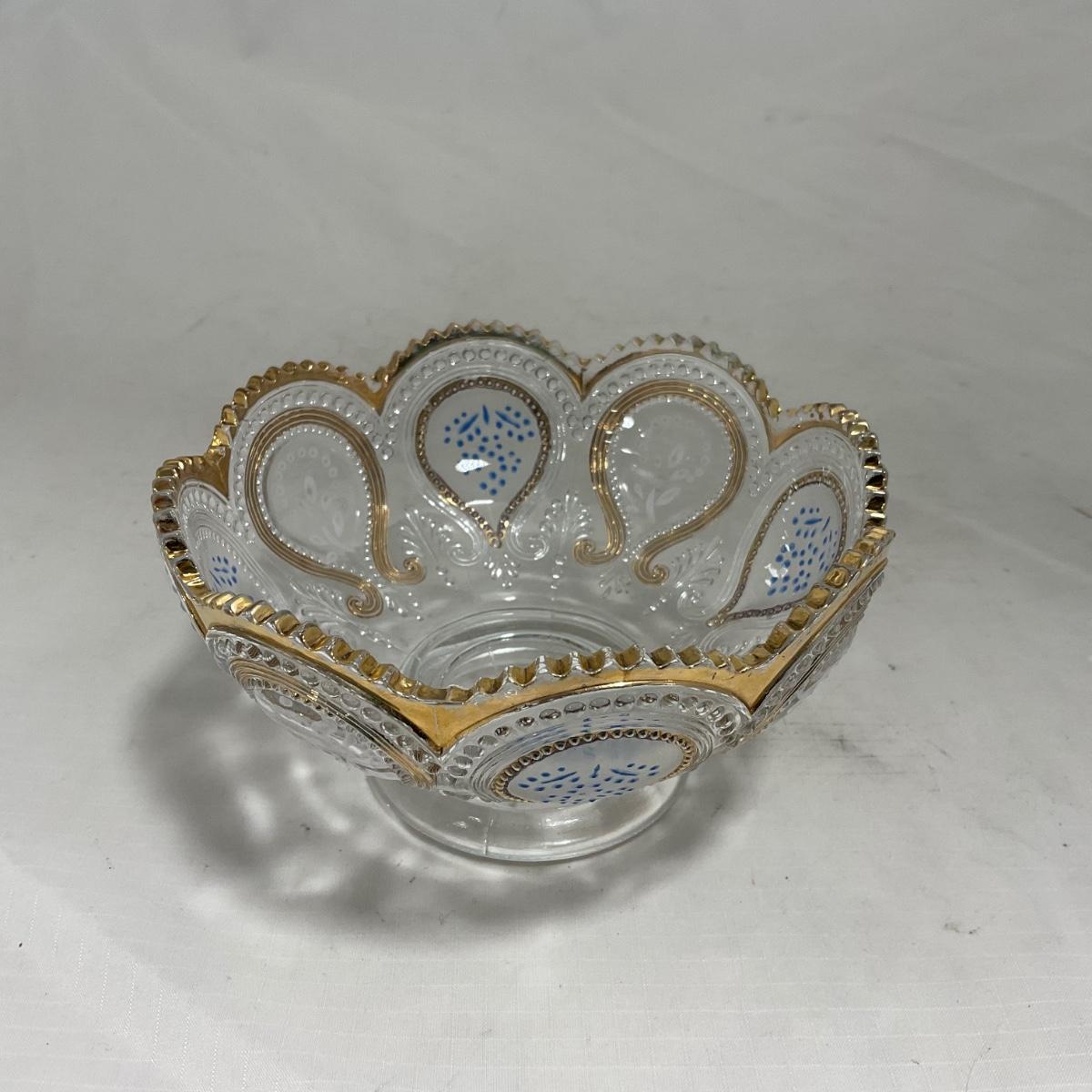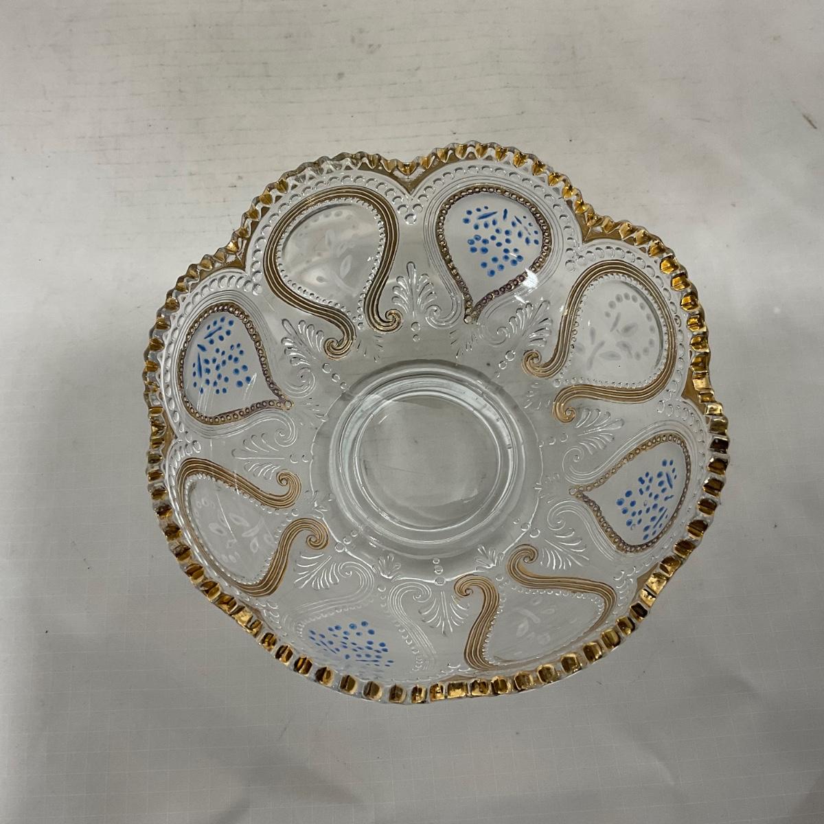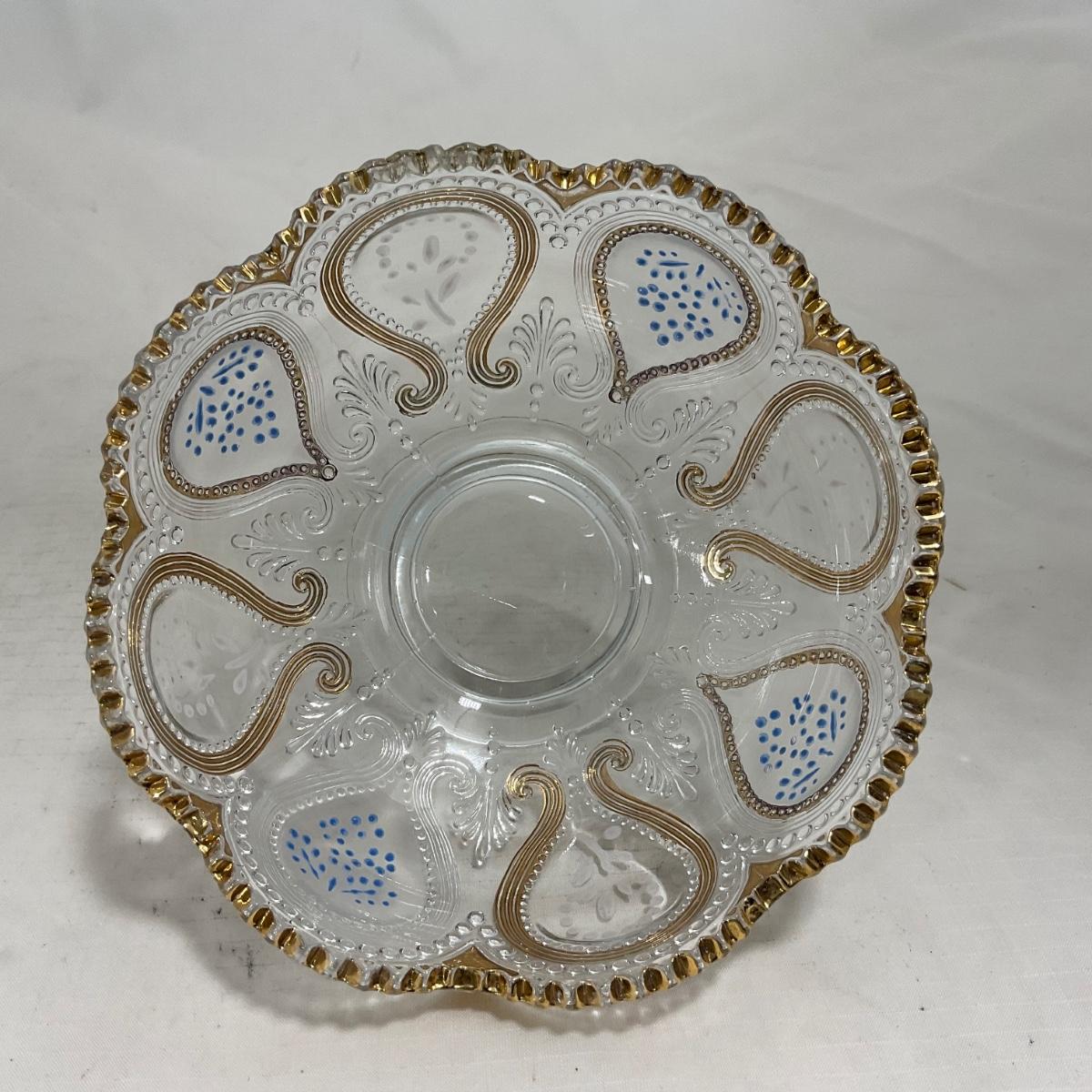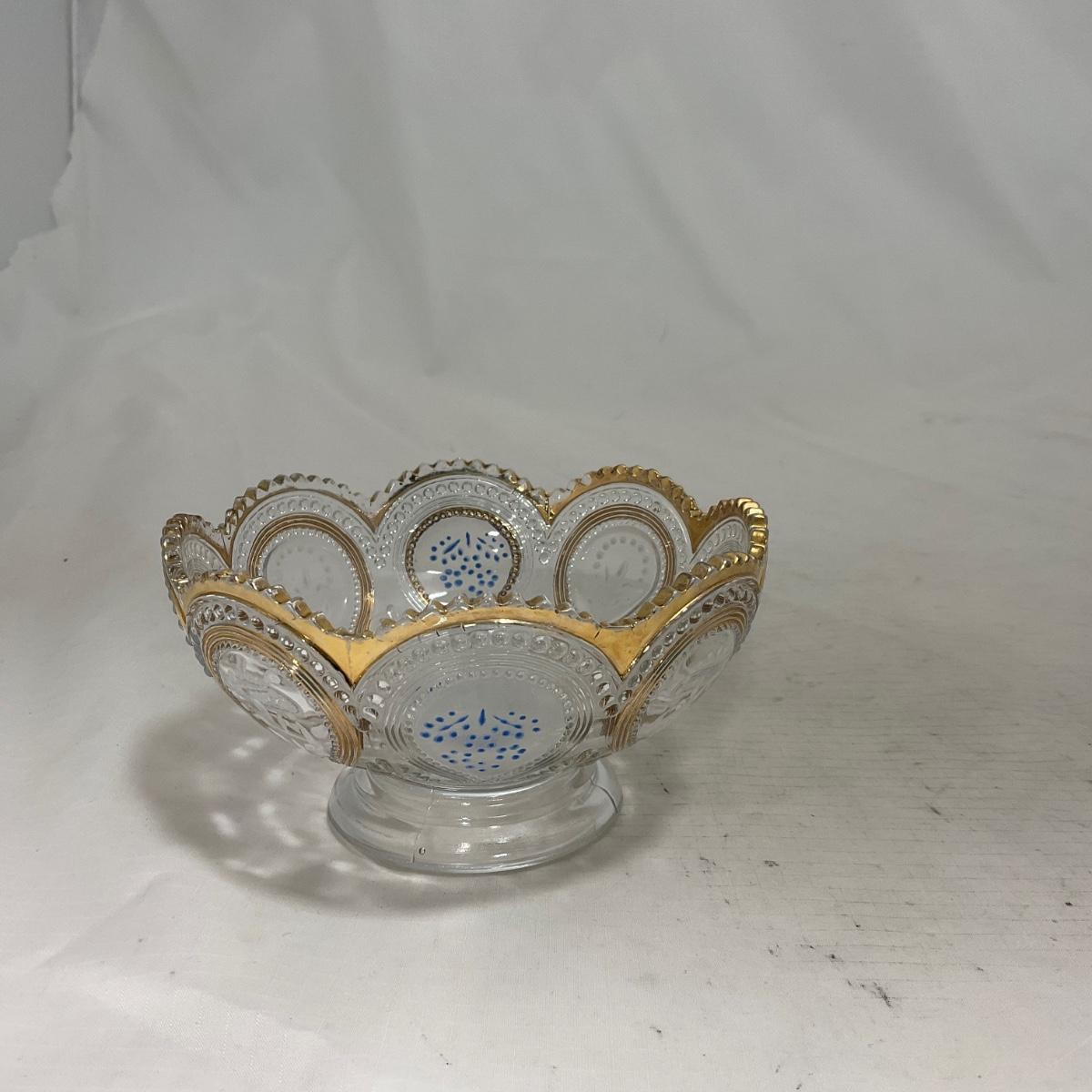 One clear dish with gold accents and blue dot work. No marking but in beautiful shape. The perfect small dish for candy during the holidays. Please see photos for details and condition. ::: Shipping is available on this lot. If you require shipping you must let us know at the close of the auction. We will coordinate with you after the item has been won. Shipping fees will include insurance up to or exceeding the value of all items being mailed. If you have any questions regarding this lot please contact the auctioneer either via this website, by direct email or by phone. PICK UP TIMES and other important information can be found in the TERMS and DESCRIPTION of the auction. Please take a look for pertinent information. Thanks!