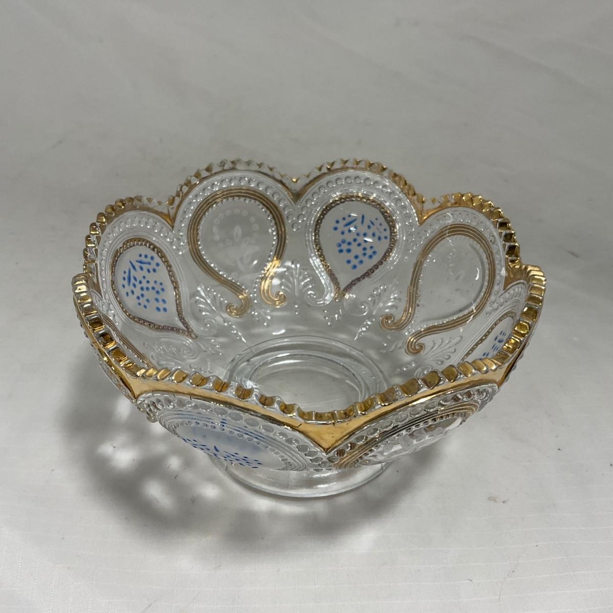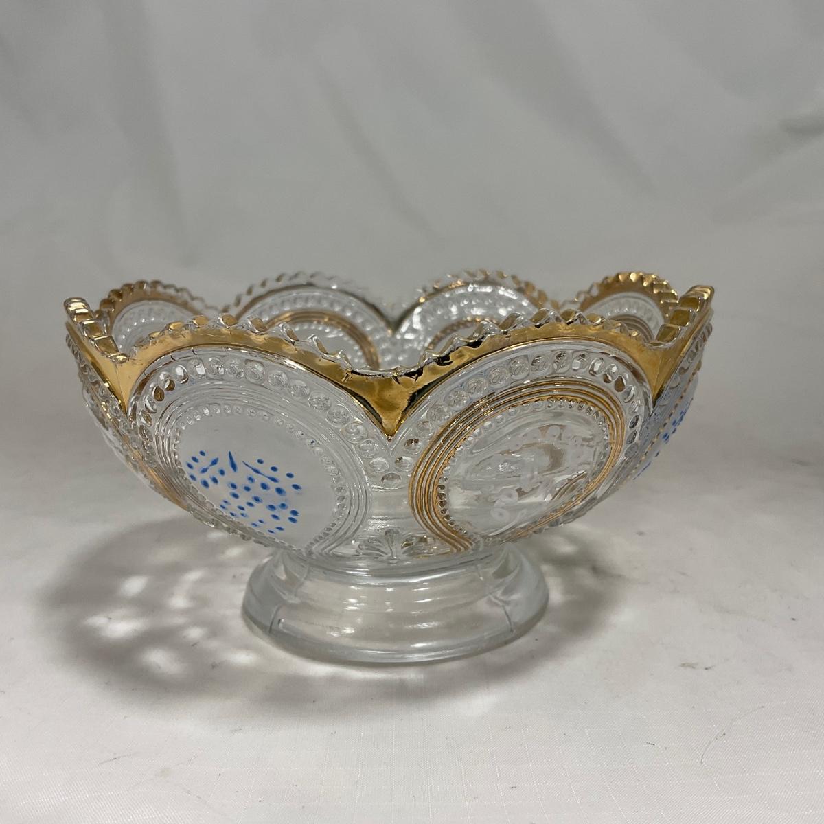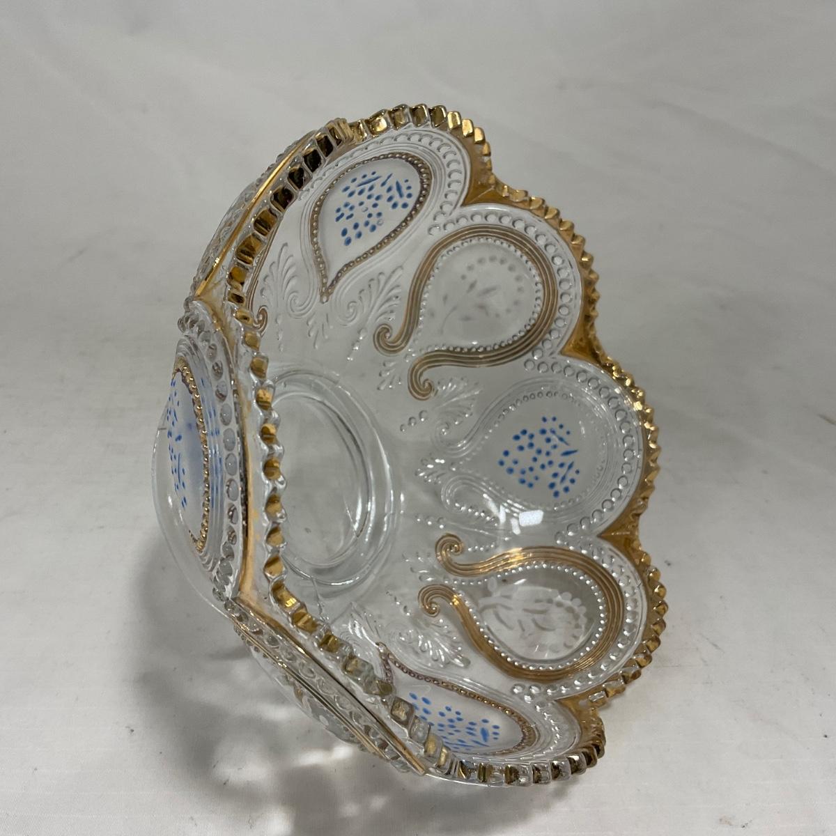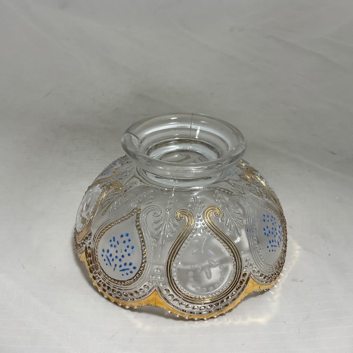 One clear dish with gold accents and blue dot work. No marking but in beautiful shape. The perfect small dish for candy during the holidays. Please see photos for details and condition. ::: Shipping is available on this lot. If you require shipping you must let us know at the close of the auction. We will coordinate with you after the item has been won. Shipping fees will include insurance up to or exceeding the value of all items being mailed. If you have any questions regarding this lot please contact the auctioneer either via this website, by direct email or by phone. PICK UP TIMES and other important information can be found in the TERMS and DESCRIPTION of the auction. Please take a look for pertinent information. Thanks!