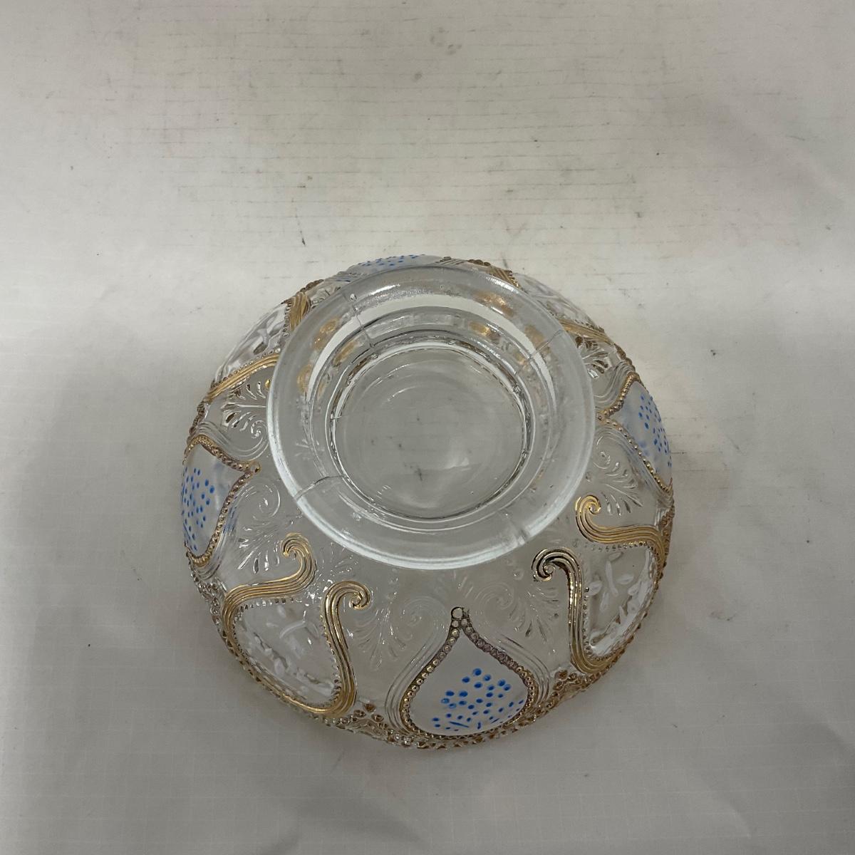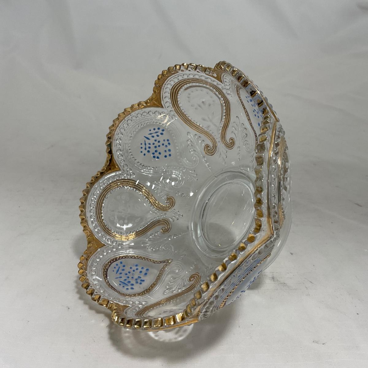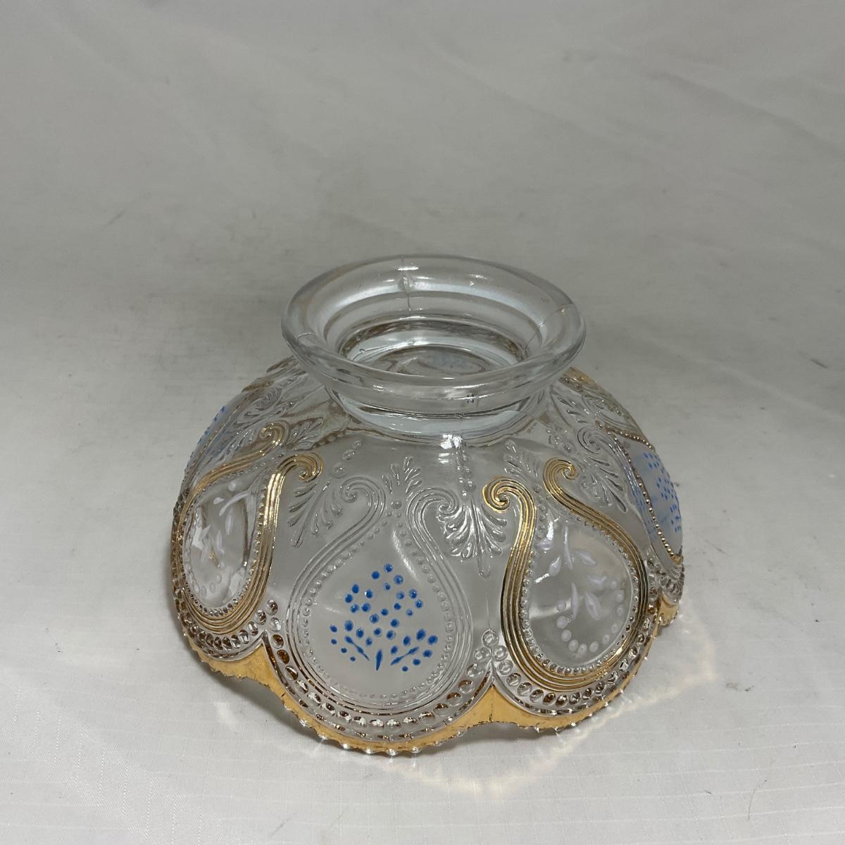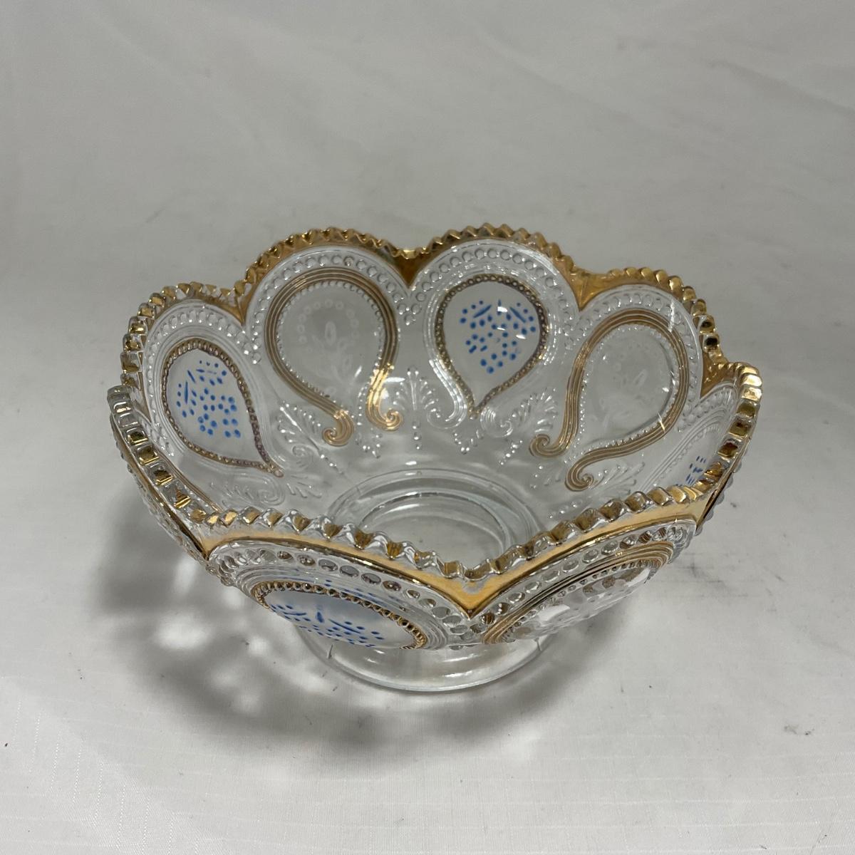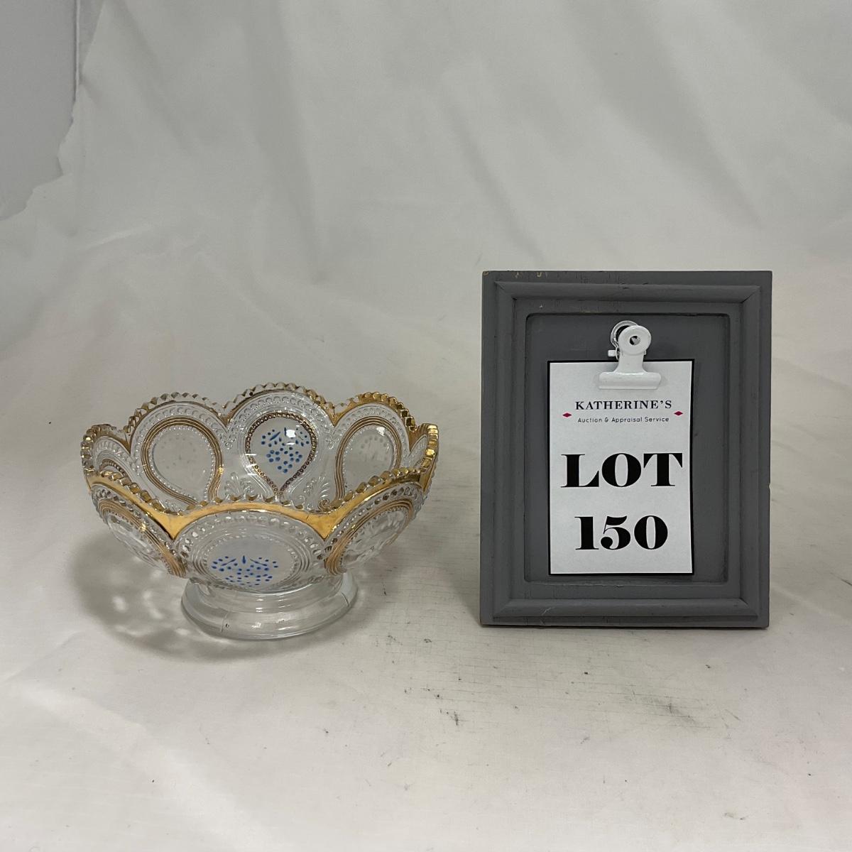 One clear dish with gold accents and blue dot work. No marking but in beautiful shape. The perfect small dish for candy during the holidays. Please see photos for details and condition. ::: Shipping is available on this lot. If you require shipping you must let us know at the close of the auction. We will coordinate with you after the item has been won. Shipping fees will include insurance up to or exceeding the value of all items being mailed. If you have any questions regarding this lot please contact the auctioneer either via this website, by direct email or by phone. PICK UP TIMES and other important information can be found in the TERMS and DESCRIPTION of the auction. Please take a look for pertinent information. Thanks!