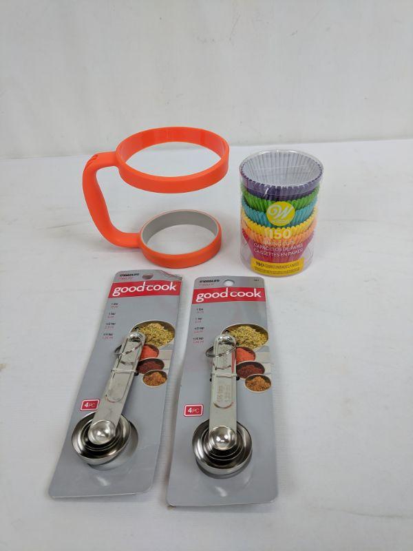 150 Colorful Wilton Baking Cups, 2 Sets Measuring Spoons, 1 Orange Grip-It 30 oz - New