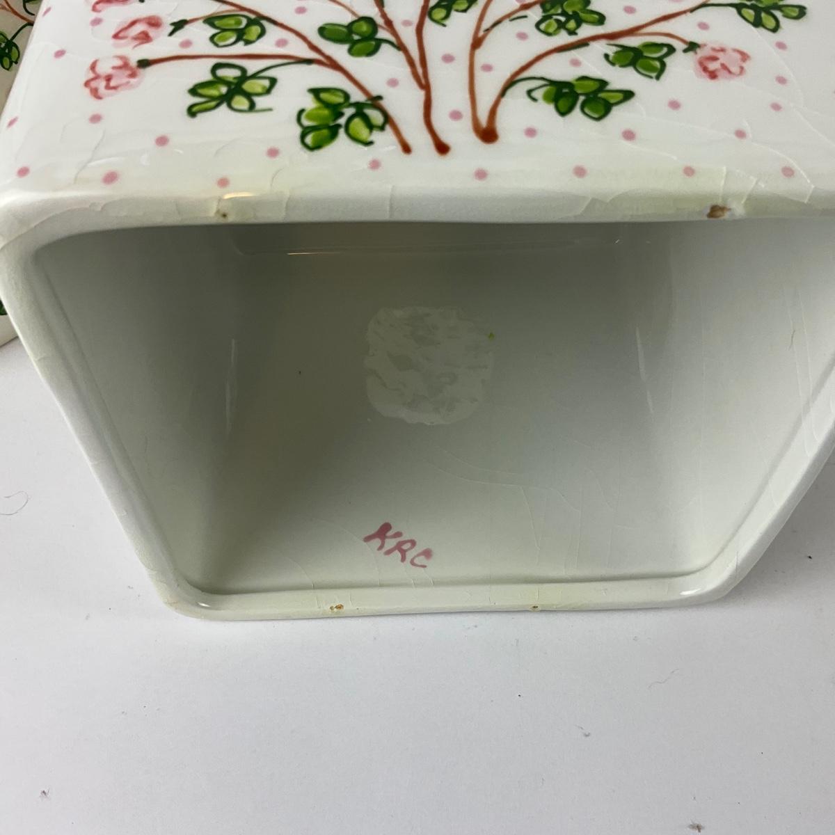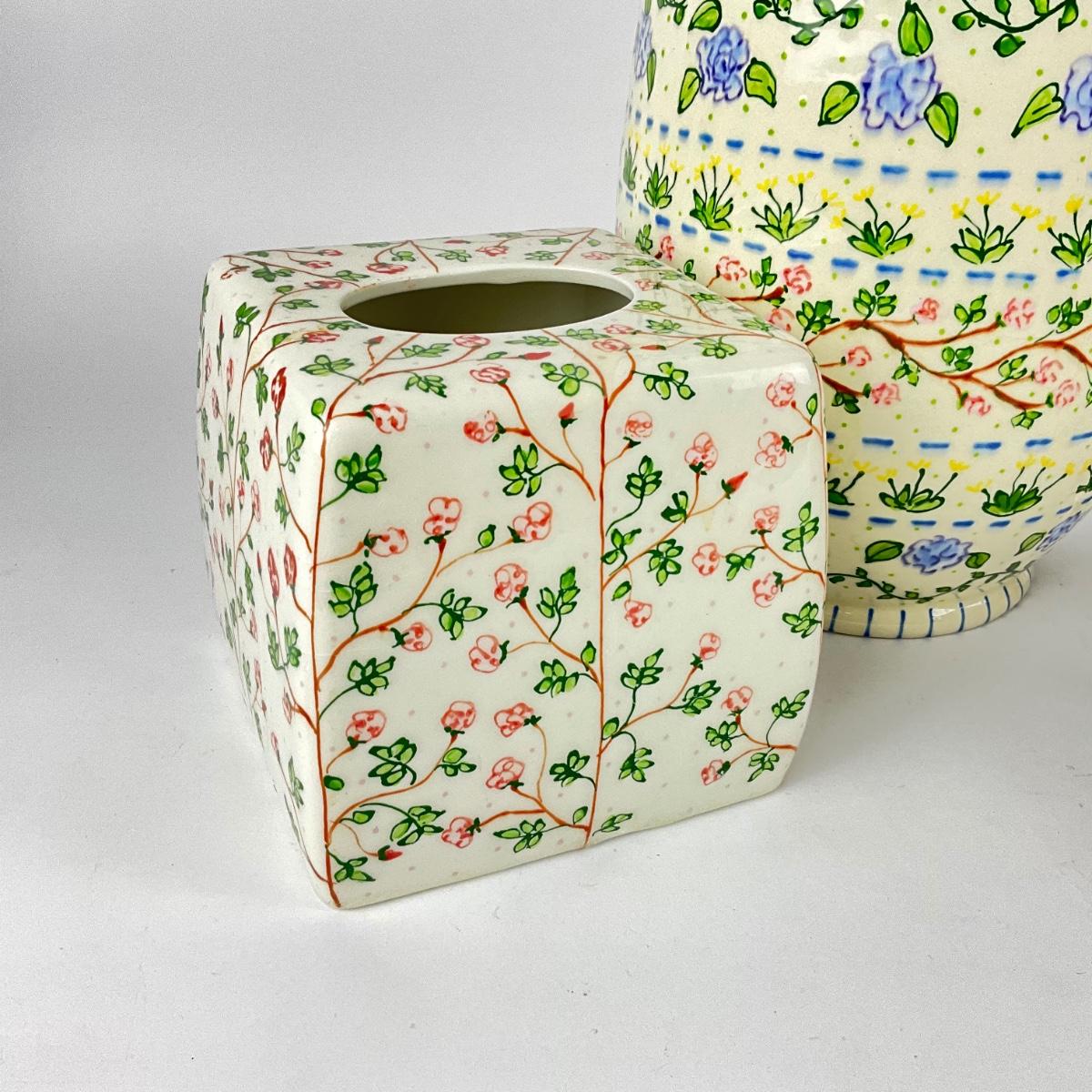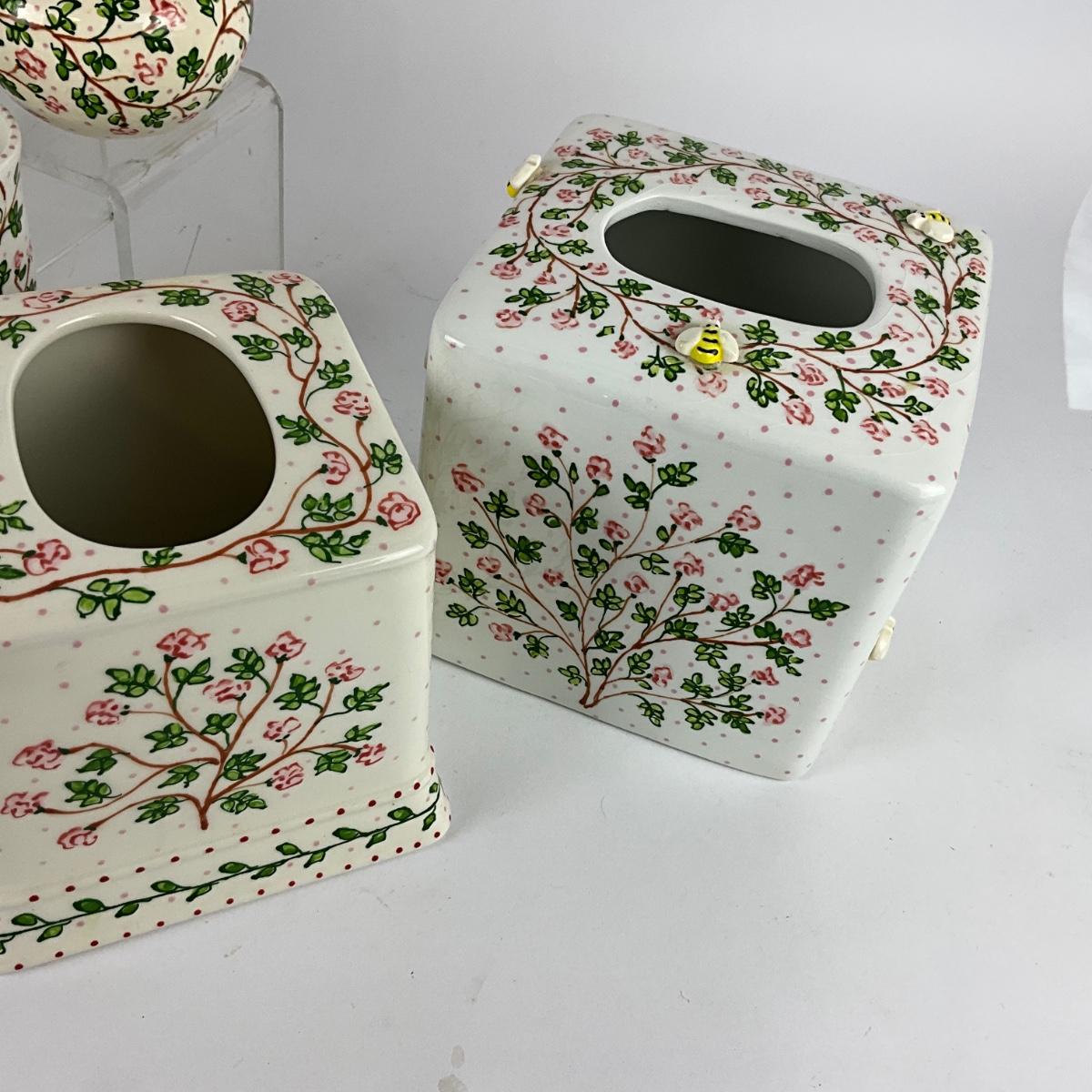 Set of three tissue covers, covered dish , vase, and trash pale measuring 8" diameter x 10" high