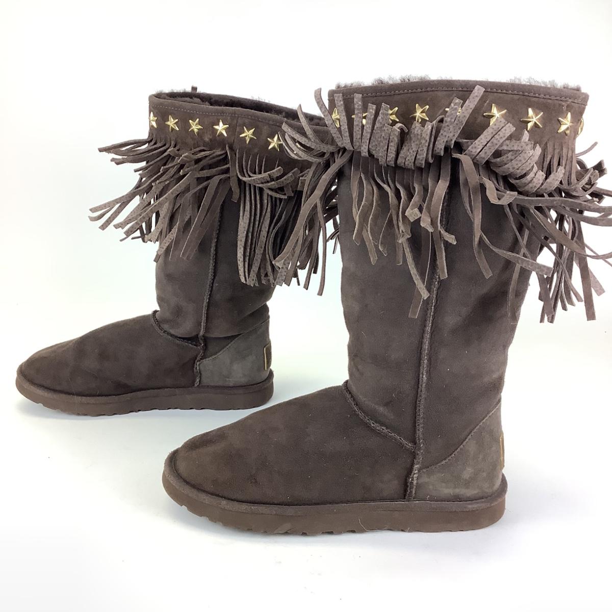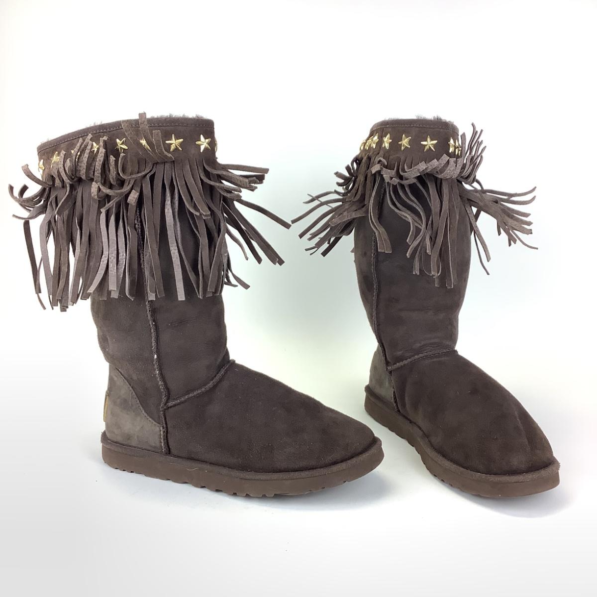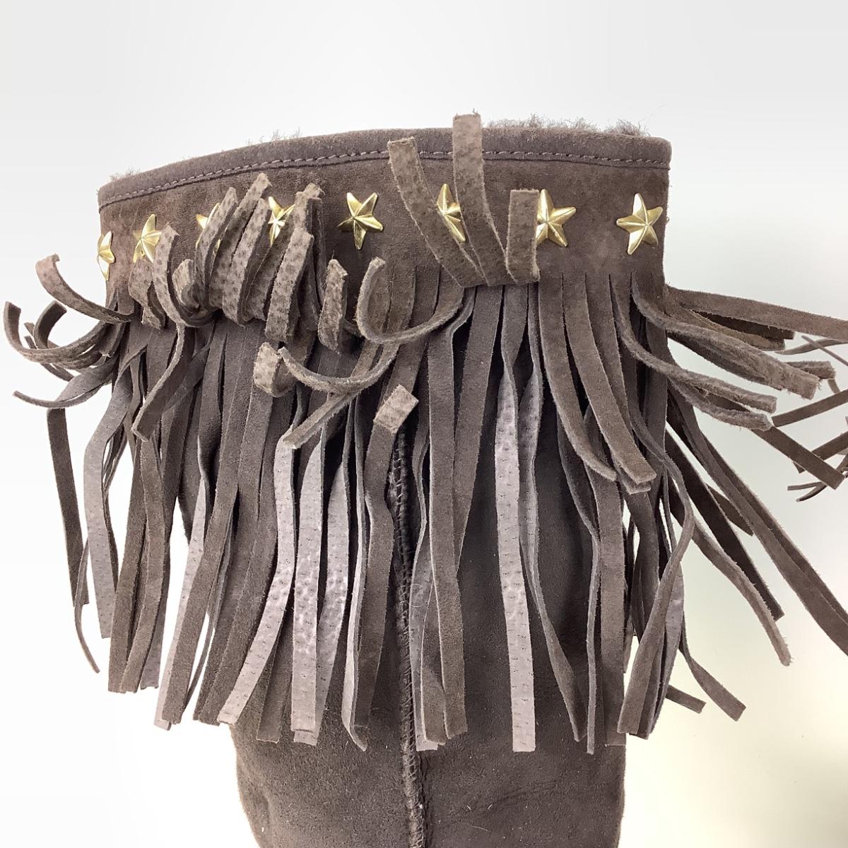 Gently worn brown suede Sora Fringe boots made with genuine sheep leather with gold metal star details.