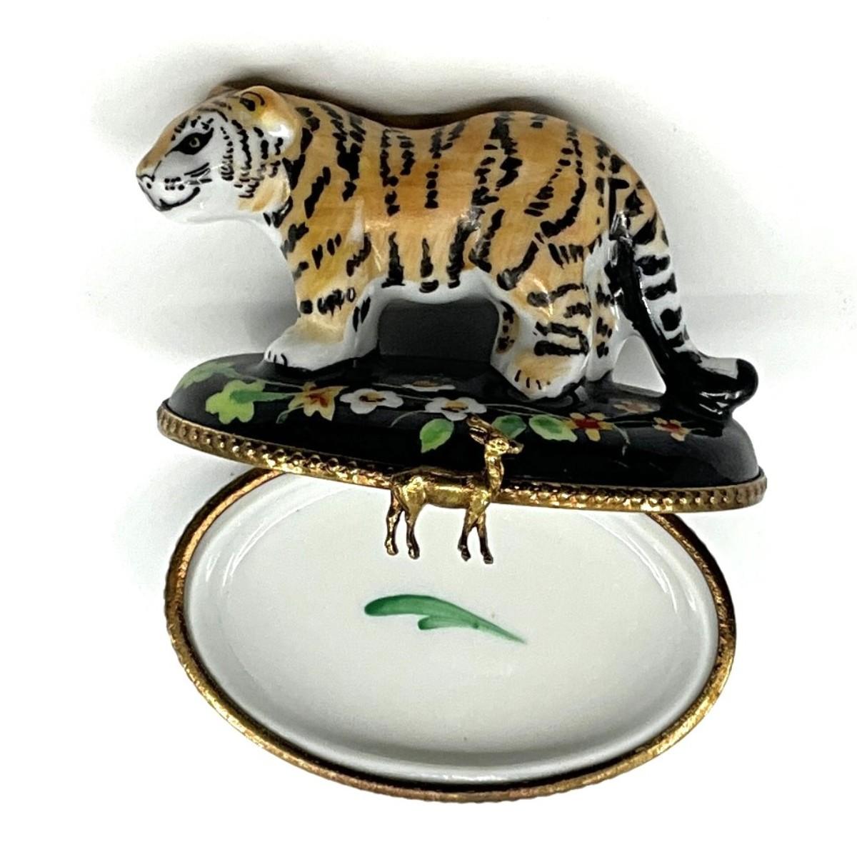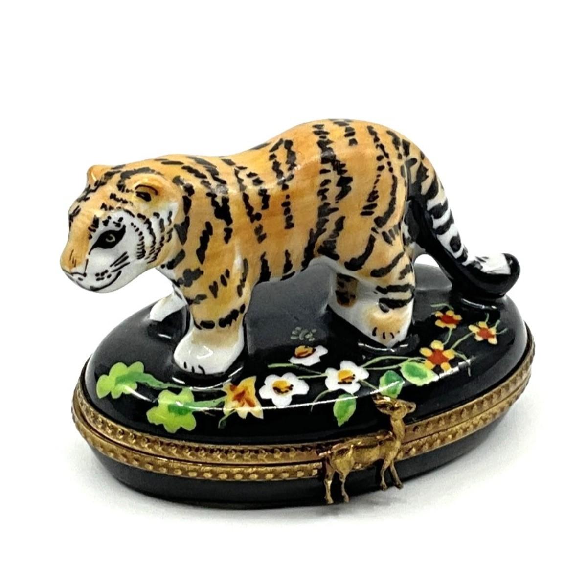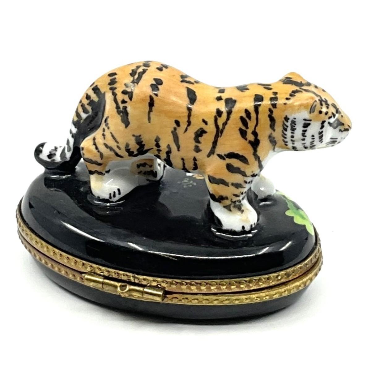 150 Limoges France Paint Main Tiger with Black Base Porcelain Box