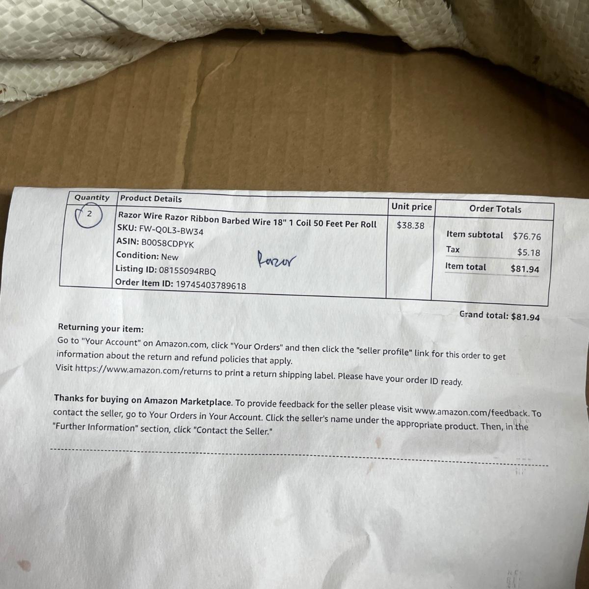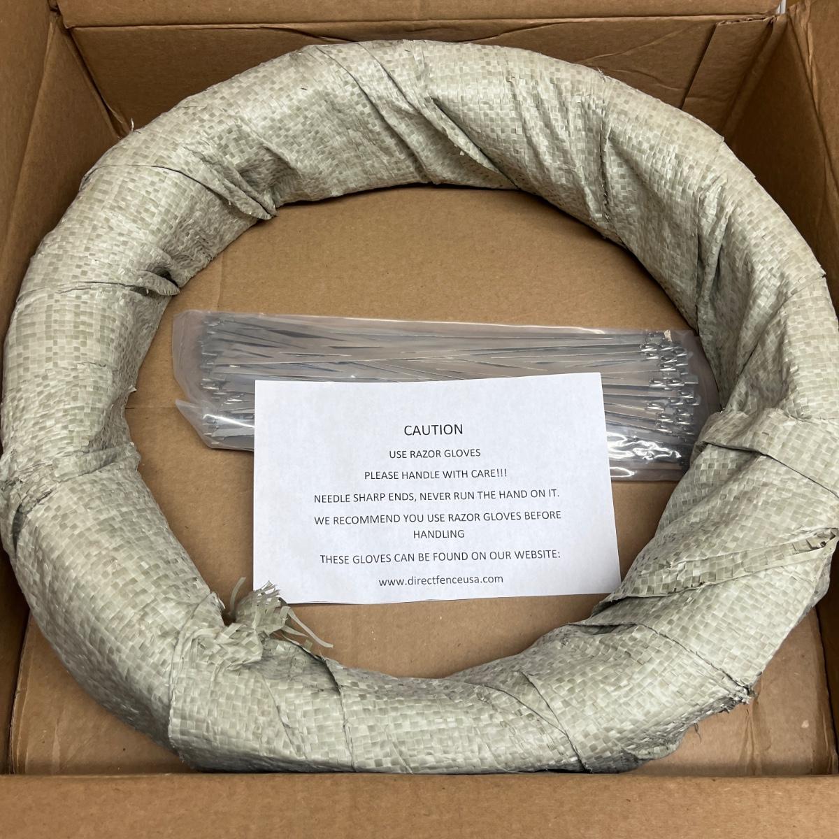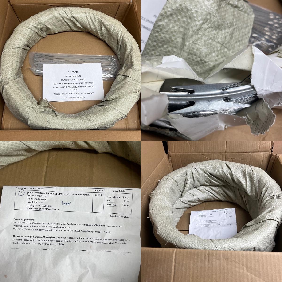 Lot includes three rolls of razor wire with each roll being 50 feet.