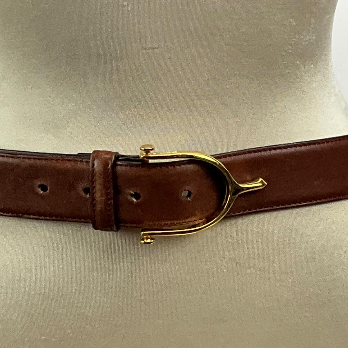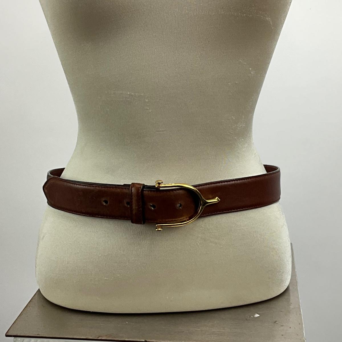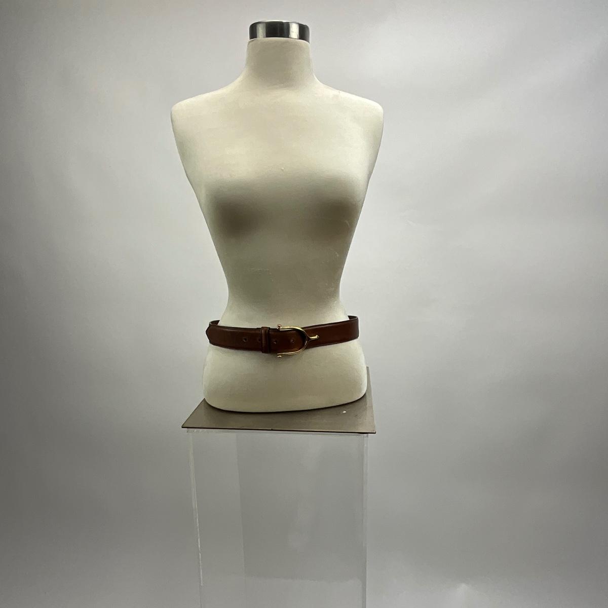 Brown leather belt with gold tone horse-bit buckle, size 32-Women's, the belt is excellent condition.