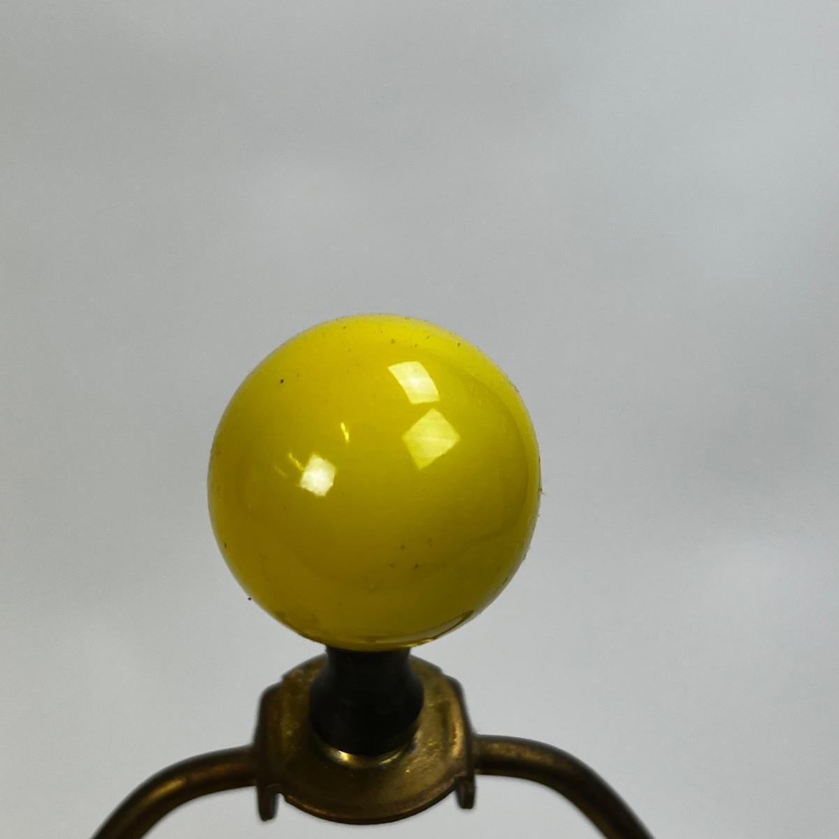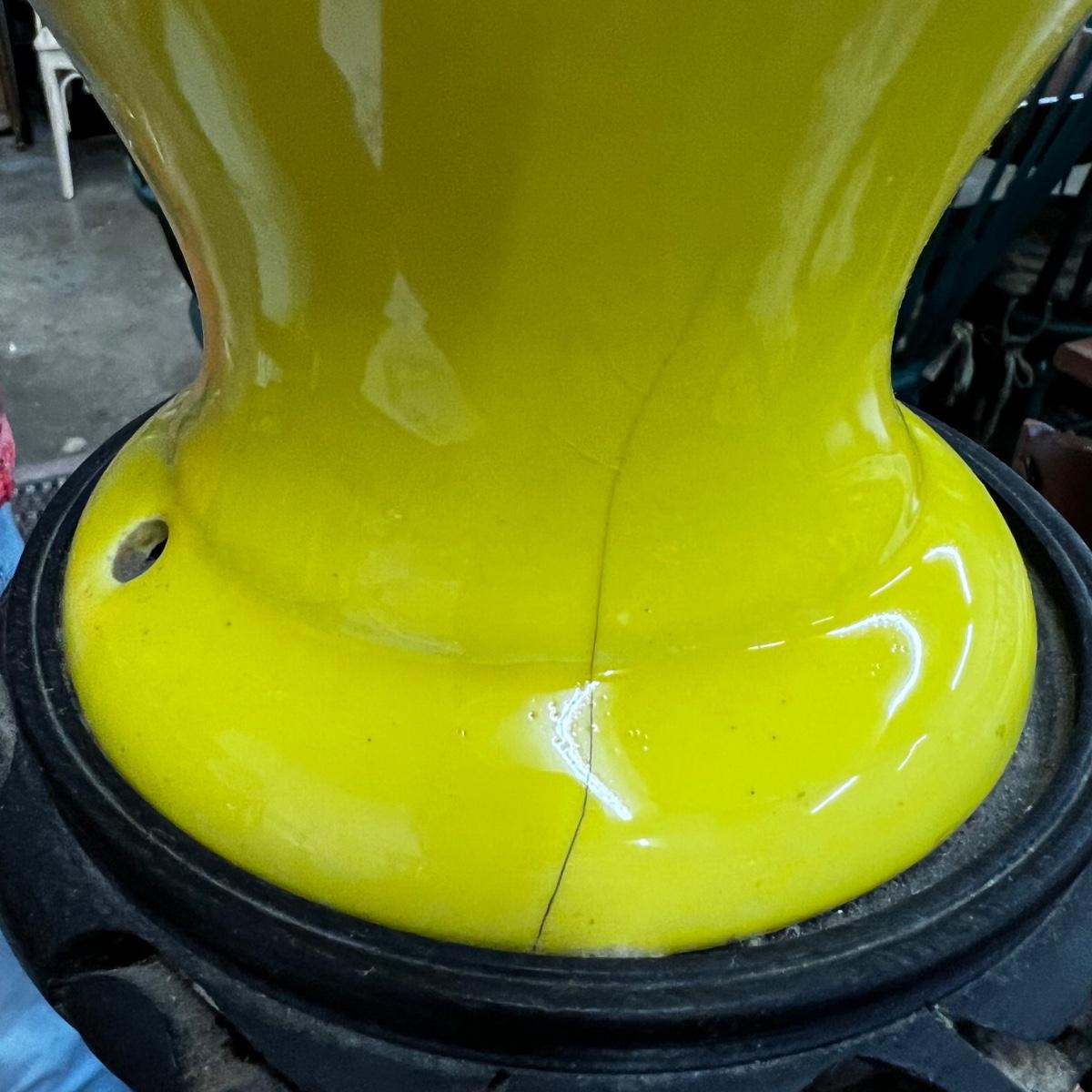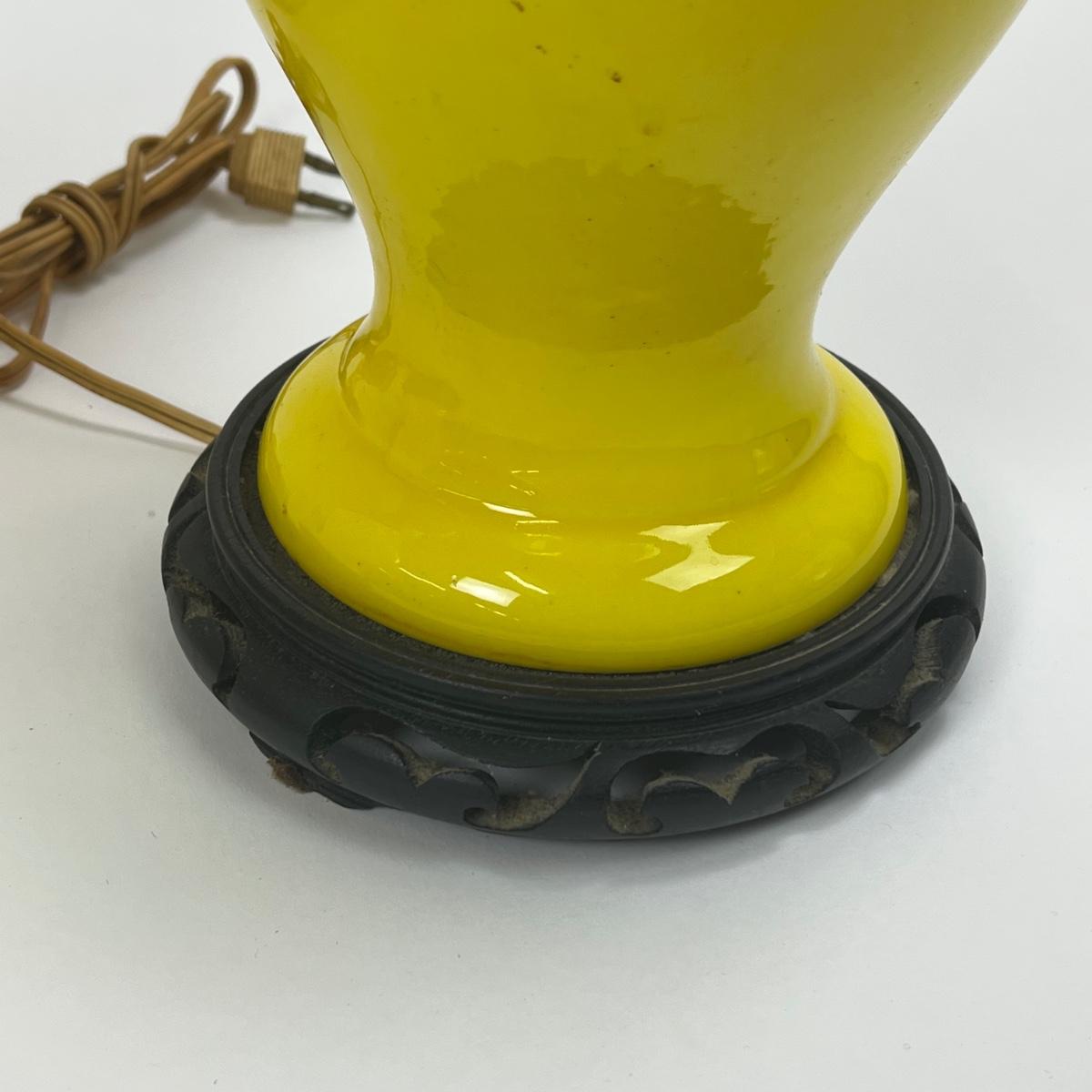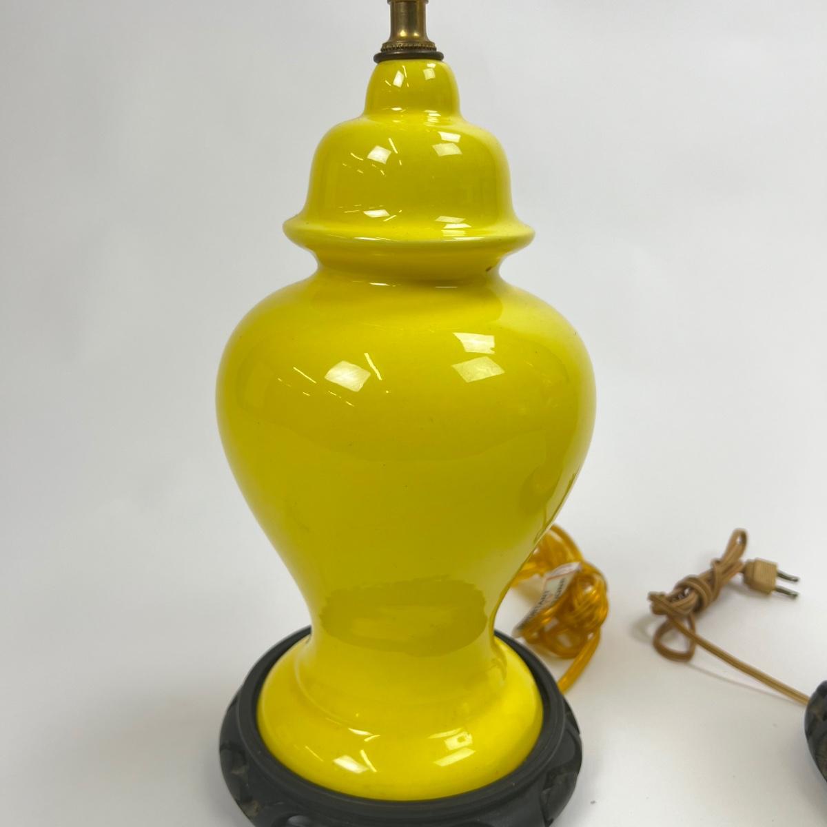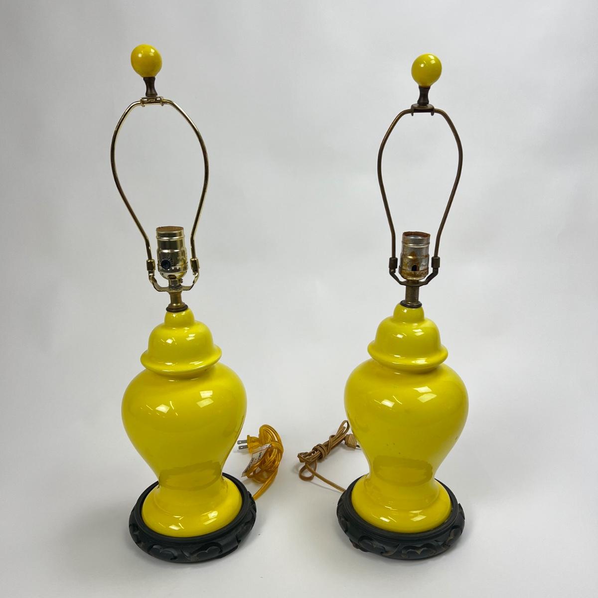 Pair of Yellow Jar Lamps with wooden carved base. One jar has crack see photos.