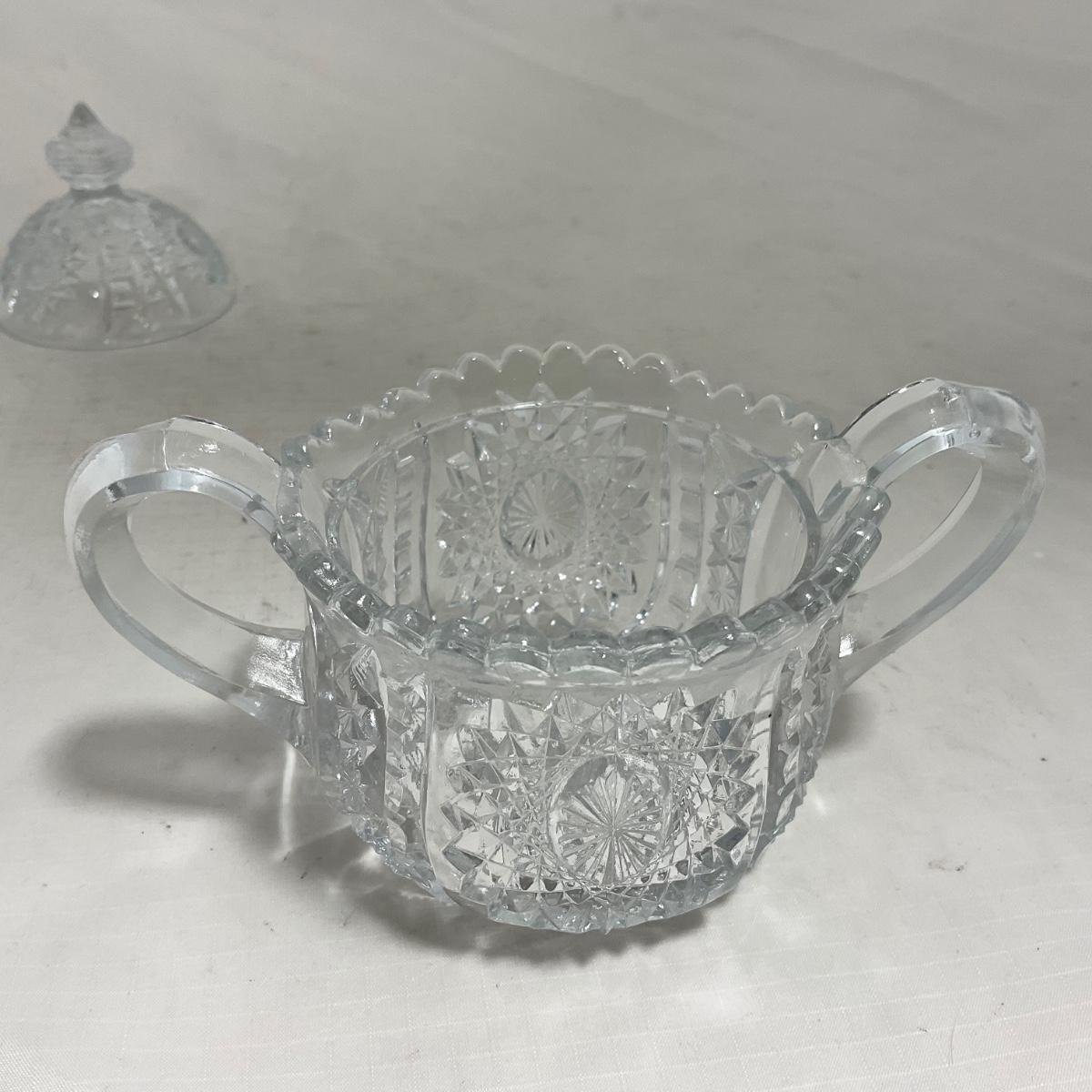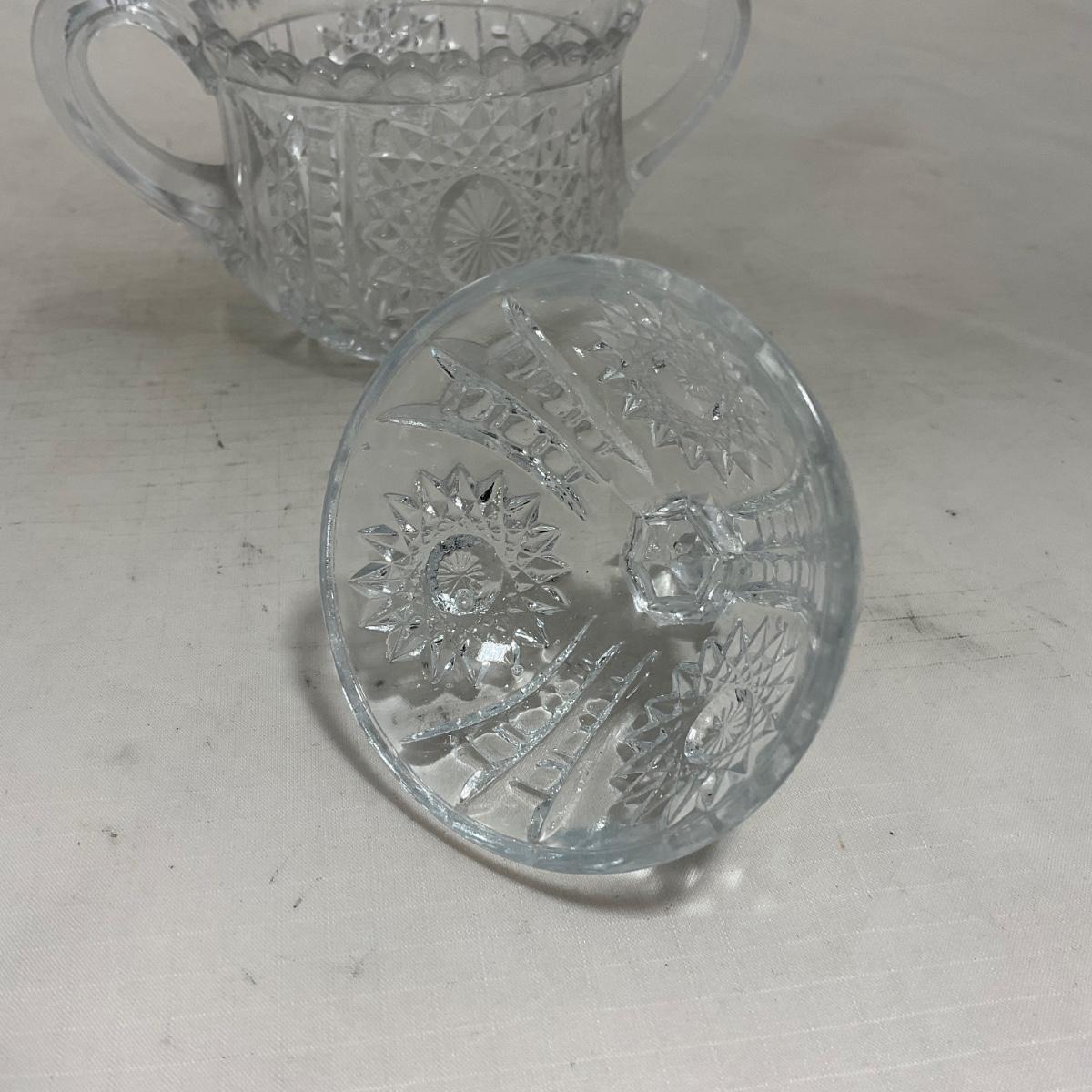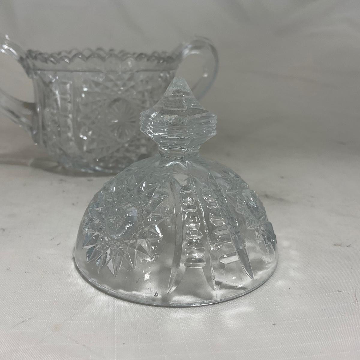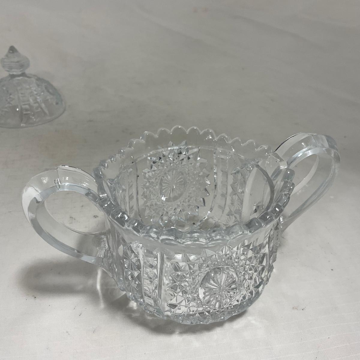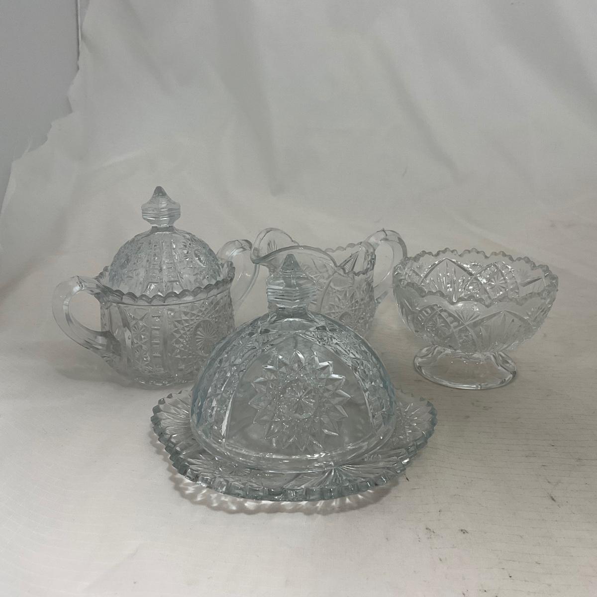 Small children's sized clear glass set. Set includes a small covered butter dish, a lidded jar, and sugar & creamer. All pieces are well loved and have some small chips and damage. Please see photos for details and condition. ::: Shipping is available on this lot. If you require shipping you must let us know at the close of the auction. We will coordinate with you after the item has been won. Shipping fees will include insurance up to or exceeding the value of all items being mailed. If you have any questions regarding this lot please contact the auctioneer either via this website, by direct email or by phone. PICK UP TIMES and other important information can be found in the TERMS and DESCRIPTION of the auction. Please take a look for pertinent information. Thanks!