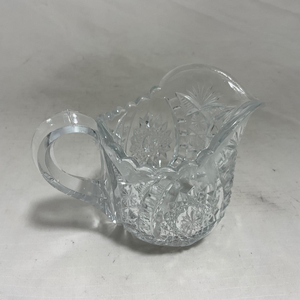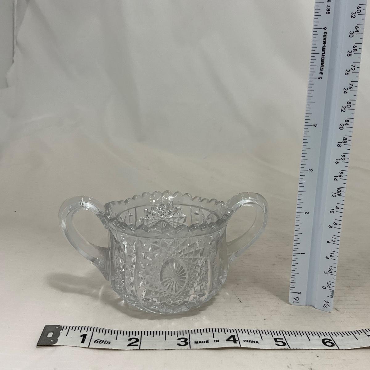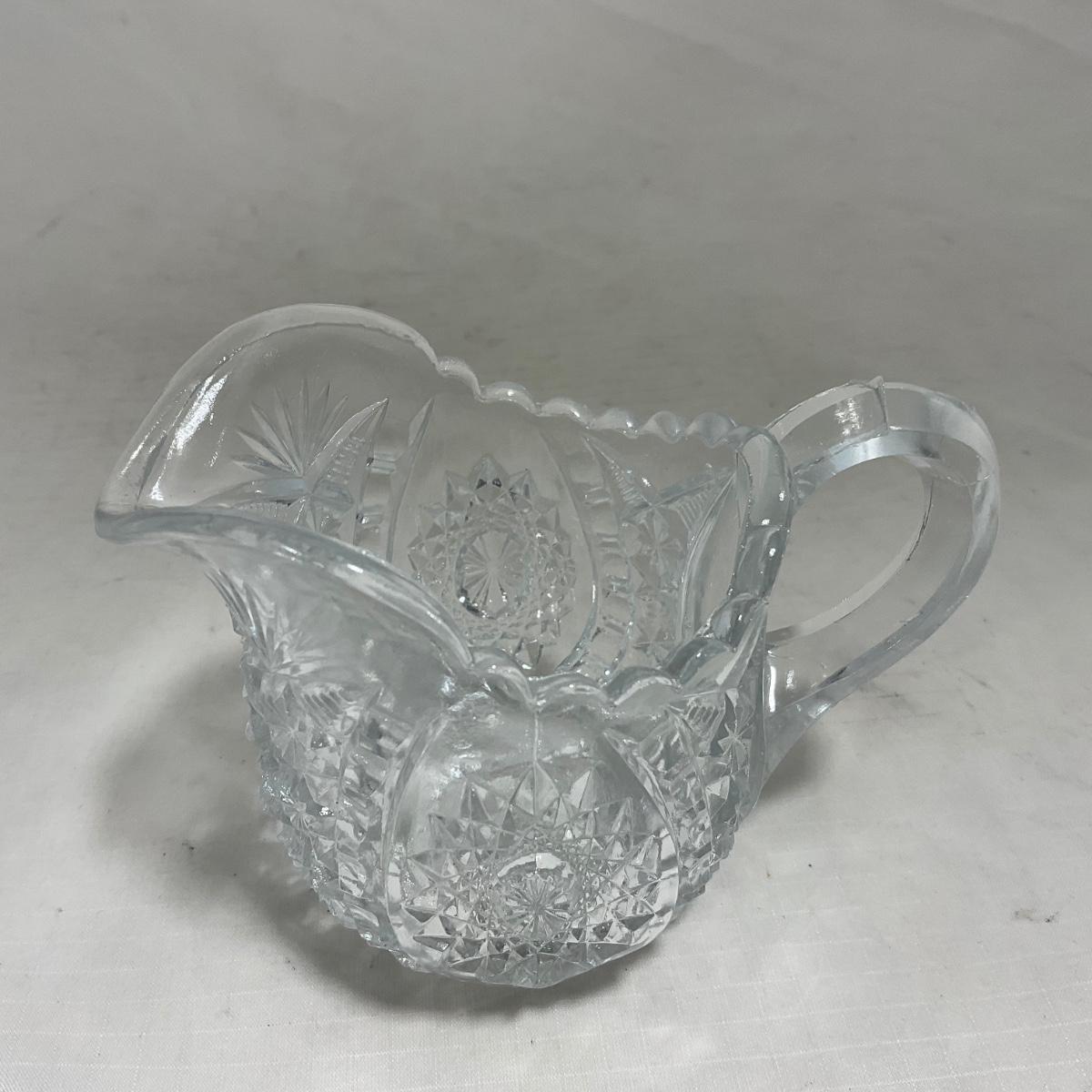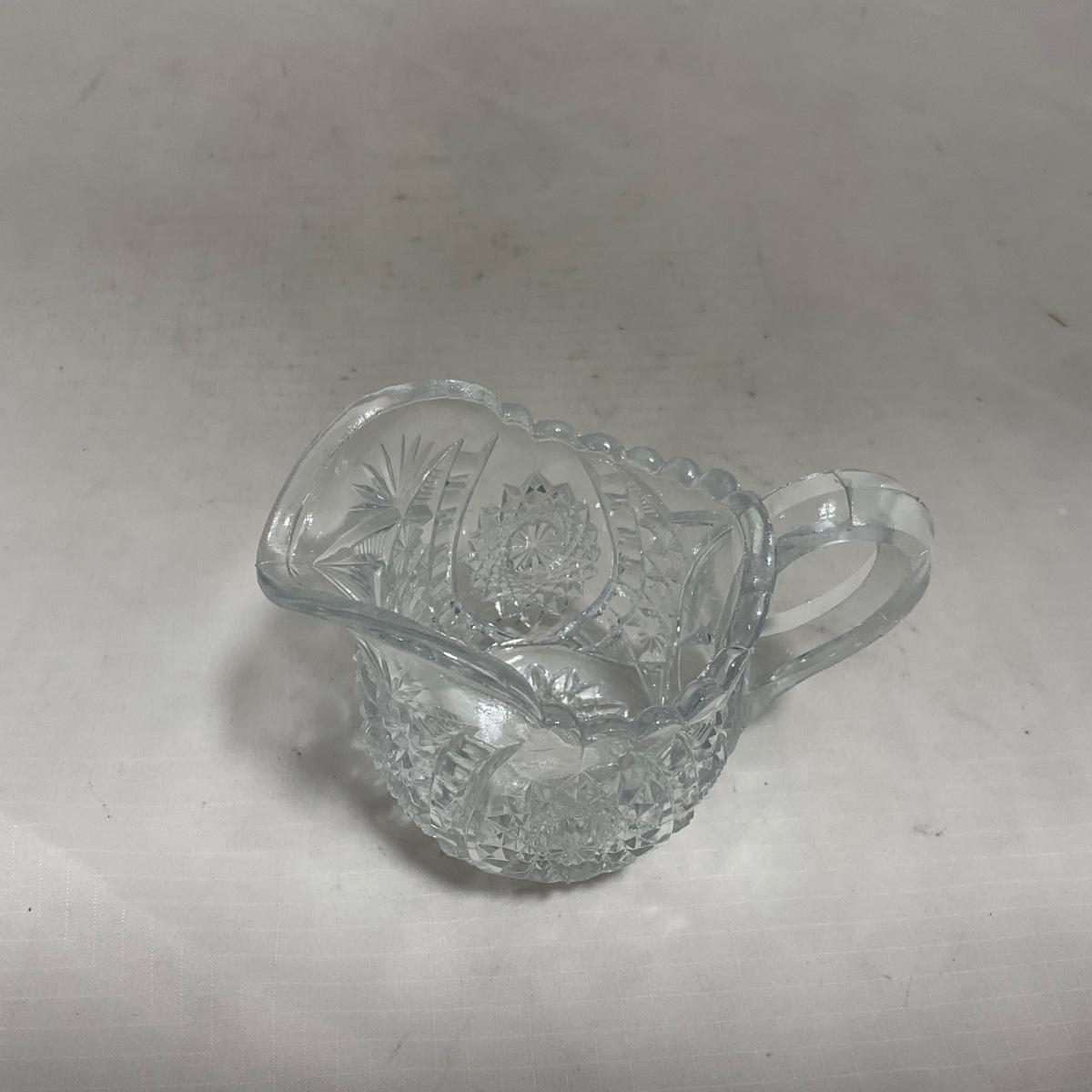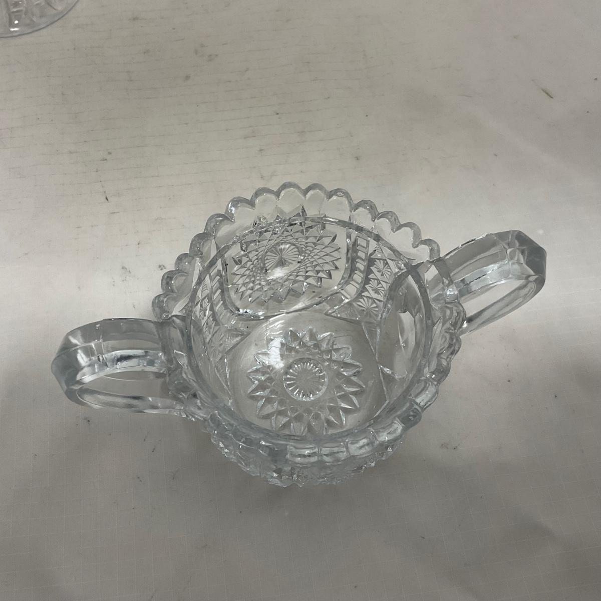 Small children's sized clear glass set. Set includes a small covered butter dish, a lidded jar, and sugar & creamer. All pieces are well loved and have some small chips and damage. Please see photos for details and condition. ::: Shipping is available on this lot. If you require shipping you must let us know at the close of the auction. We will coordinate with you after the item has been won. Shipping fees will include insurance up to or exceeding the value of all items being mailed. If you have any questions regarding this lot please contact the auctioneer either via this website, by direct email or by phone. PICK UP TIMES and other important information can be found in the TERMS and DESCRIPTION of the auction. Please take a look for pertinent information. Thanks!
