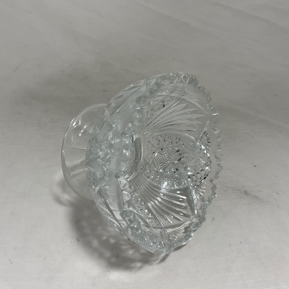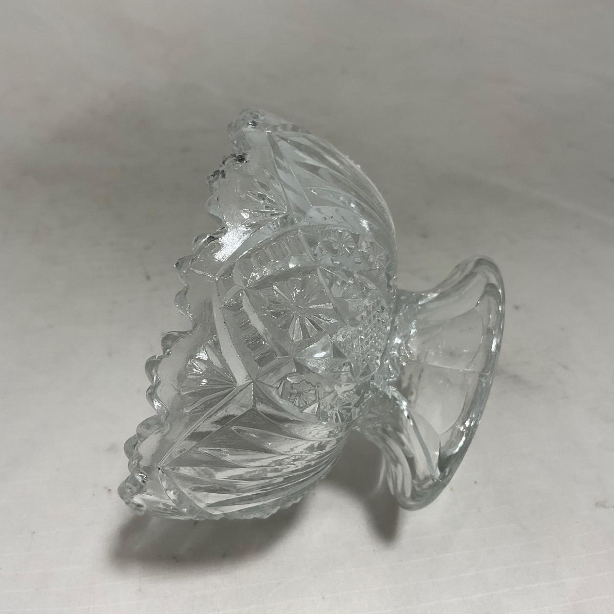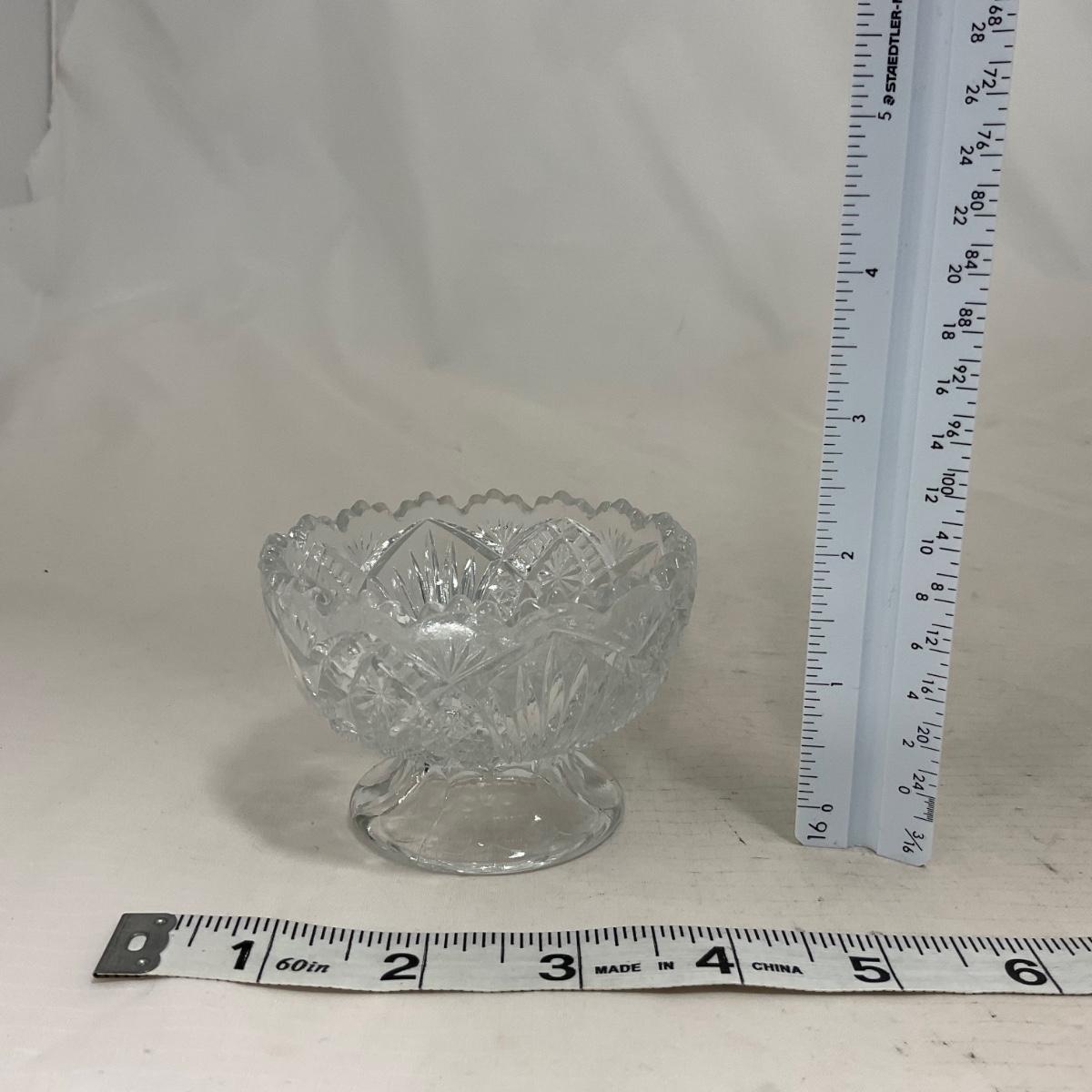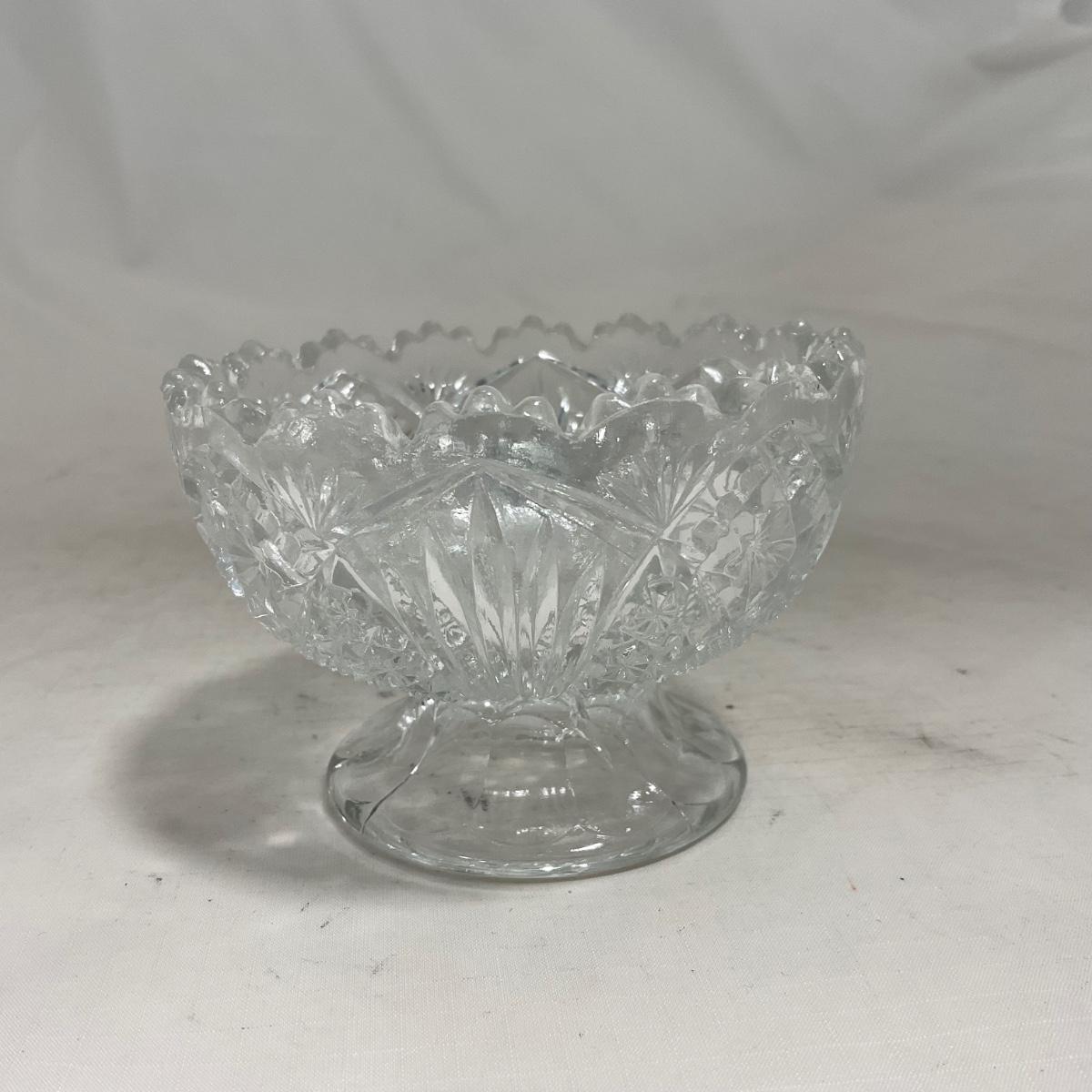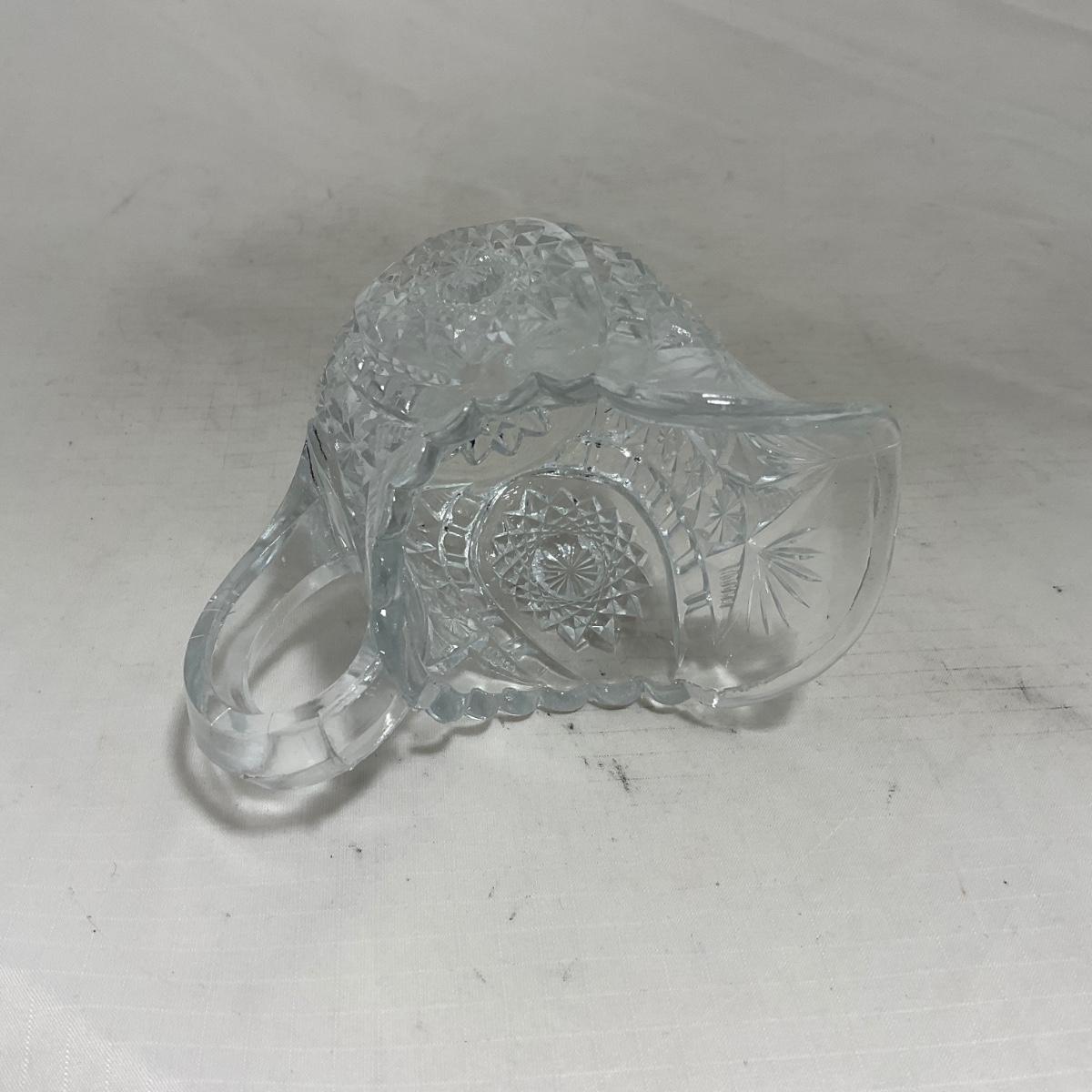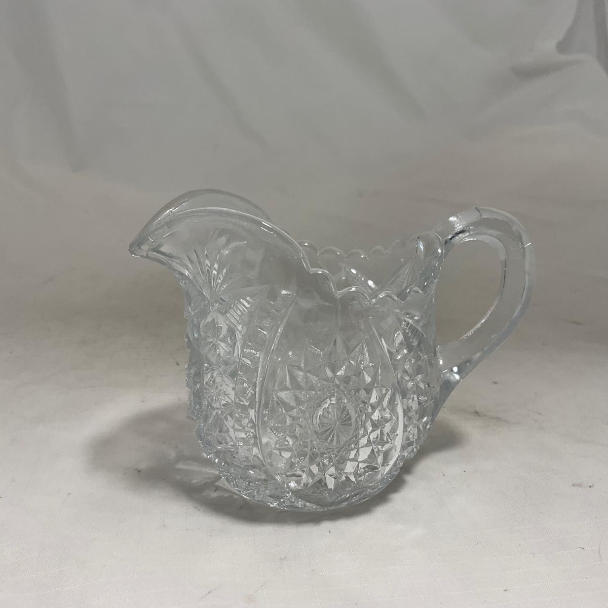 Small children's sized clear glass set. Set includes a small covered butter dish, a lidded jar, and sugar & creamer. All pieces are well loved and have some small chips and damage. Please see photos for details and condition. ::: Shipping is available on this lot. If you require shipping you must let us know at the close of the auction. We will coordinate with you after the item has been won. Shipping fees will include insurance up to or exceeding the value of all items being mailed. If you have any questions regarding this lot please contact the auctioneer either via this website, by direct email or by phone. PICK UP TIMES and other important information can be found in the TERMS and DESCRIPTION of the auction. Please take a look for pertinent information. Thanks!