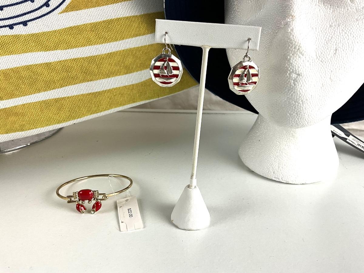Denim Anchor Hat with Anchor red, yellow beach tote, white pashmina, with sailboat earrings and crab enamel bangle bracelet