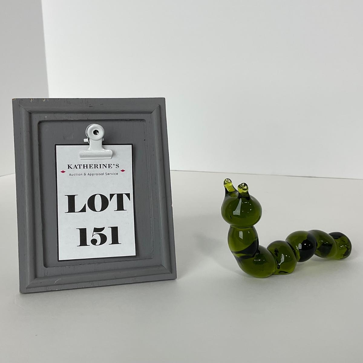 One Pilgrim green glass caterpillar. 2 1/2 inches tall by by 4 inches long. This piece has no damage, and appears to be in great shape with no visable chips, cracks, or broken pieces. Please see photos for details and condition. Any condition statement is given as a courtesy to a client, is an opinion, and should not be treated as a statement of fact. Reference to condition written, oral or within a condition report shall not be regarded as a full account of condition and may not include all defects, alterations, or restorations. Absence of a condition report does not imply a lot is flawless or lacking imperfections or damage. Katherine’s Auction & Appraisal Service shall have no responsibility for any error or omission. Returns shall not be accepted on the basis of condition. ::: Shipping is available on this lot. If you require shipping you must let us know at the close of the auction. We will coordinate with you after the item has been won. Shipping fees will include insurance up to or exceeding the value of all items being mailed. If you have any questions regarding this lot please contact the auctioneer either via this website, by direct email or by phone. PICK UP TIMES and other important information can be found in the TERMS and DESCRIPTION of the auction. Please take a look for pertinent information. Thanks!
