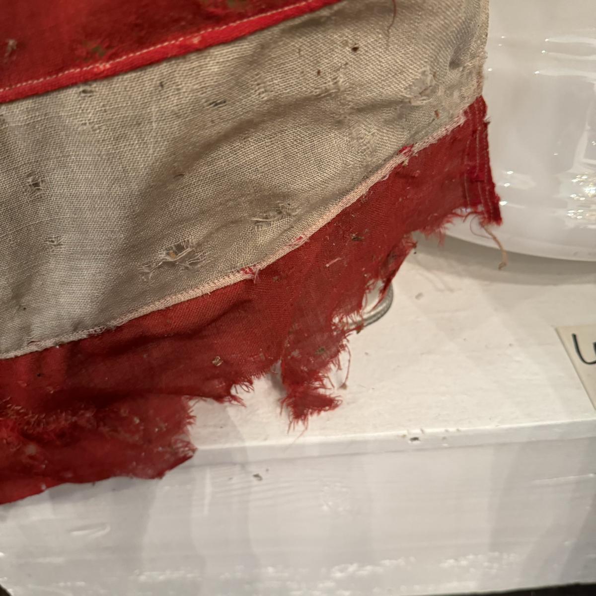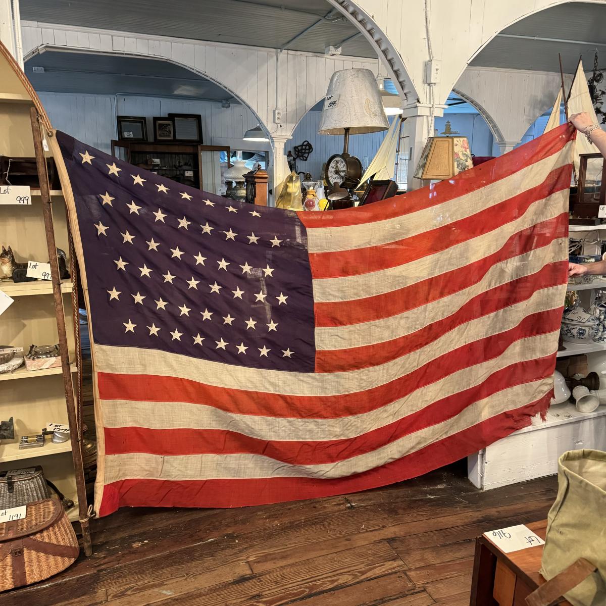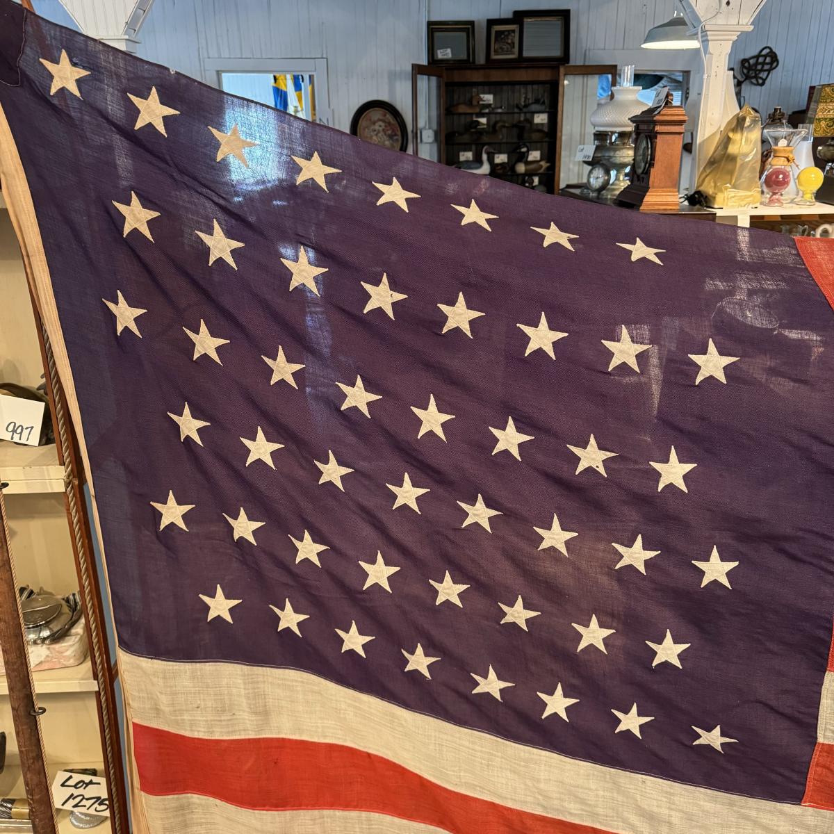 Antique American 48 Star Linen Flag. Fabulous piece of history. Overall good shape considering age. The wooden flag pole appears to be original. Please see pics where linen has some damage and overall condition, etc..