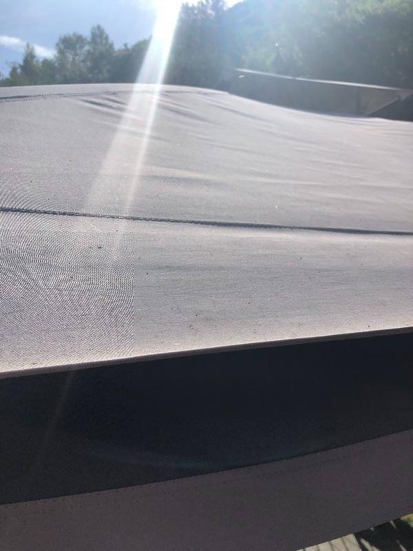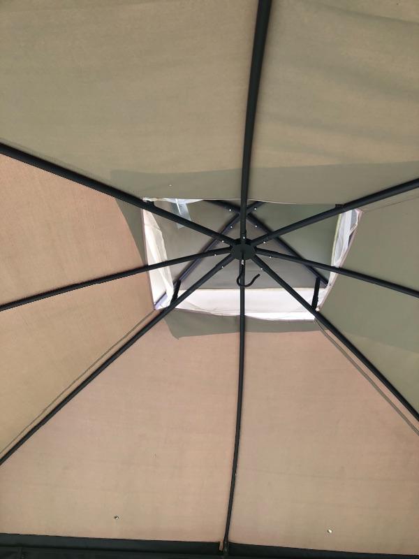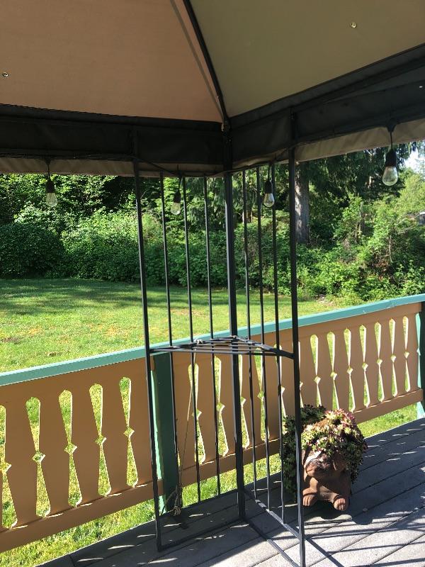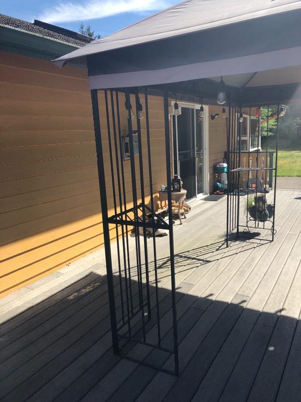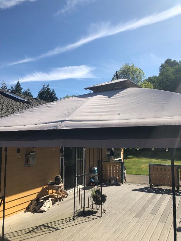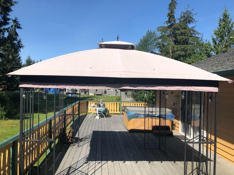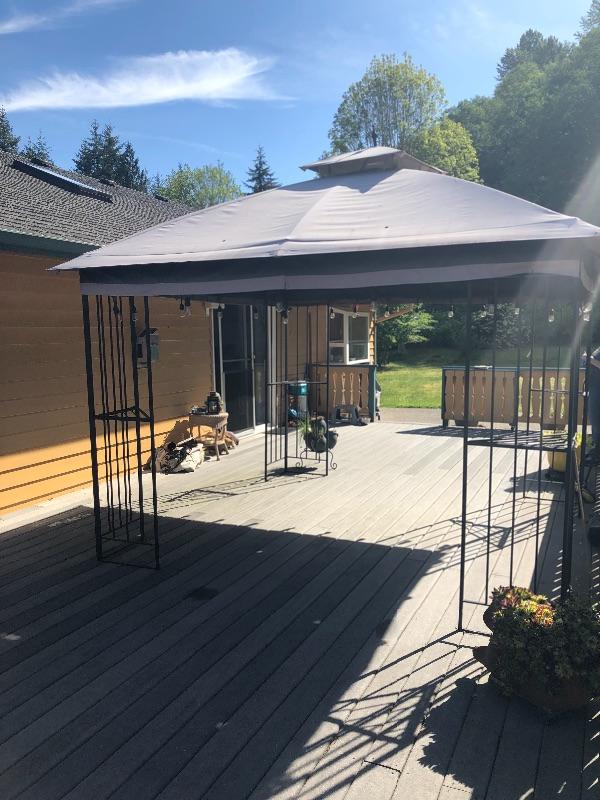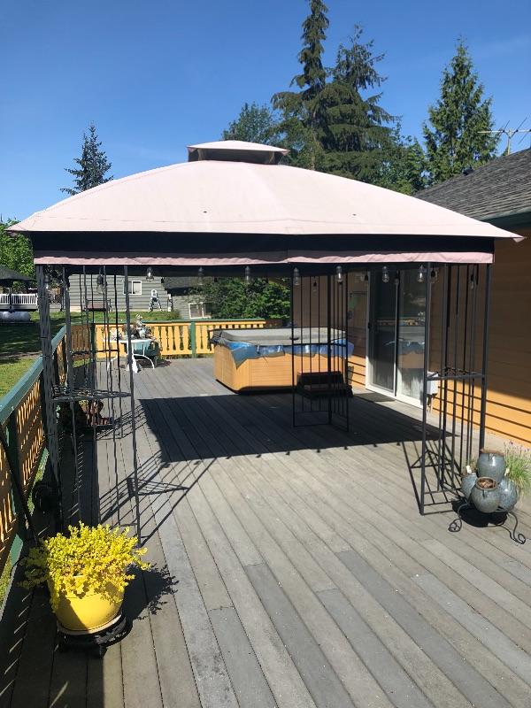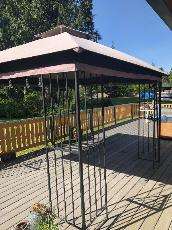 117 x 115 x 115 Tall. Large outdoor patio gazebo with lighting that goes the entire perimeter of the gazebo. Shelving on each corner of metal stands. Some fading but canvas has no rips. Must unbolt from deck and take apart when you come for pick up.