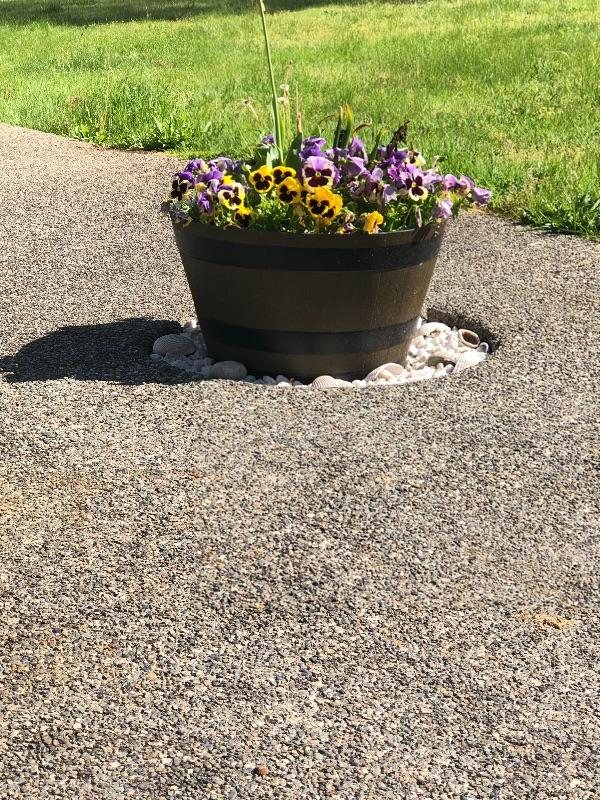 Three Outdoor Resin Planters With Live Plants. 12 inches tall x 20 in D
