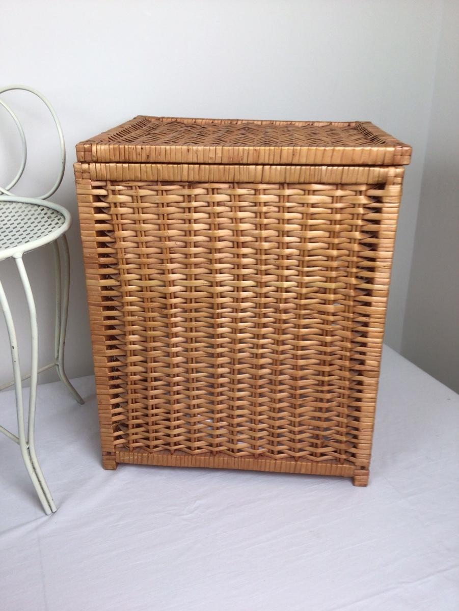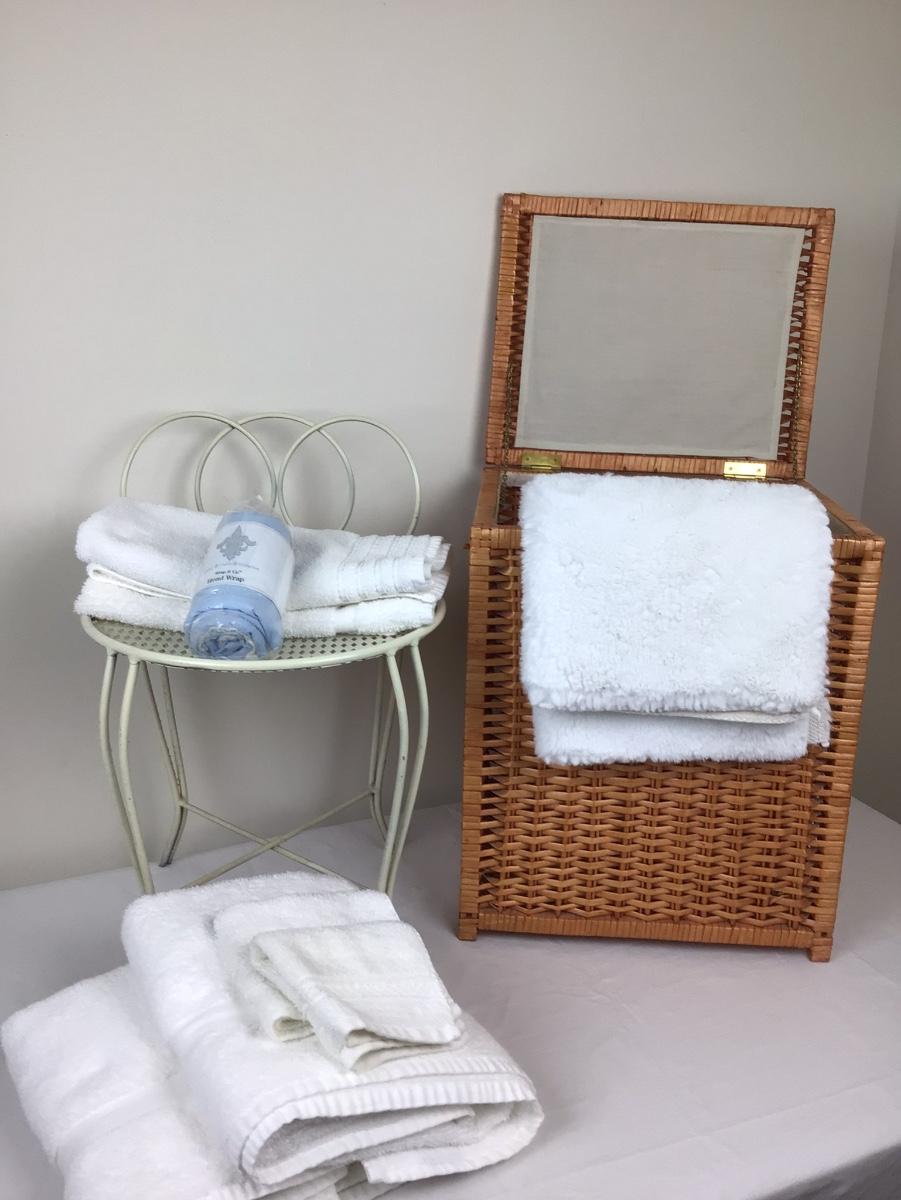 Metal vanity chair, hamper, rug, towels and new head wrap. Chair is 15” tall, hamper is 19” x 12.5” x 15.5”.