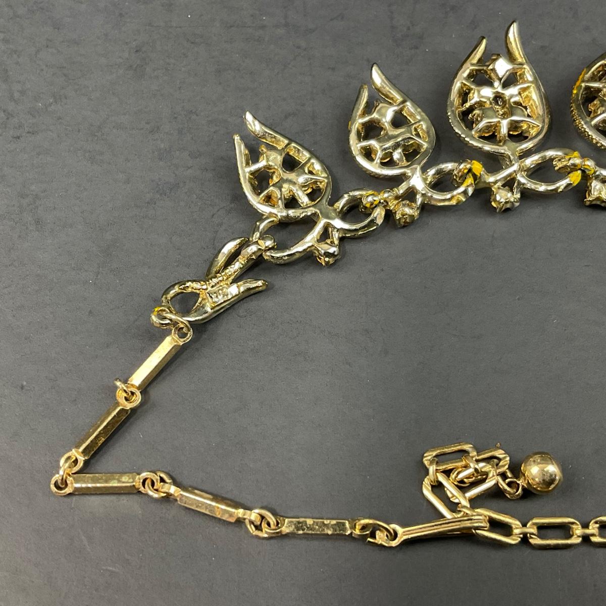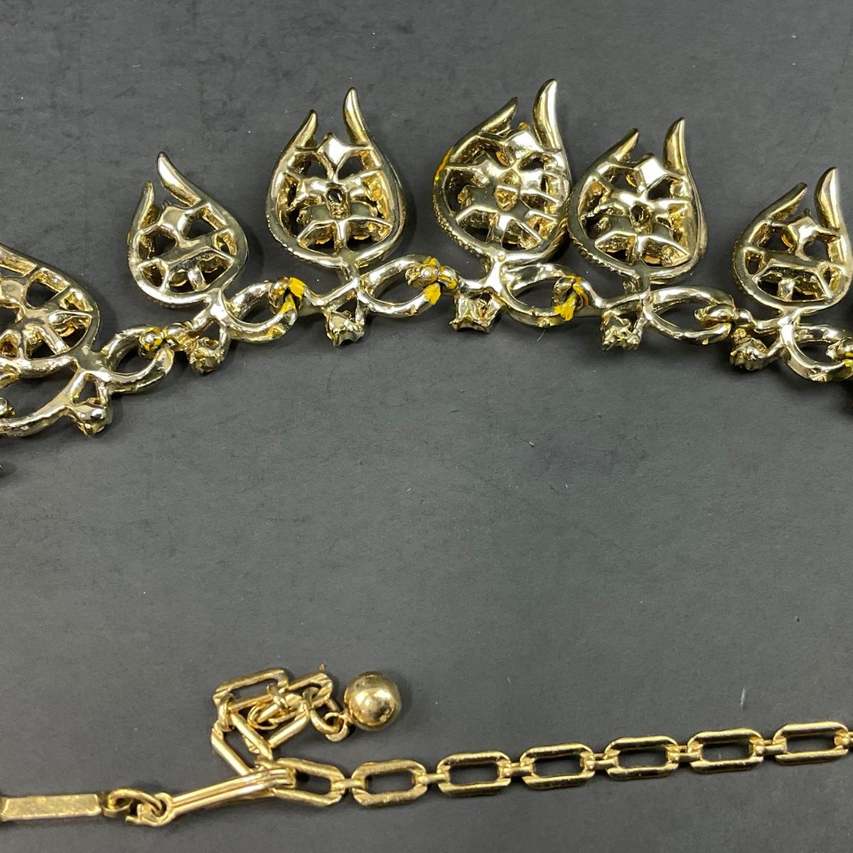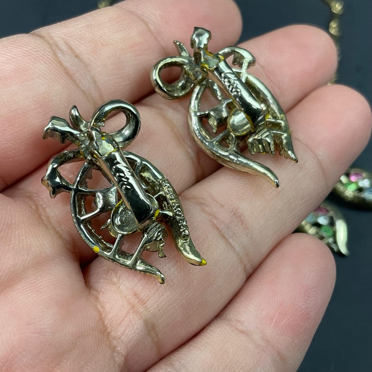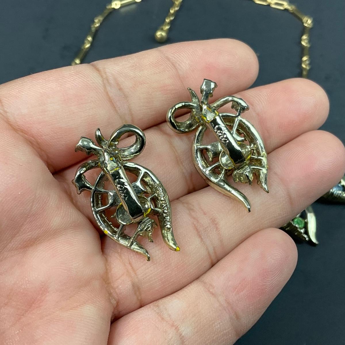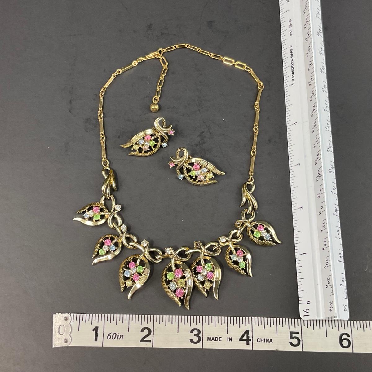 Vintage 1960’s Coro gold tone jewelry with pastel in color stone. Necklace and matching clip earrings. Please see photos for details and condition. Any condition statement is given as a courtesy to a client, is an opinion, and should not be treated as a statement of fact. Reference to condition written, oral or within a condition report shall not be regarded as a full account of condition and may not include all defects, alterations, or restorations. Absence of a condition report does not imply a lot is flawless or lacking imperfections or damage. Katherine’s Auction & Appraisal Service shall have no responsibility for any error or omission. Returns shall not be accepted on the basis of condition. ::: Shipping is available on this lot. If you require shipping you must let us know at the close of the auction. We will coordinate with you after the item has been won. Shipping fees will include insurance up to or exceeding the value of all items being mailed. If you have any questions regarding this lot please contact the auctioneer either via this website, by direct email or by phone. PICK UP TIMES and other important information can be found in the TERMS and DESCRIPTION of the auction. Please take a look for pertinent information. Thanks!
