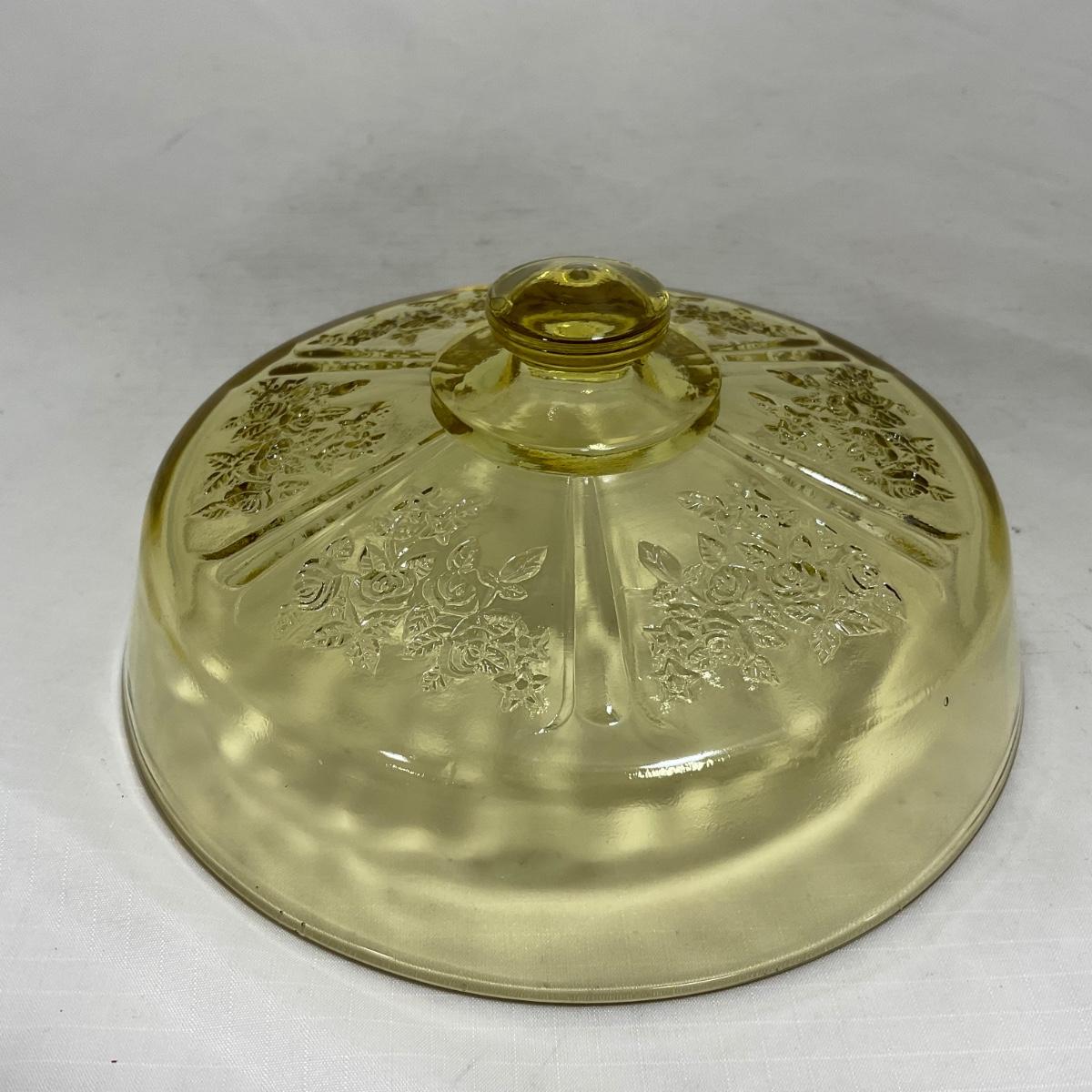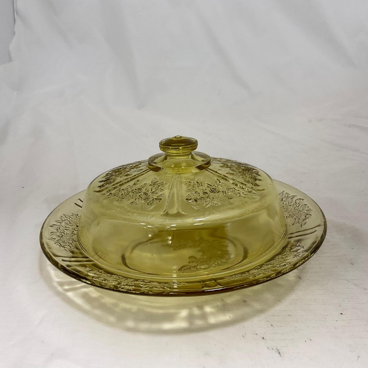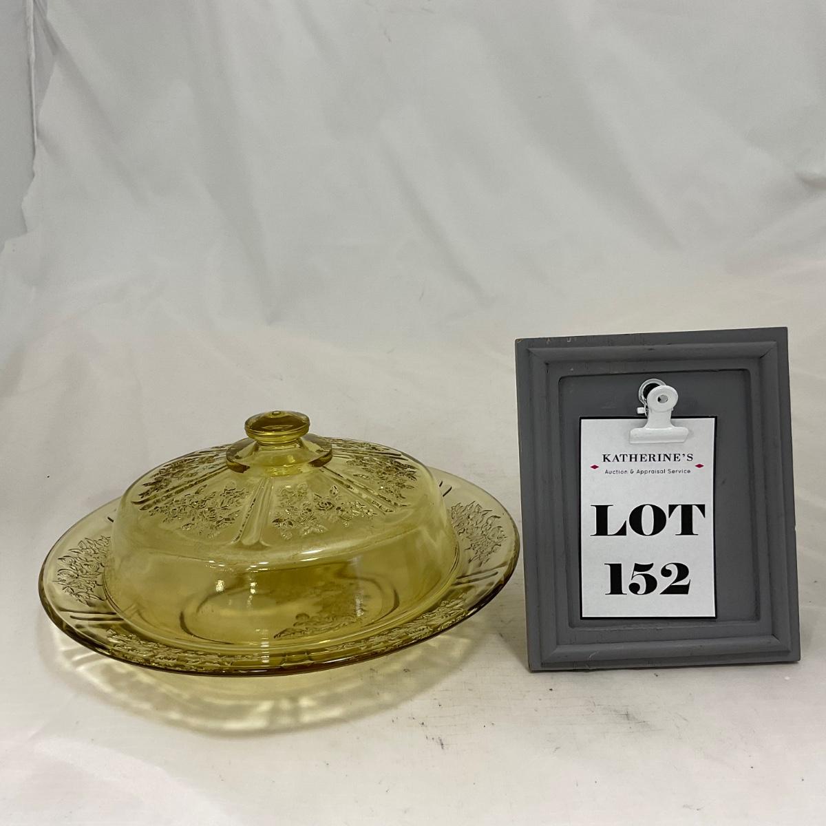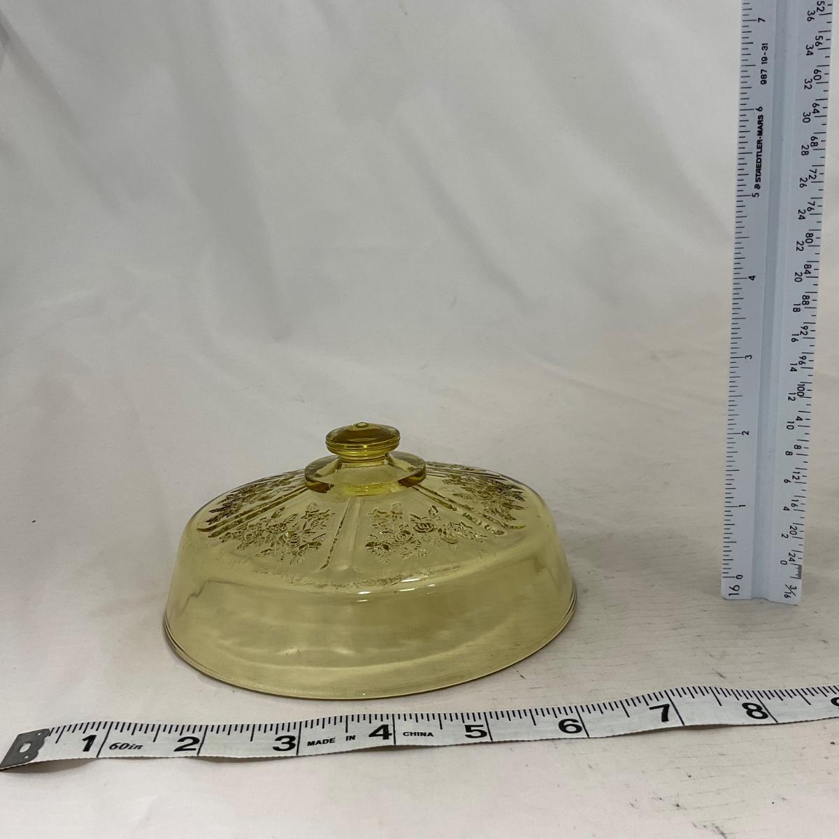 One dark yellow detailed covered butter dish. In beautiful shape and condition. Please see photos for details and condition. ::: Shipping is available on this lot. If you require shipping you must let us know at the close of the auction. We will coordinate with you after the item has been won. Shipping fees will include insurance up to or exceeding the value of all items being mailed. If you have any questions regarding this lot please contact the auctioneer either via this website, by direct email or by phone. PICK UP TIMES and other important information can be found in the TERMS and DESCRIPTION of the auction. Please take a look for pertinent information. Thanks!