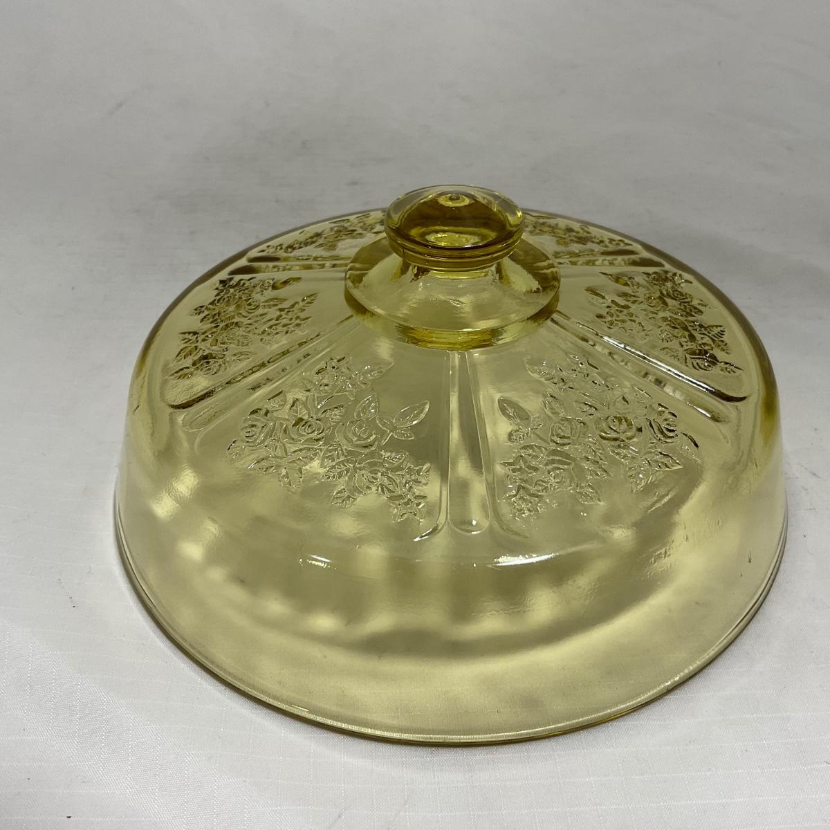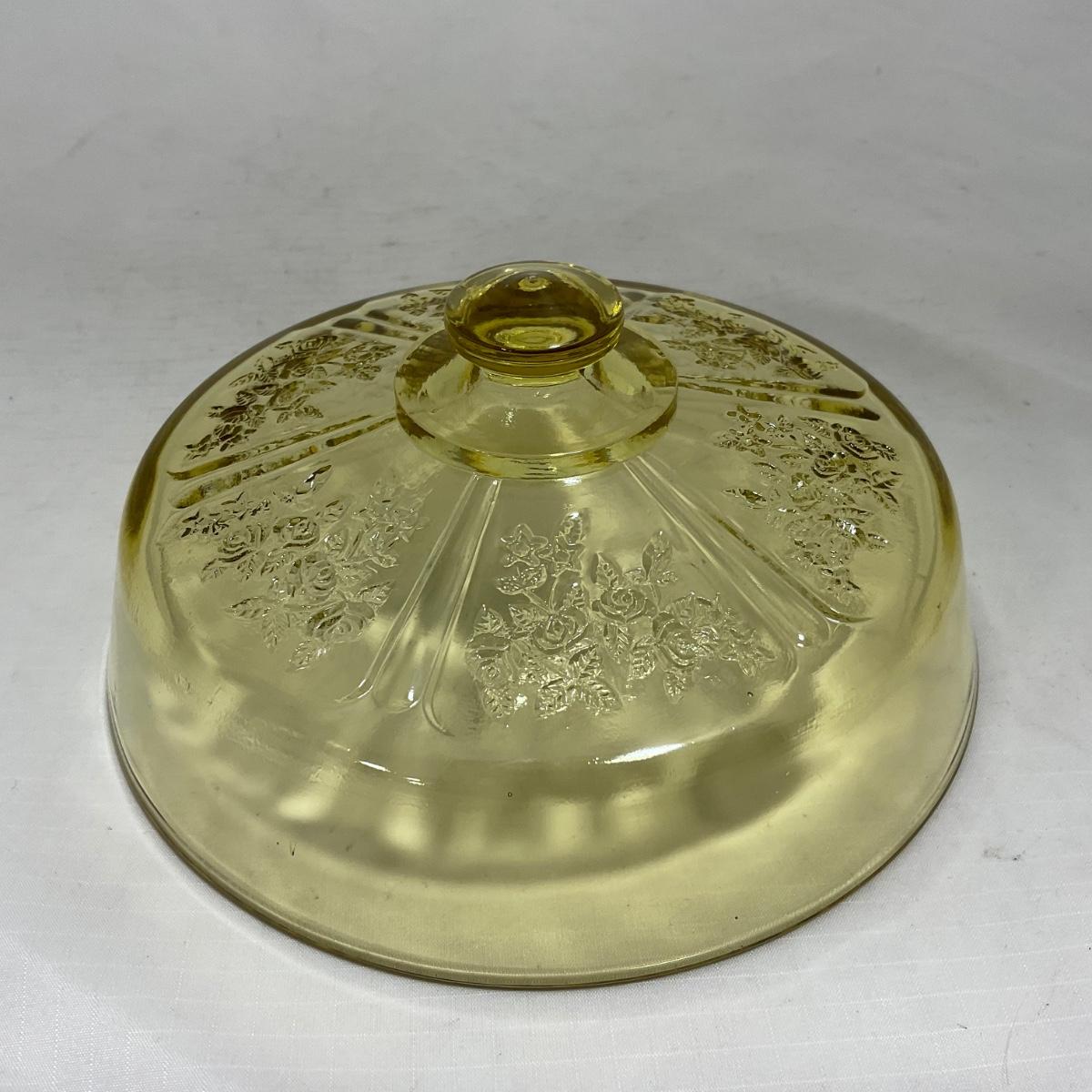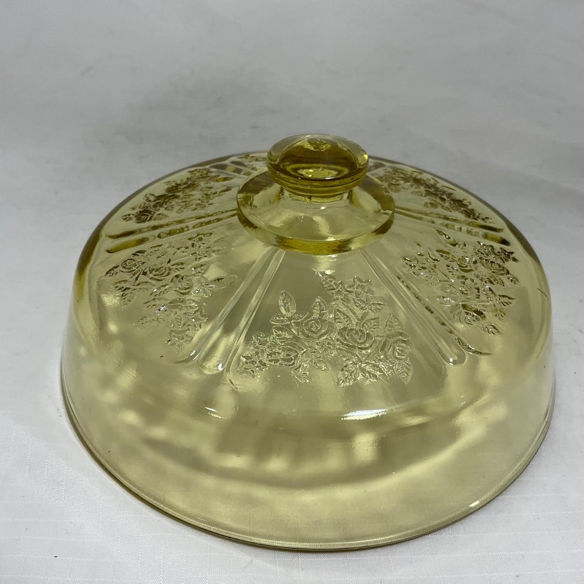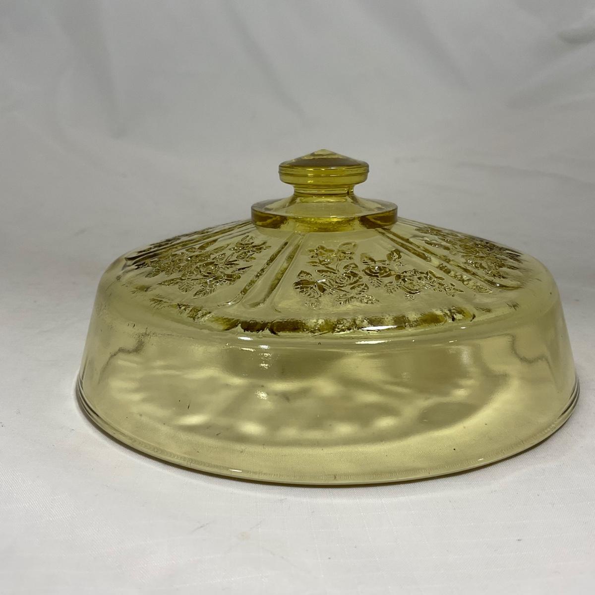 One dark yellow detailed covered butter dish. In beautiful shape and condition. Please see photos for details and condition. ::: Shipping is available on this lot. If you require shipping you must let us know at the close of the auction. We will coordinate with you after the item has been won. Shipping fees will include insurance up to or exceeding the value of all items being mailed. If you have any questions regarding this lot please contact the auctioneer either via this website, by direct email or by phone. PICK UP TIMES and other important information can be found in the TERMS and DESCRIPTION of the auction. Please take a look for pertinent information. Thanks!