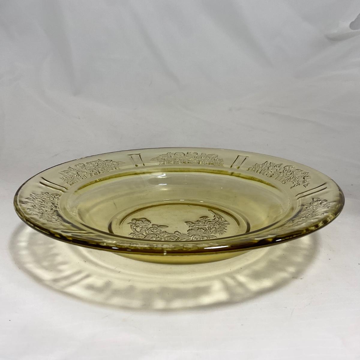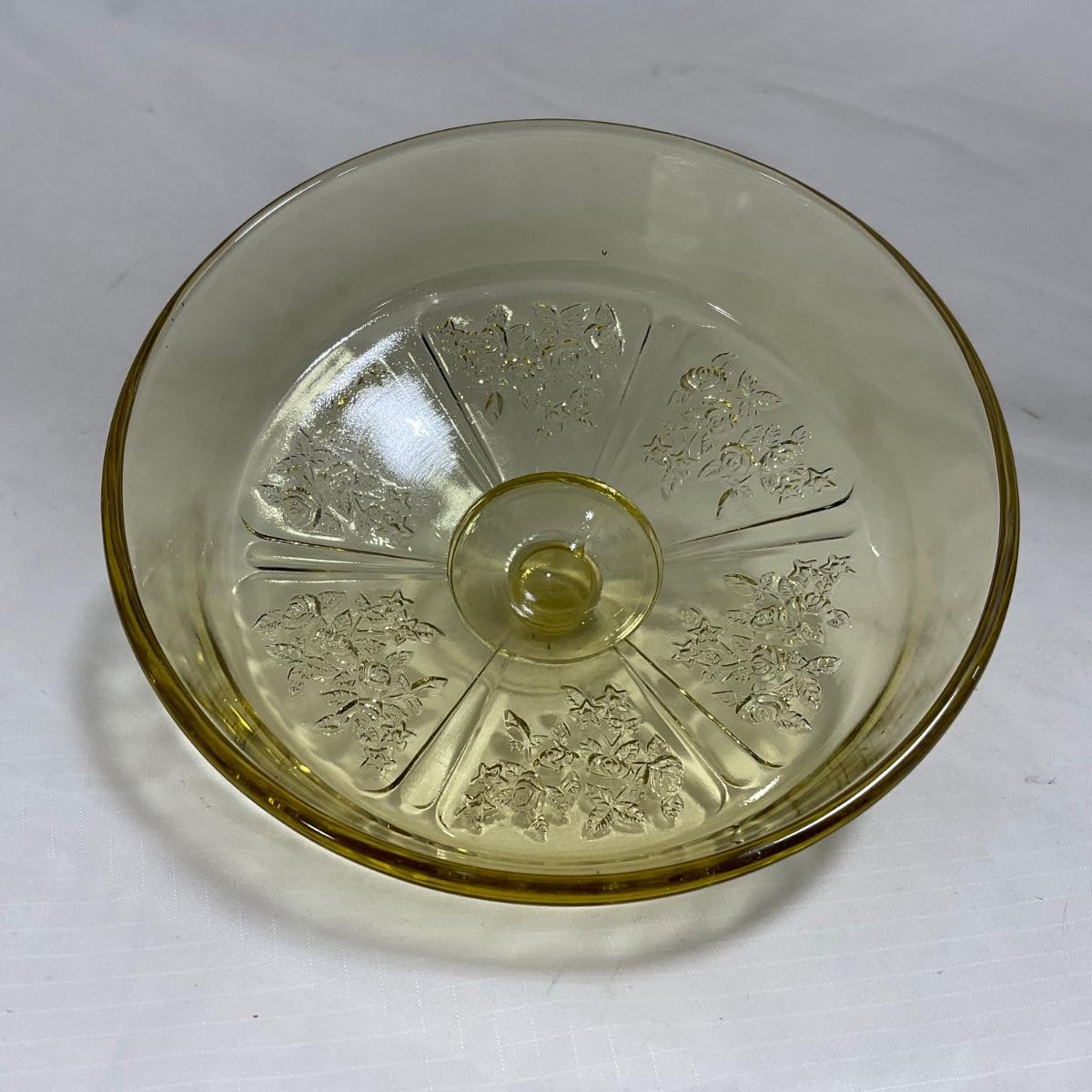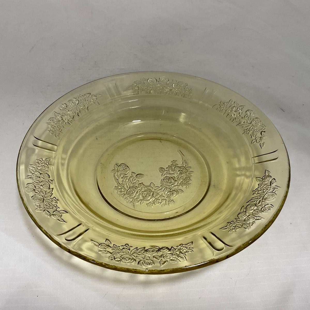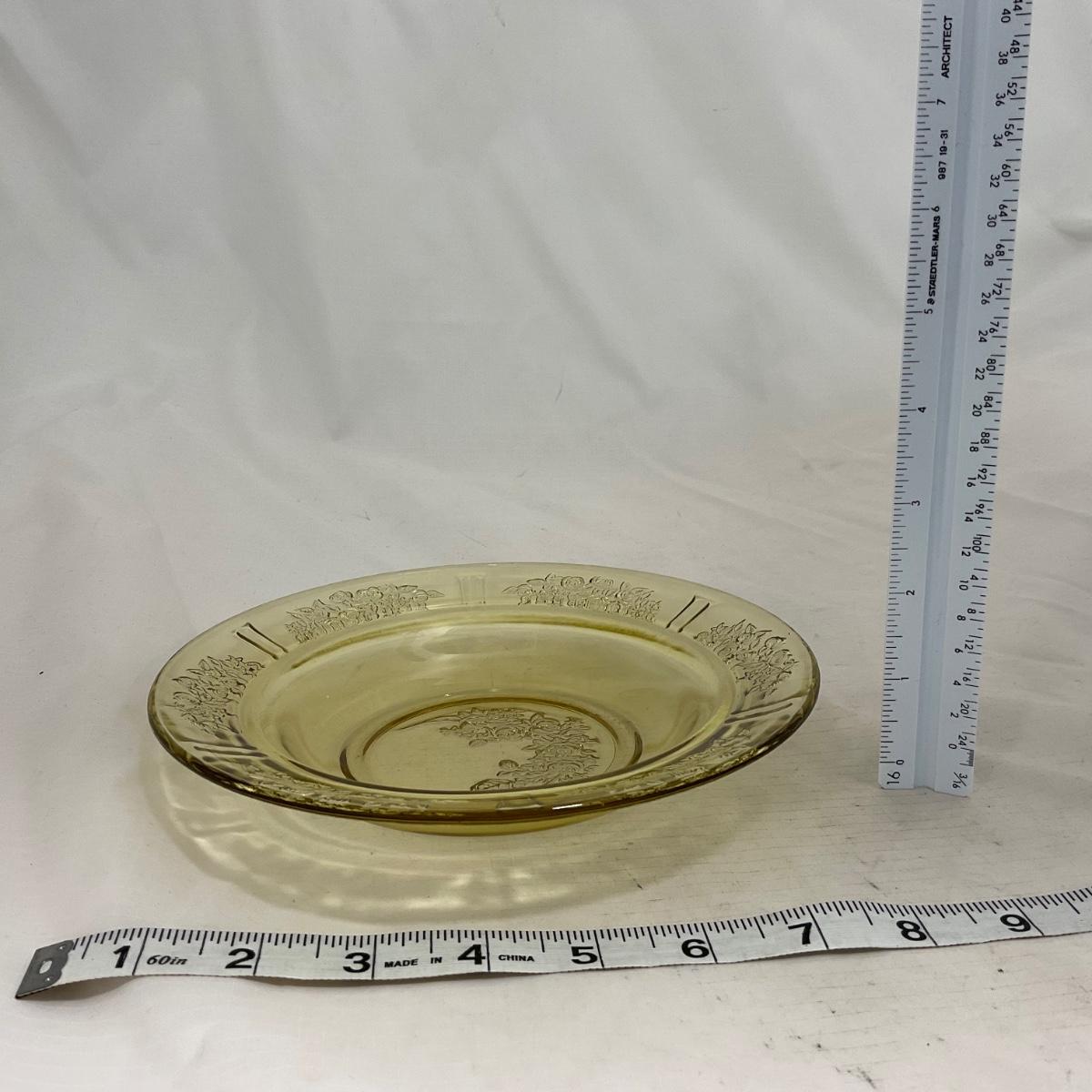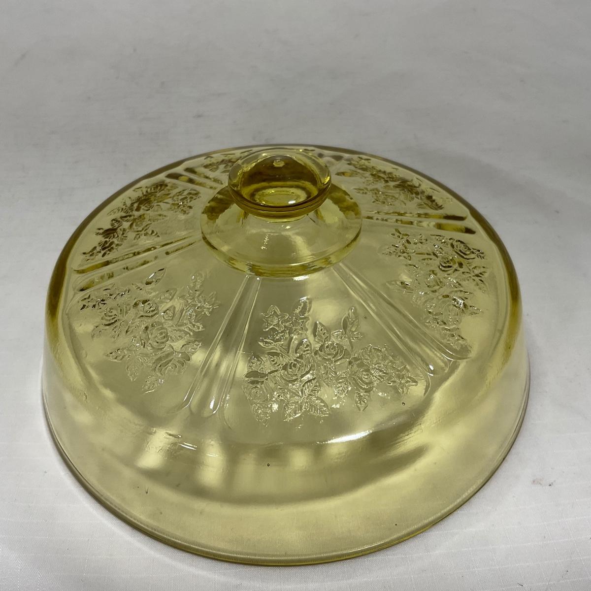 One dark yellow detailed covered butter dish. In beautiful shape and condition. Please see photos for details and condition. ::: Shipping is available on this lot. If you require shipping you must let us know at the close of the auction. We will coordinate with you after the item has been won. Shipping fees will include insurance up to or exceeding the value of all items being mailed. If you have any questions regarding this lot please contact the auctioneer either via this website, by direct email or by phone. PICK UP TIMES and other important information can be found in the TERMS and DESCRIPTION of the auction. Please take a look for pertinent information. Thanks!