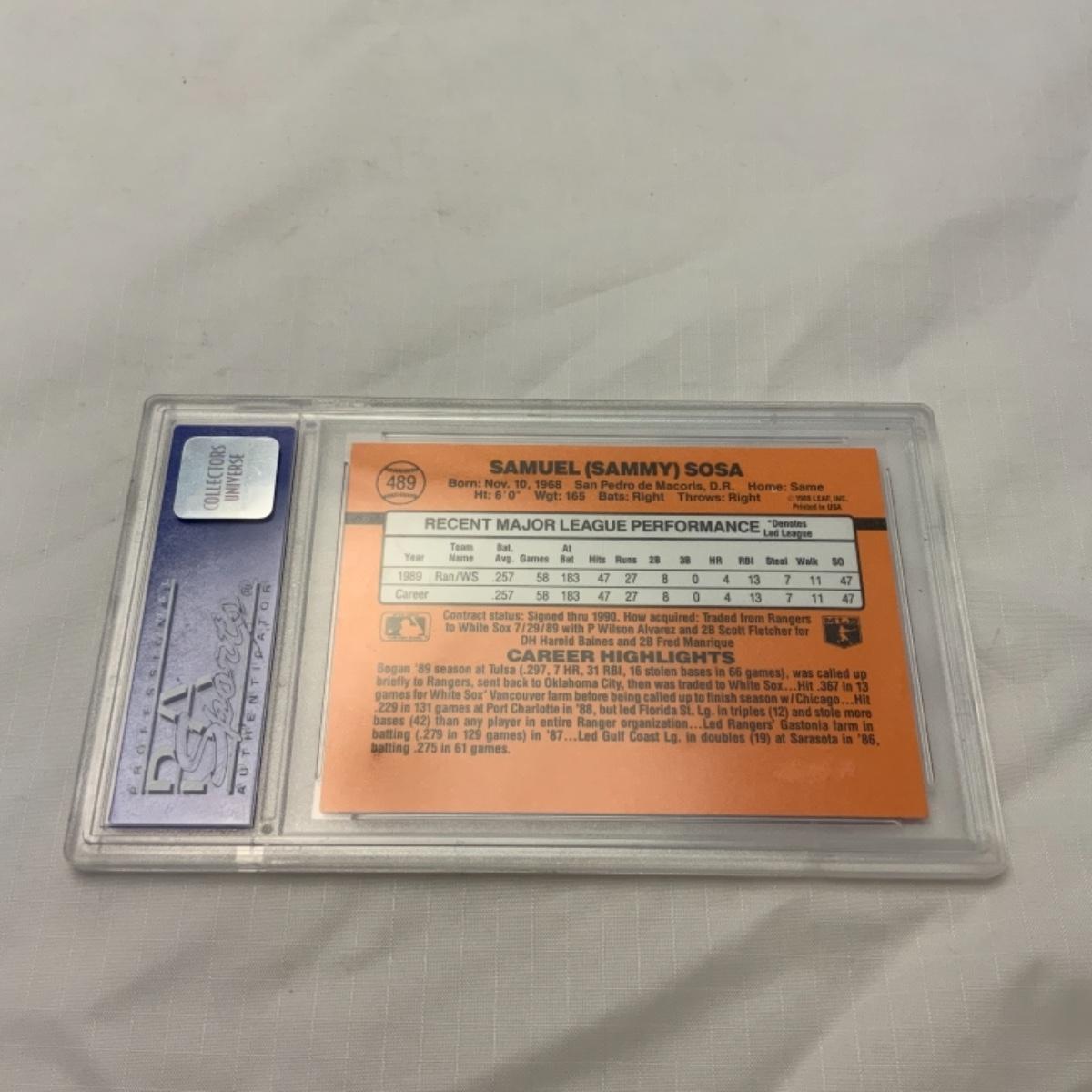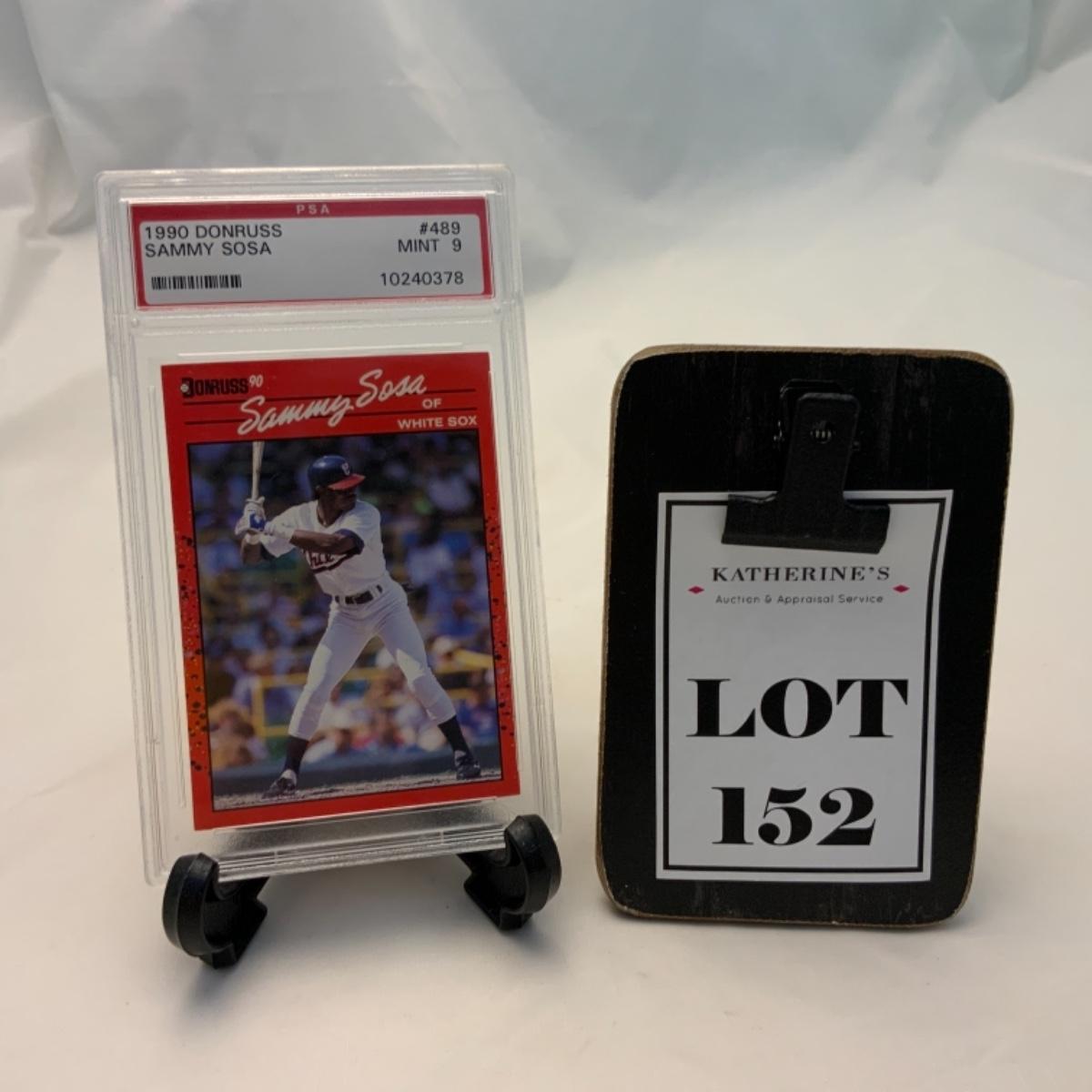 Graded Sammy Sosa Donruss Baseball Card #489 from the 1990 Series. Graded by PSA to MINT 9. Please see photos for details and condition. ::: Shipping is available on this lot. If you require shipping you must let us know at the close of the auction. We will coordinate with you after the item has been won. Shipping fees will include insurance up to or exceeding the value of all items being mailed. If you have any questions regarding this lot please contact the auctioneer either via this website, by direct email or by phone. PICK UP TIMES and other important information can be found in the TERMS and DESCRIPTION of the auction. Please take a look for pertinent information. Thanks!