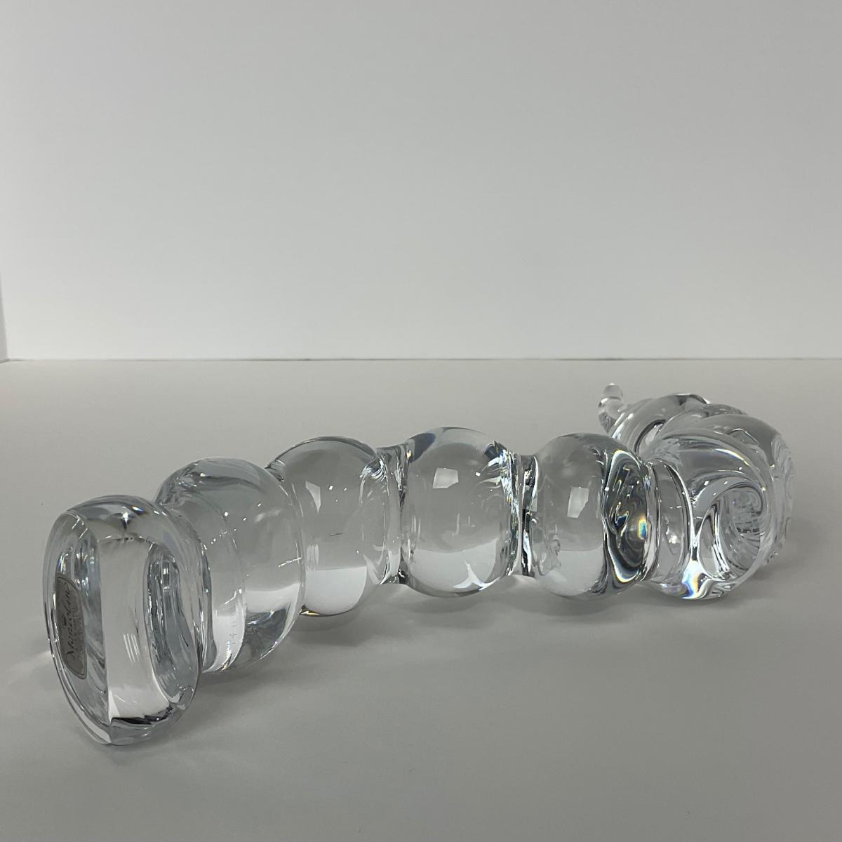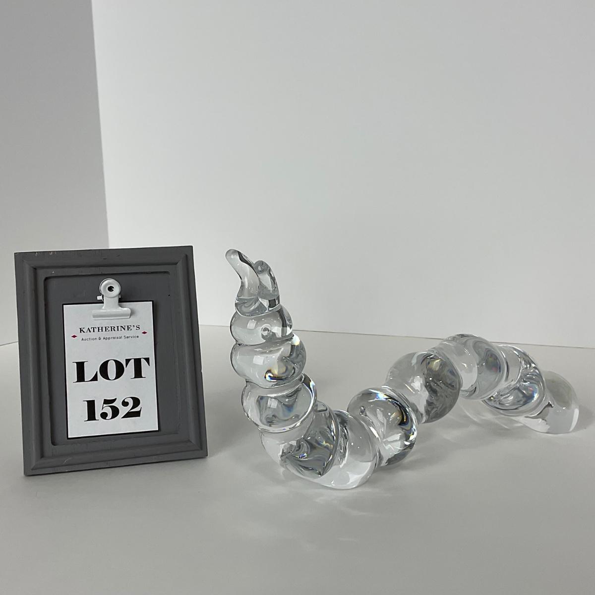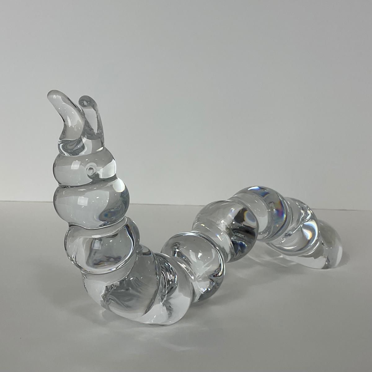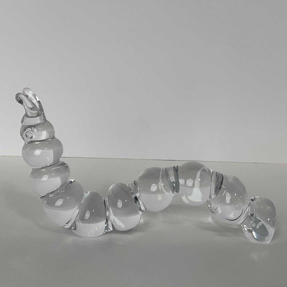 One clear crystal lead crystal caterpillar with sticker and signed. This piece has no damage, and appears to be in great shape with no visable chips, cracks, or broken pieces. 9 inches long by 5 inches tall. Please see photos for details and condition. Any condition statement is given as a courtesy to a client, is an opinion, and should not be treated as a statement of fact. Reference to condition written, oral or within a condition report shall not be regarded as a full account of condition and may not include all defects, alterations, or restorations. Absence of a condition report does not imply a lot is flawless or lacking imperfections or damage. Katherine’s Auction & Appraisal Service shall have no responsibility for any error or omission. Returns shall not be accepted on the basis of condition. ::: Shipping is available on this lot. If you require shipping you must let us know at the close of the auction. We will coordinate with you after the item has been won. Shipping fees will include insurance up to or exceeding the value of all items being mailed. If you have any questions regarding this lot please contact the auctioneer either via this website, by direct email or by phone. PICK UP TIMES and other important information can be found in the TERMS and DESCRIPTION of the auction. Please take a look for pertinent information. Thanks!