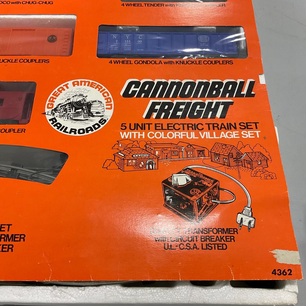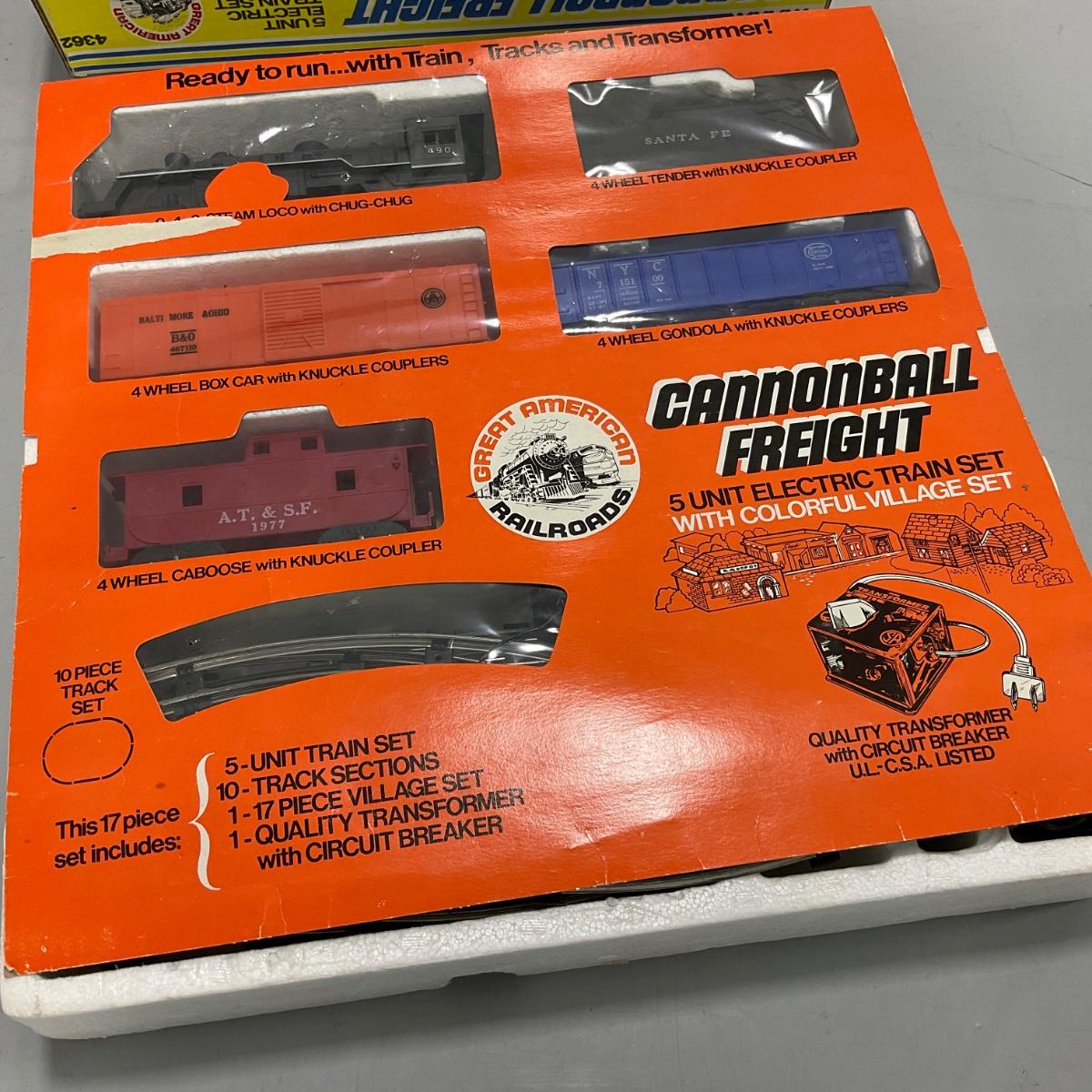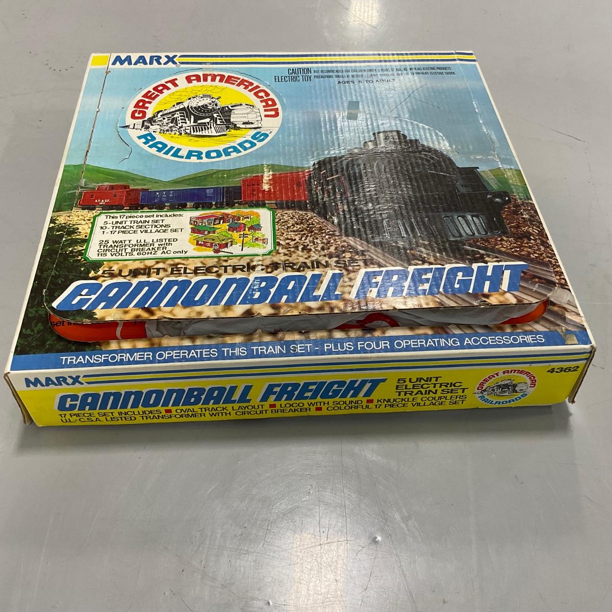 One vintage Marx Cannonball freight train set in box has been opened, unsure if set is complete. Please see photos for details and condition. ::: Shipping is available on this lot. If you require shipping you must let us know at the close of the auction. We will coordinate with you after the item has been won. Shipping fees will include insurance up to or exceeding the value of all items being mailed. If you have any questions regarding this lot please contact the auctioneer either via this website, by direct email or by phone. PICK UP TIMES and other important information can be found in the TERMS and DESCRIPTION of the auction. Please take a look for pertinent information. Thanks!