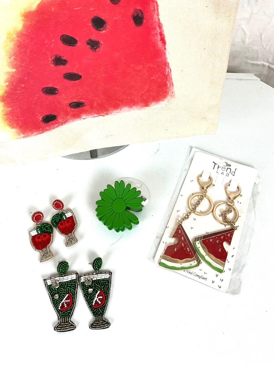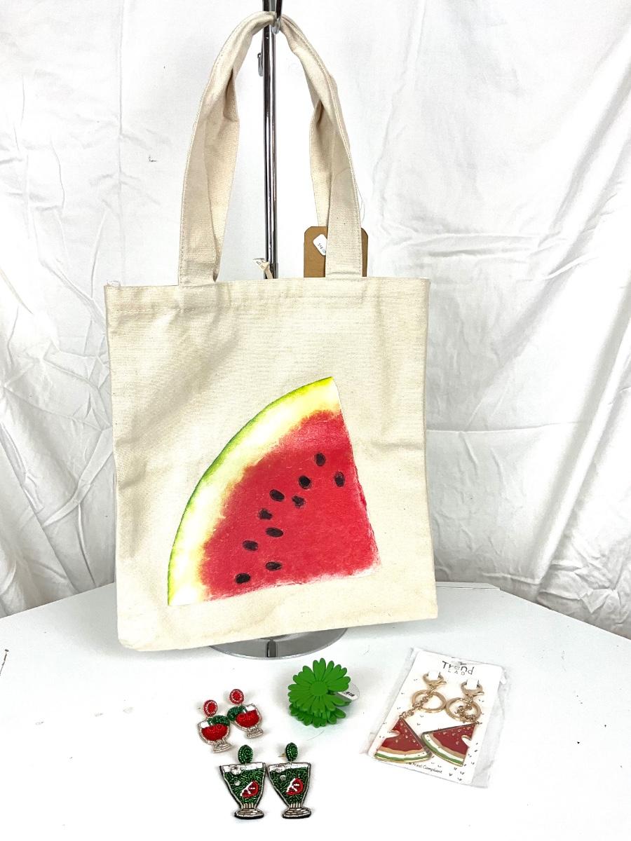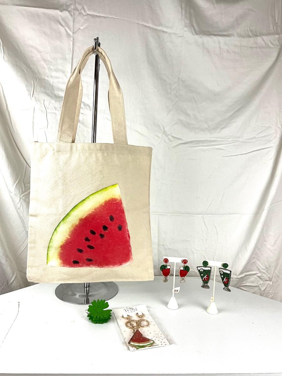 152 Watermelon Canvas Bag, Hair-clip, Two Pairs of Beaded Earrings, Watermelon Key Chains