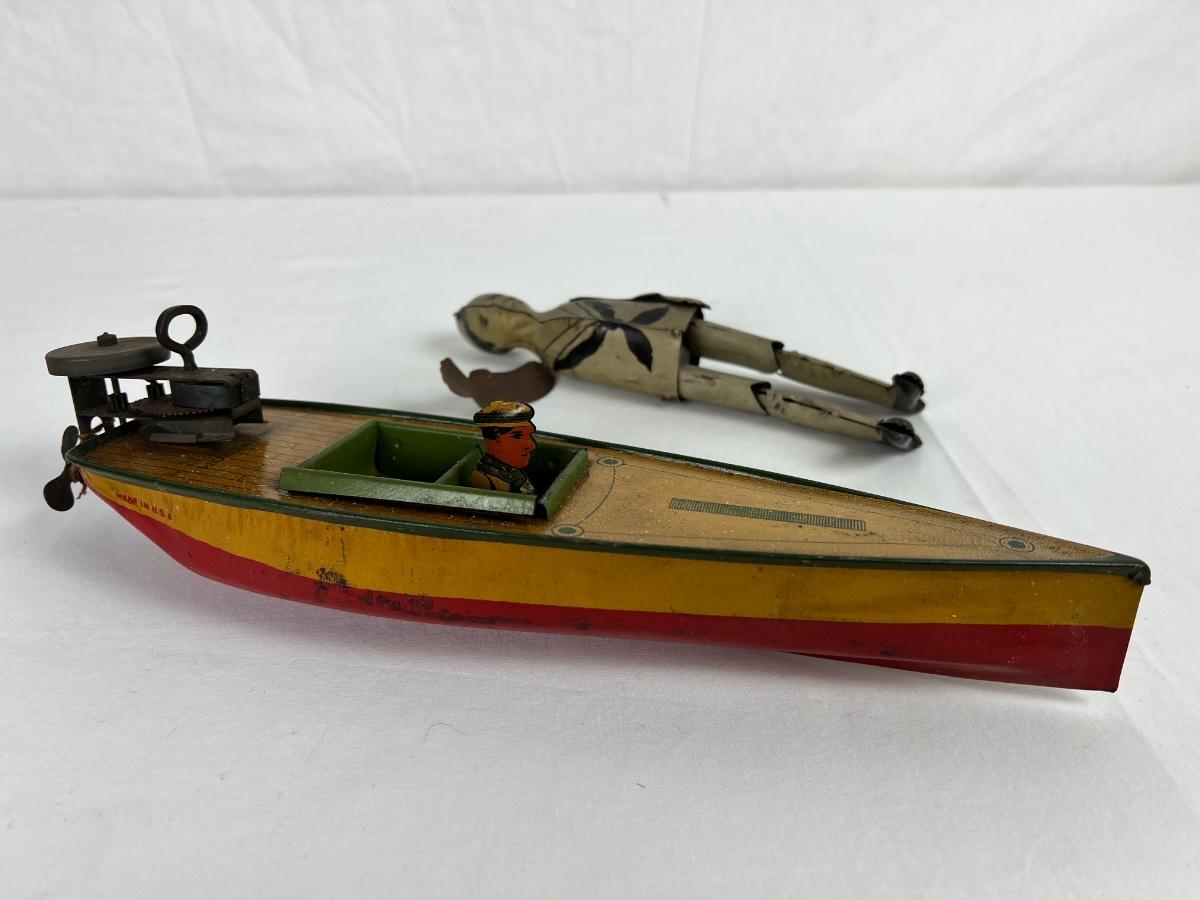 153  Antique LINDSTROM Tin Lithograph with Wind-up Motorboat Toy & Antique Ferdinand Strauss Corp.  Tin Sailor " Jackee the Hornpipe Dancer "