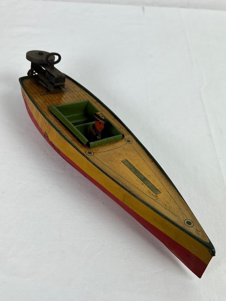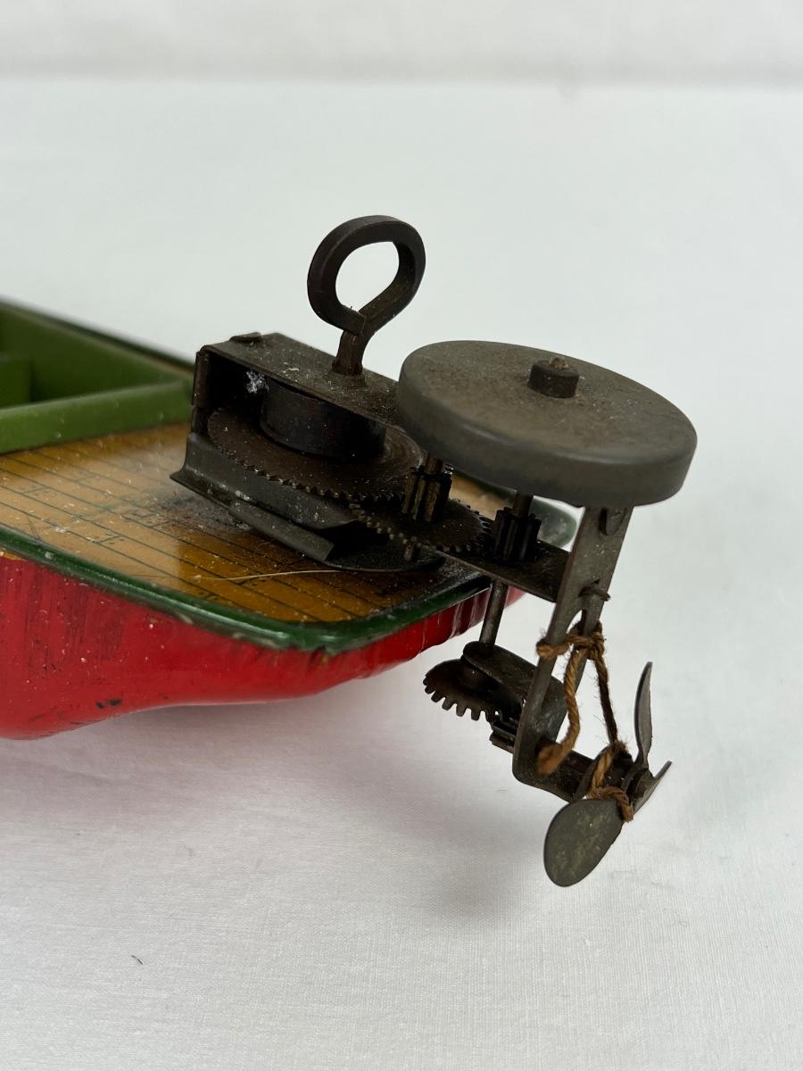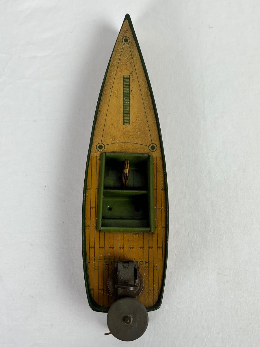 Antique LINDSTROM Tin Lithograph with Wind-up Motorboat Toy -
