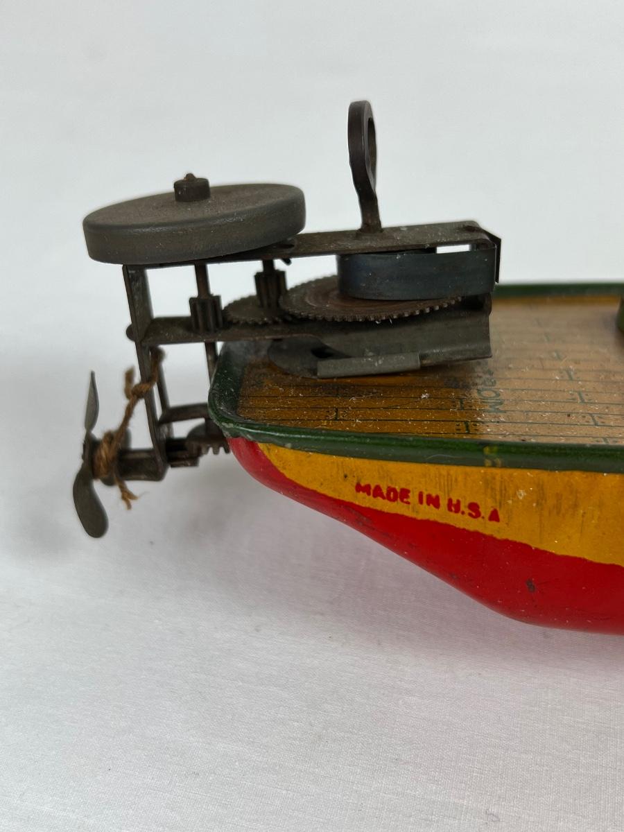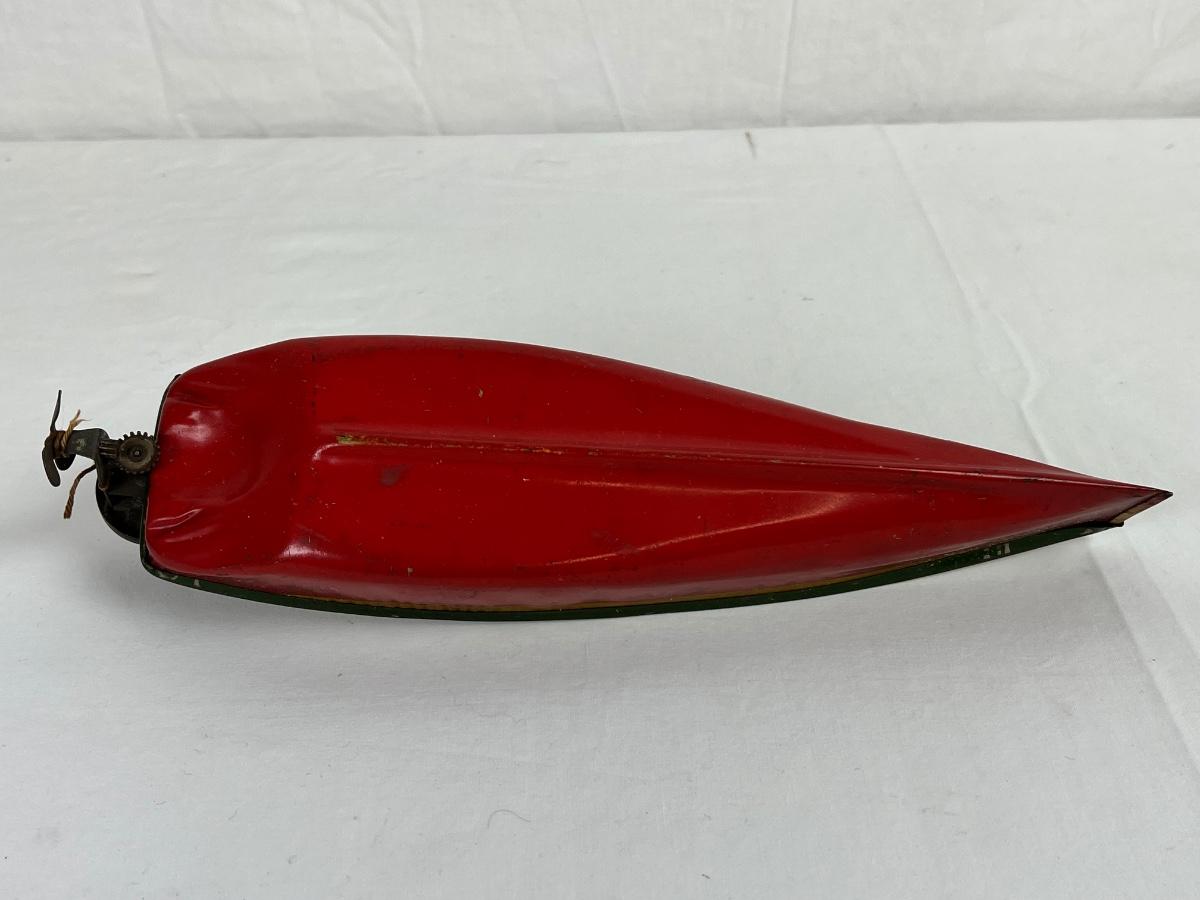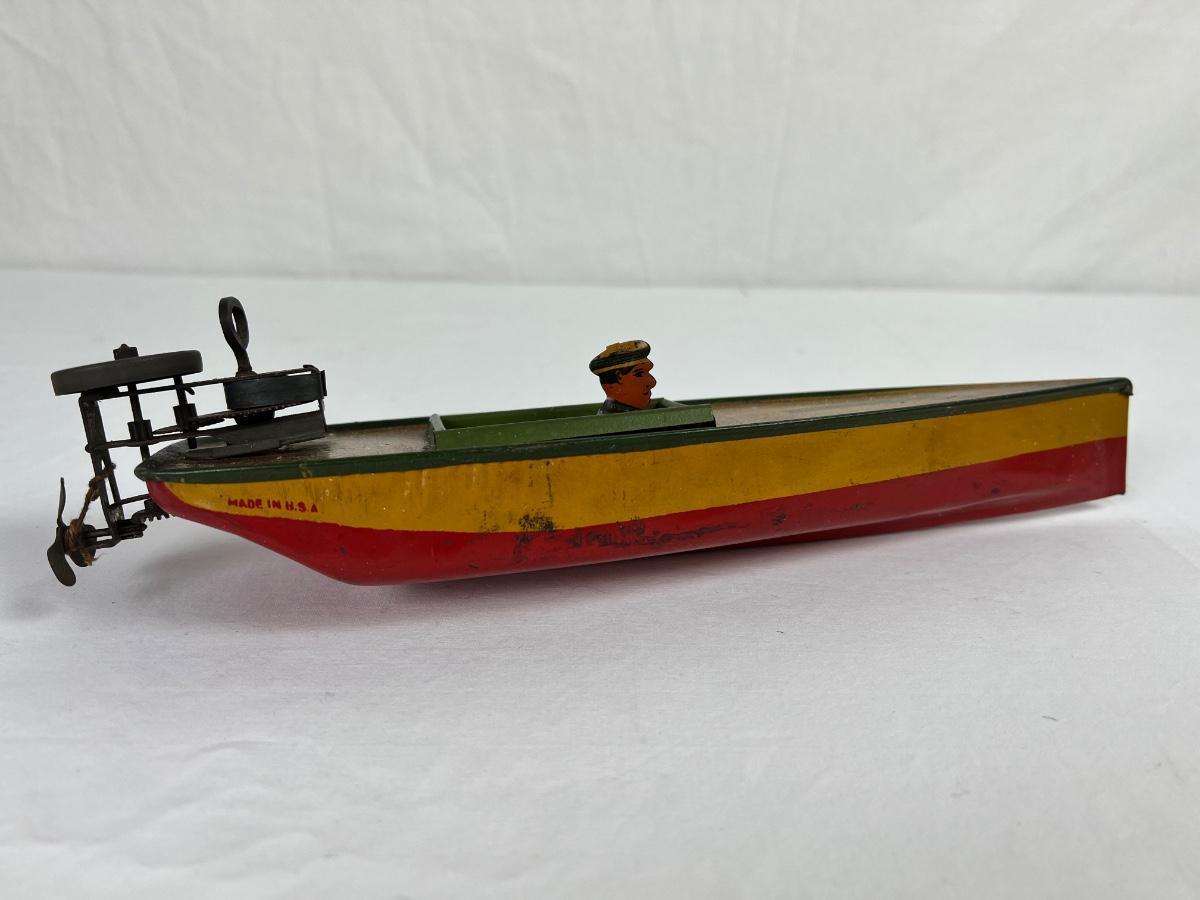 Antique LINDSTROM Tin Lithograph with Wind-up Motorboat Toy -