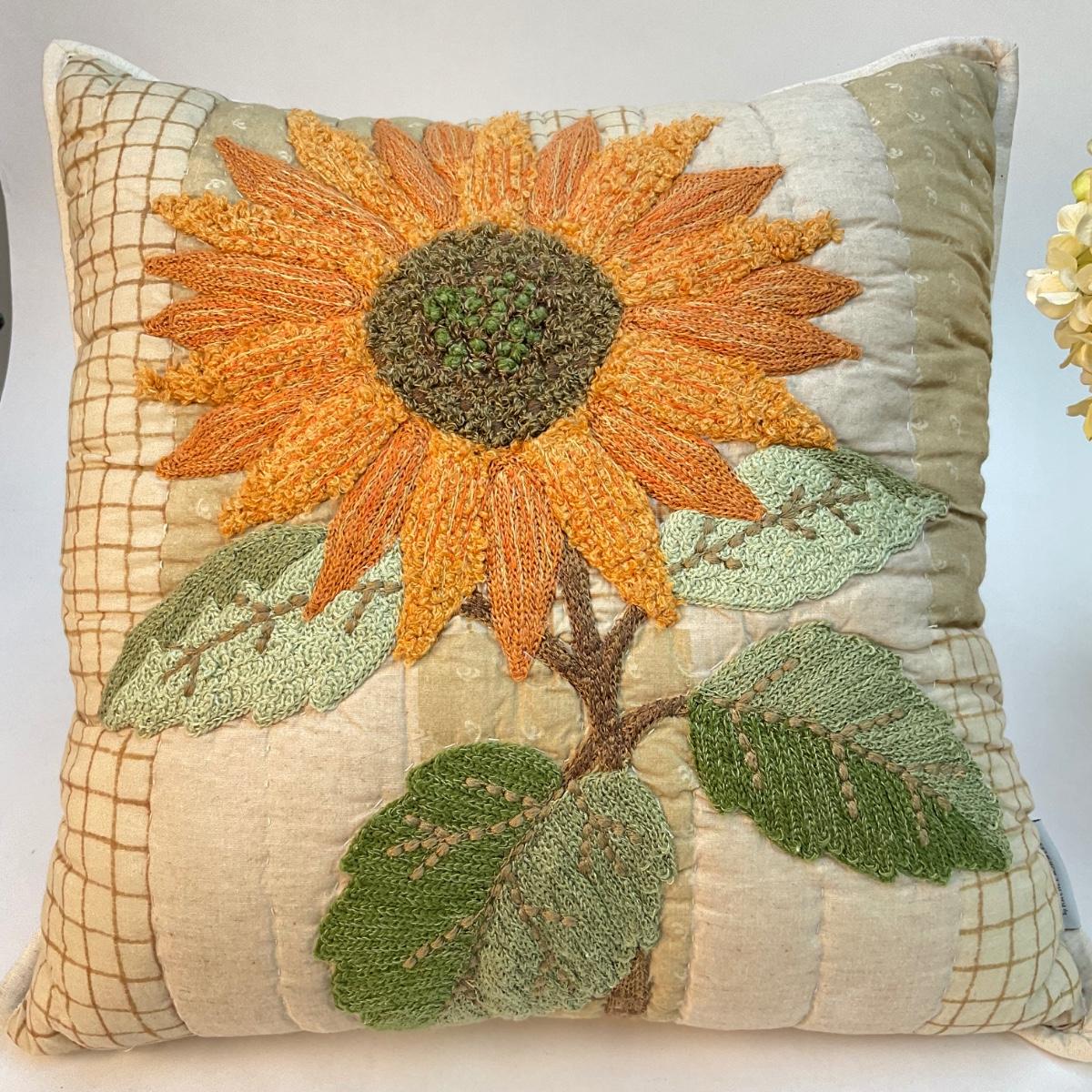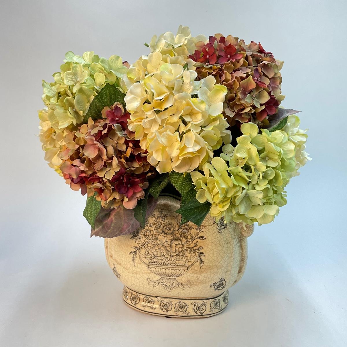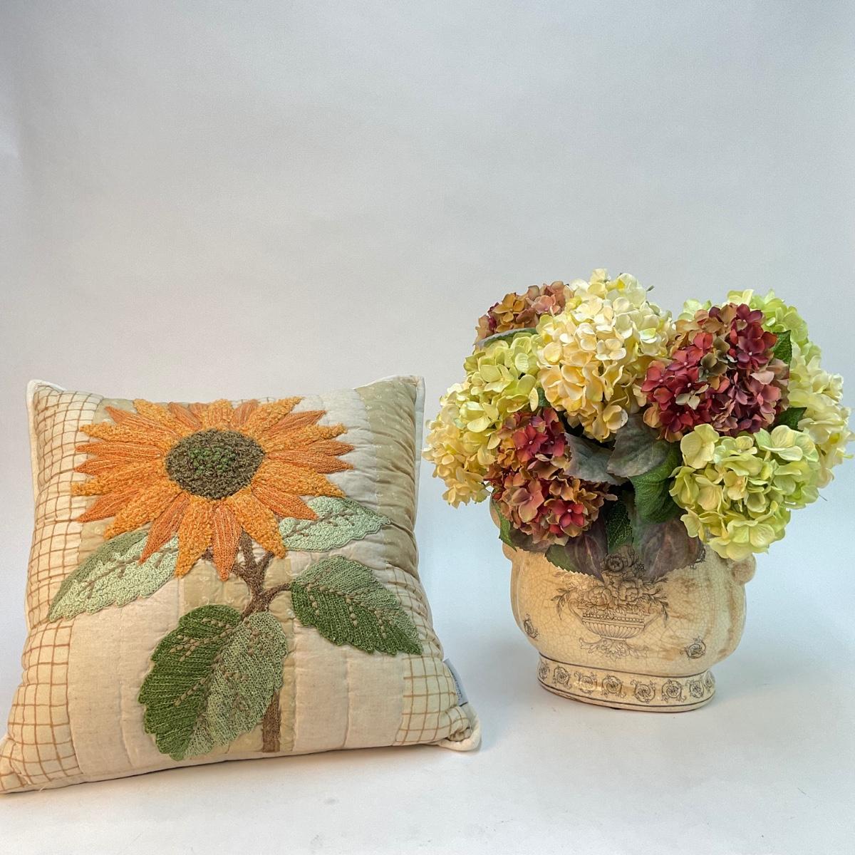 055 Hydrangea Floral In Ivory Crackle Galzed Vase with Sunflower Pillow