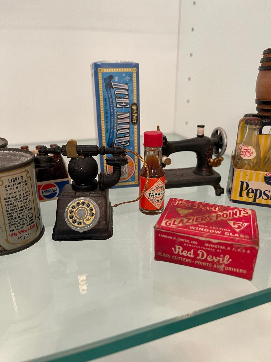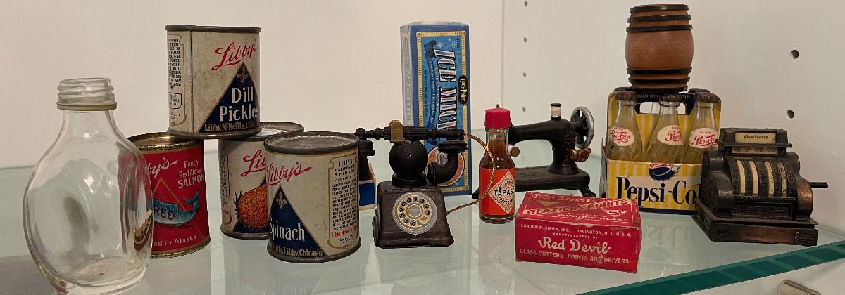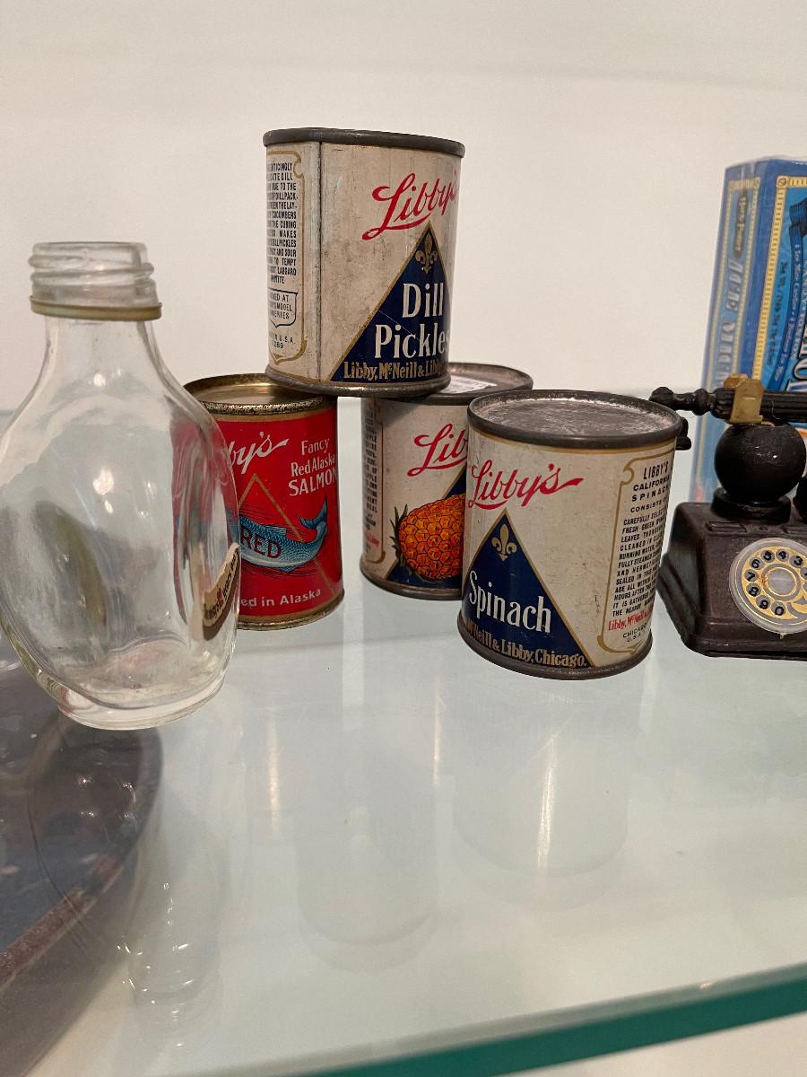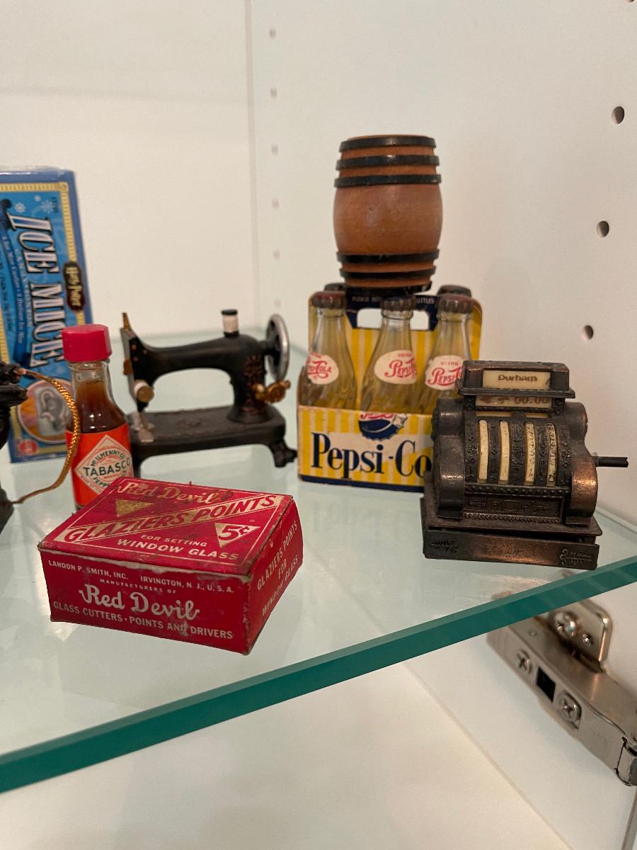 Some Antique food Items: Glass Pepsi, Cartons, Cash Register, Libby's'