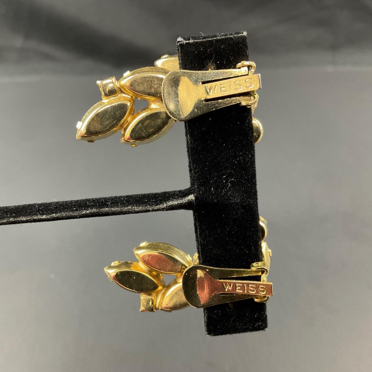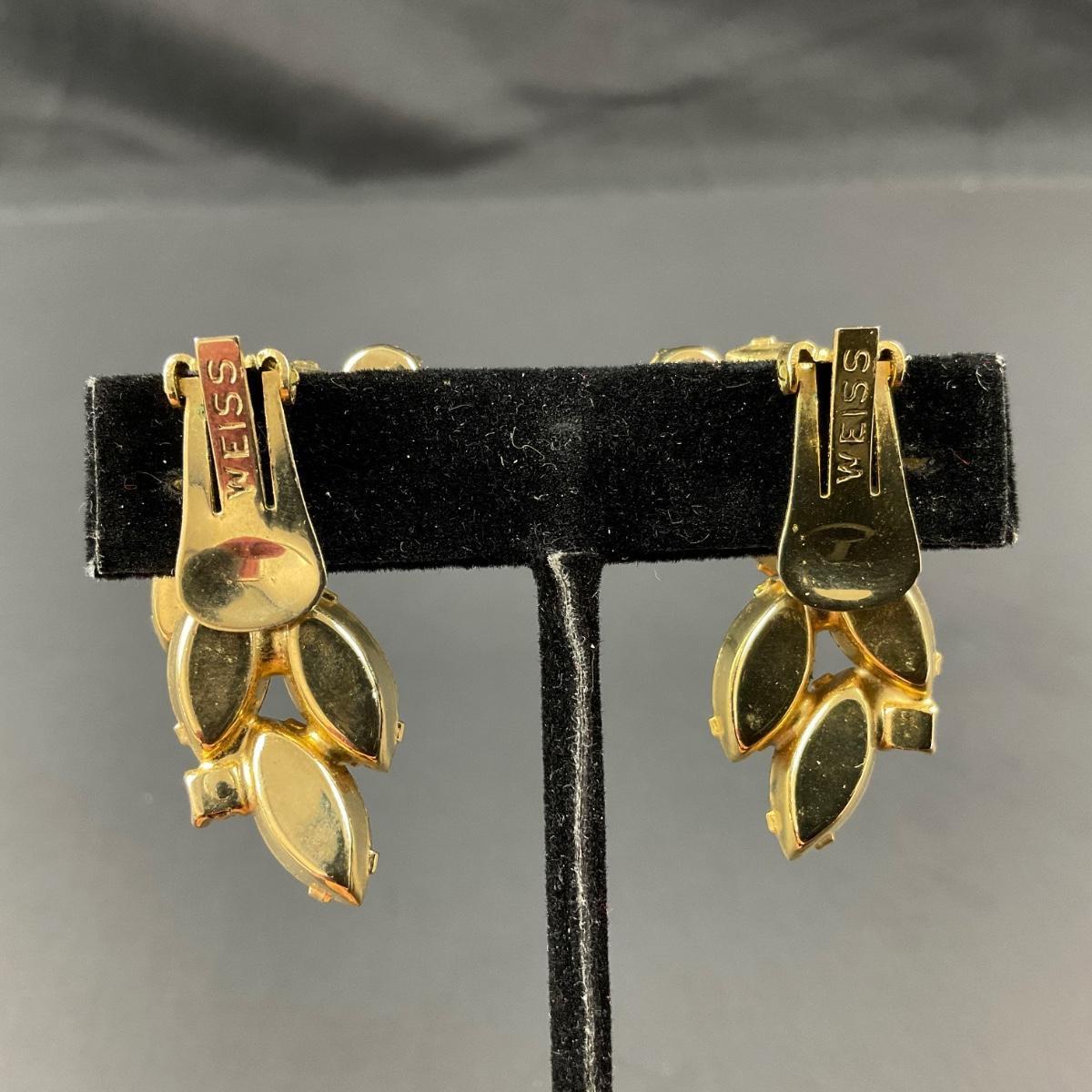 Three pieces of marked Weiss amber rhinestone jewelry including one necklace and clip earrings. Please see photos for details and condition. Any condition statement is given as a courtesy to a client, is an opinion, and should not be treated as a statement of fact. Reference to condition written, oral or within a condition report shall not be regarded as a full account of condition and may not include all defects, alterations, or restorations. Absence of a condition report does not imply a lot is flawless or lacking imperfections or damage. Katherine’s Auction & Appraisal Service shall have no responsibility for any error or omission. Returns shall not be accepted on the basis of condition. ::: Shipping is available on this lot. If you require shipping you must let us know at the close of the auction. We will coordinate with you after the item has been won. Shipping fees will include insurance up to or exceeding the value of all items being mailed. If you have any questions regarding this lot please contact the auctioneer either via this website, by direct email or by phone. PICK UP TIMES and other important information can be found in the TERMS and DESCRIPTION of the auction. Please take a look for pertinent information. Thanks!