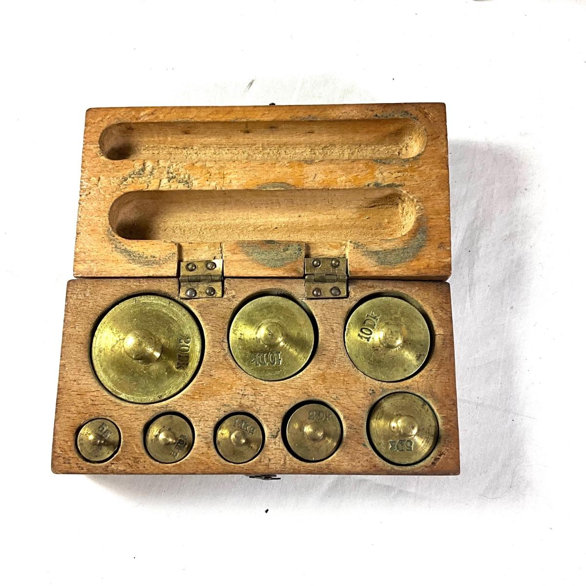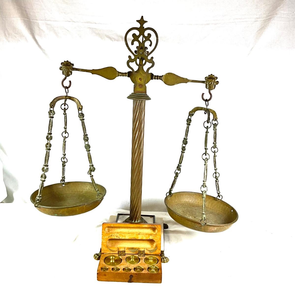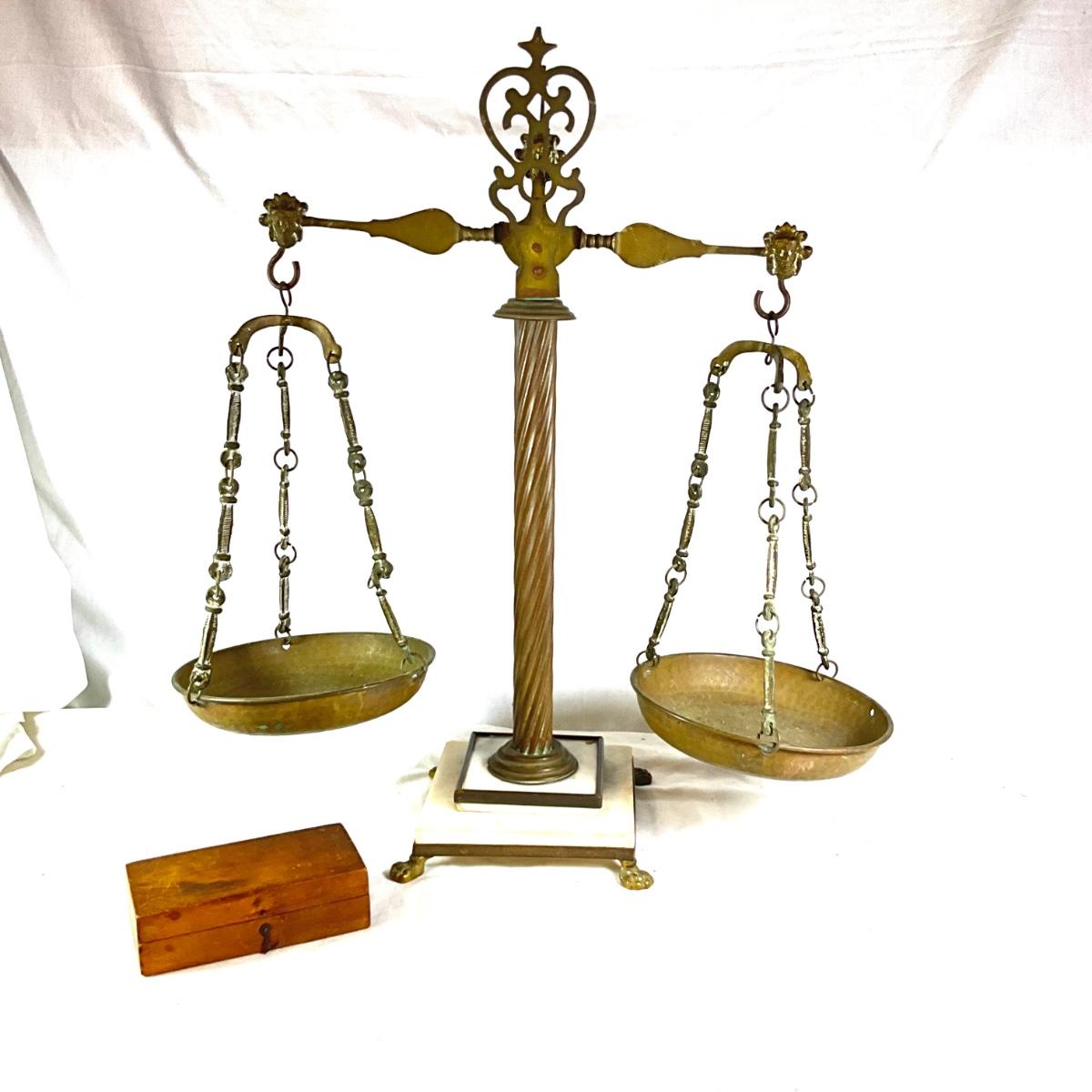 1531 Vintage Brass Balance Scale on Footed Marble Base with Brass Weight Set