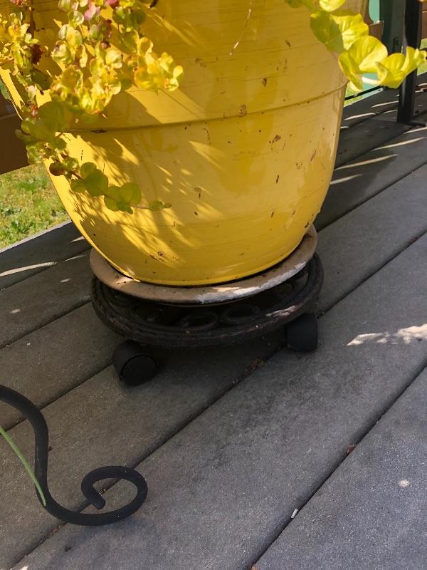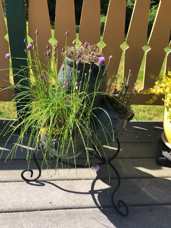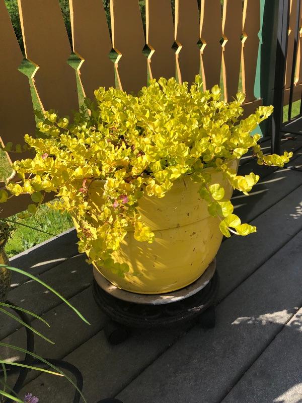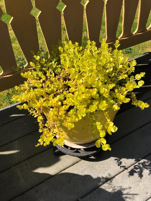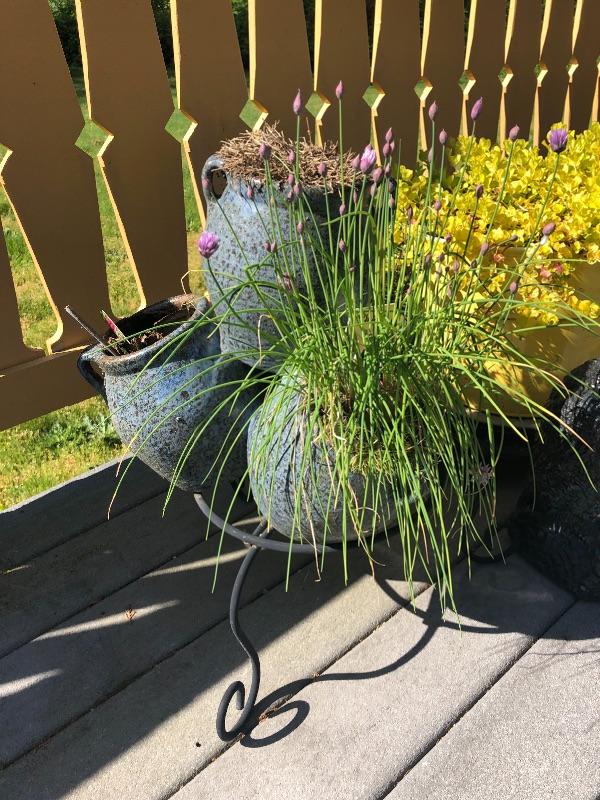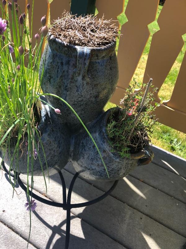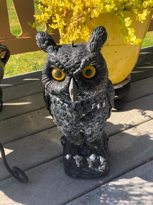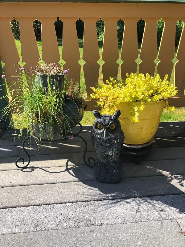 Festive Planters and Owl, plants included. Largest pot stands 23 inches tall, smaller is 16 inches and owl is 16 inches