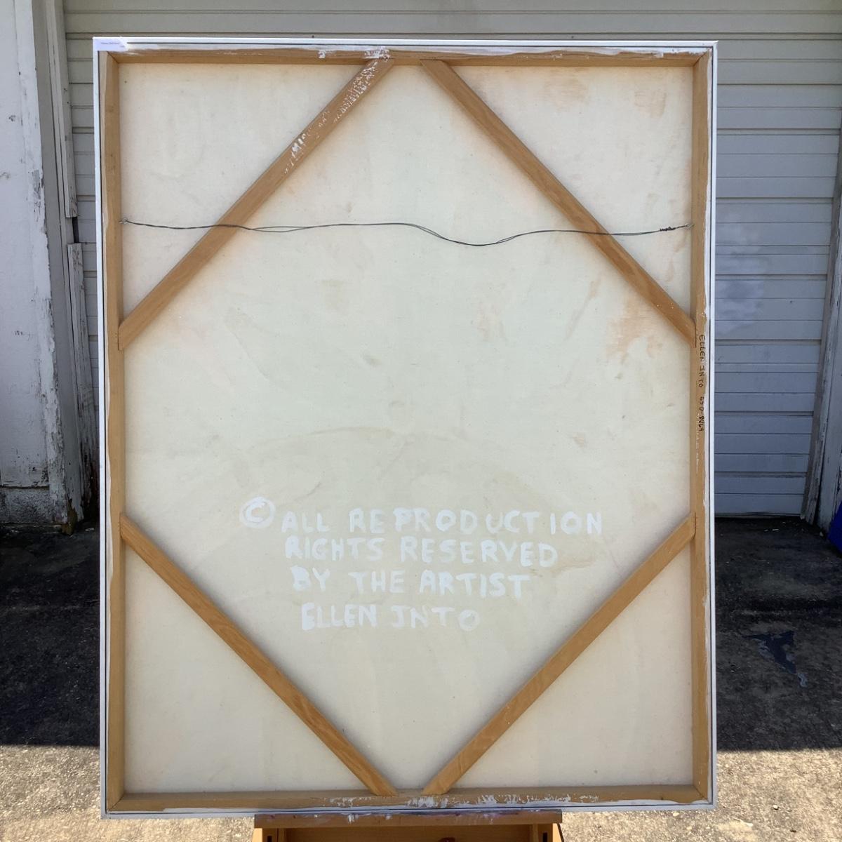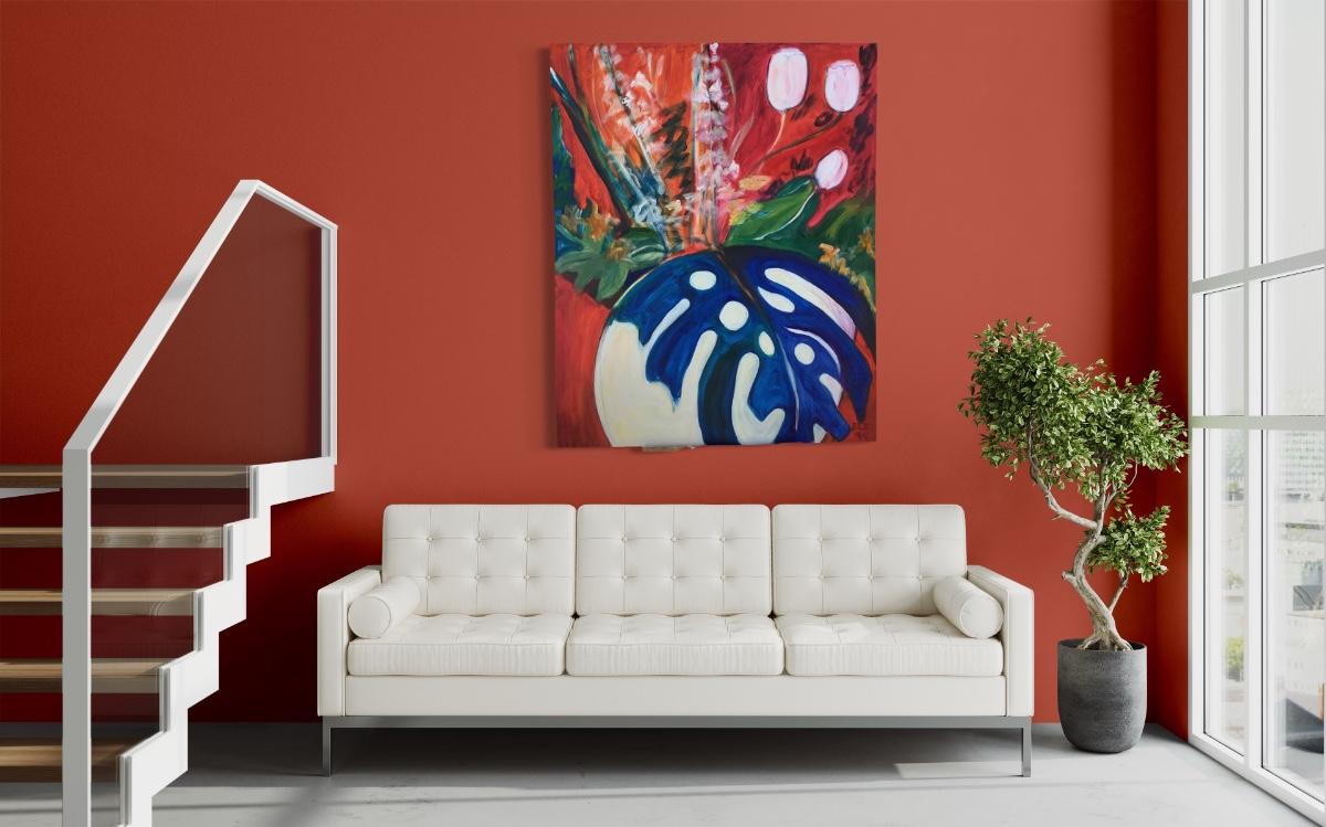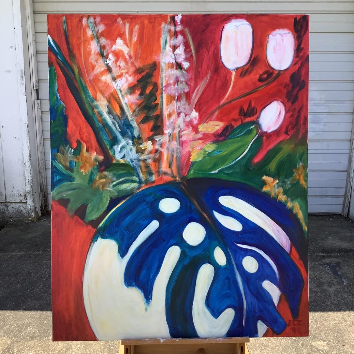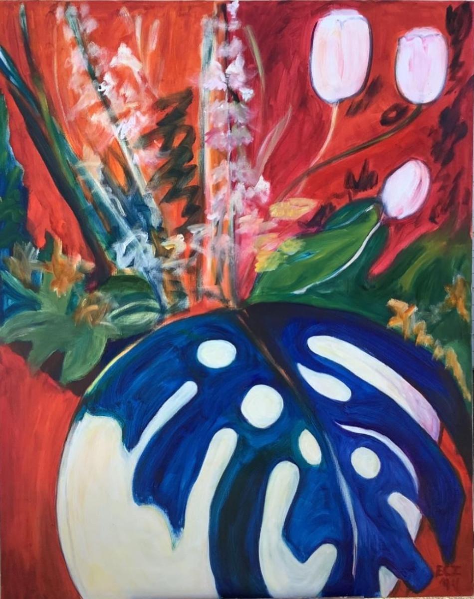 154 Monstera Leaf w/Tulips 1994 Oil on Canvas by Ellen Into