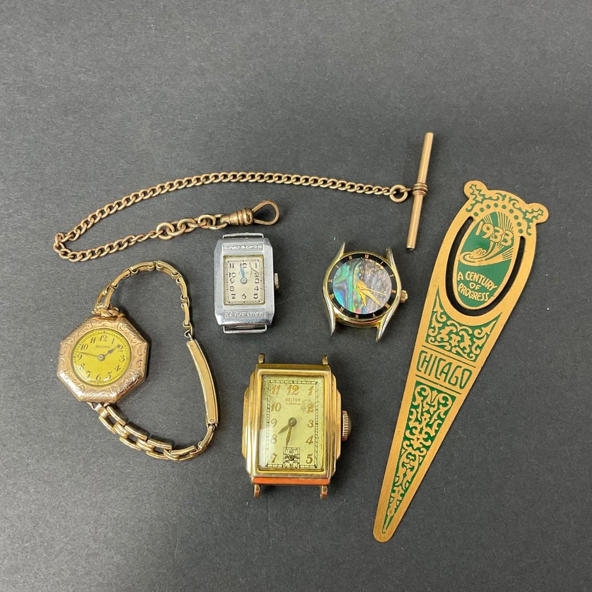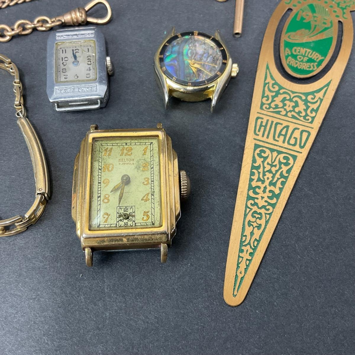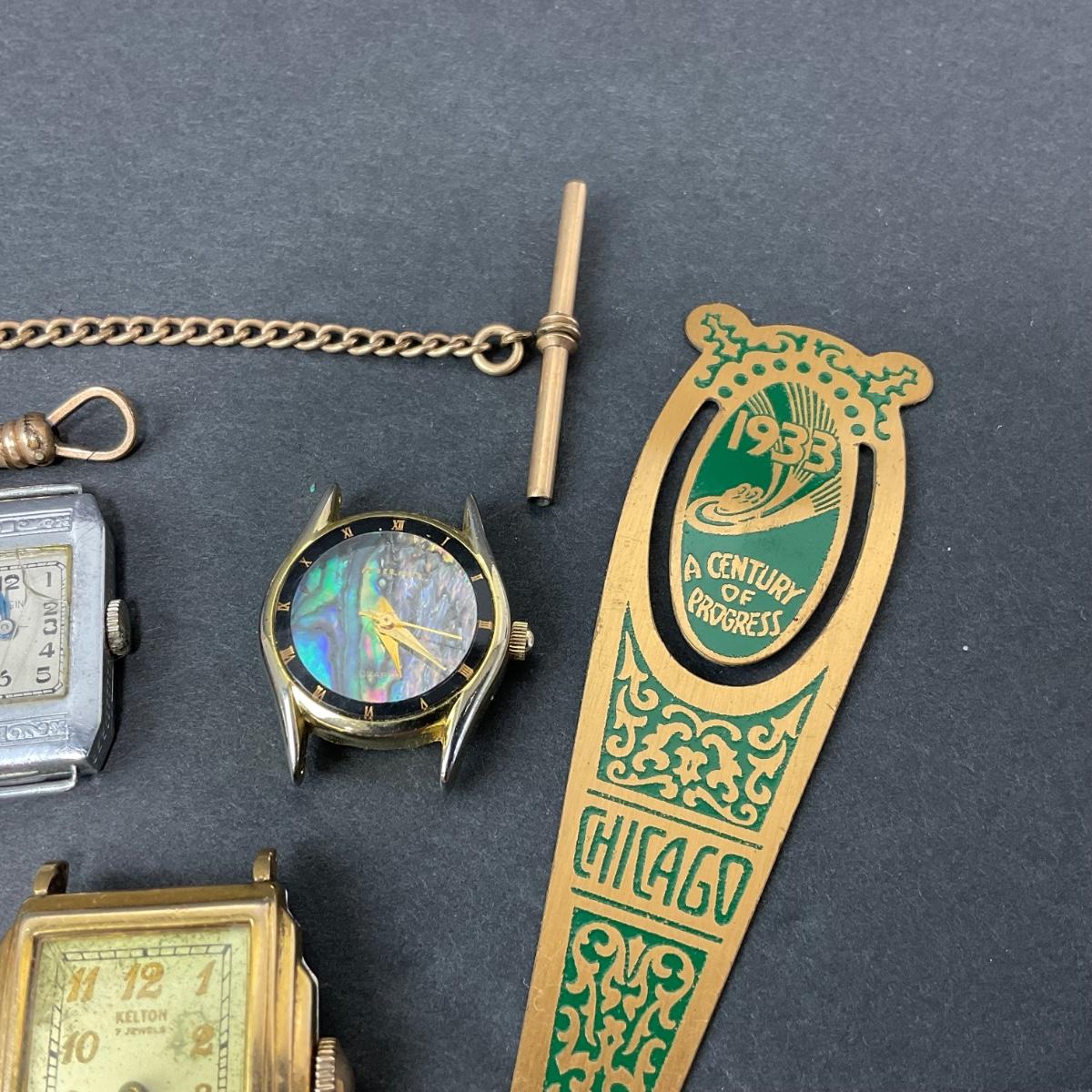 One assorted lot of watch parts and pieces. These are untested and unknown if they are in working order. There is also a fun little metal bookmark. Please see photos for details and condition. Any condition statement is given as a courtesy to a client, is an opinion, and should not be treated as a statement of fact. Reference to condition written, oral or within a condition report shall not be regarded as a full account of condition and may not include all defects, alterations, or restorations. Absence of a condition report does not imply a lot is flawless or lacking imperfections or damage. Katherine’s Auction & Appraisal Service shall have no responsibility for any error or omission. Returns shall not be accepted on the basis of condition. ::: Shipping is available on this lot. If you require shipping you must let us know at the close of the auction. We will coordinate with you after the item has been won. Shipping fees will include insurance up to or exceeding the value of all items being mailed. If you have any questions regarding this lot please contact the auctioneer either via this website, by direct email or by phone. PICK UP TIMES and other important information can be found in the TERMS and DESCRIPTION of the auction. Please take a look for pertinent information. Thanks!